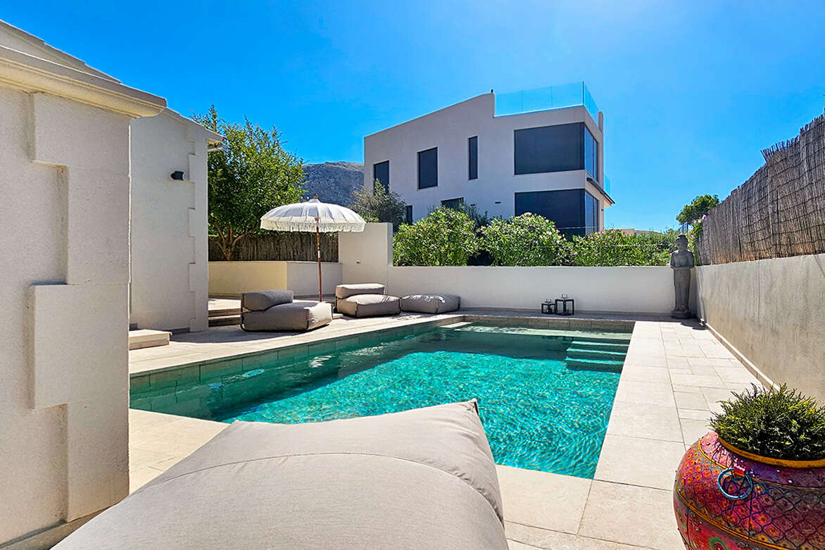 La zona exterior impresiona con un jardín de estilo mediterráneo, cuidadas terrazas, una acogedora zona de piscina con tumbonas y varias zonas de descanso.