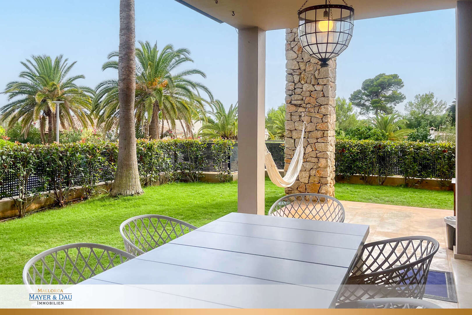 Nada más entrar en el piso a través de la imponente puerta de entrada, se dará cuenta de la espaciosa planta. La planta baja consta de una moderna cocina amueblada y equipada con vistas al jardín y un dormitorio doble con baño en-suite contiguo. Un luminoso salón/comedor con ventanales de suelo a techo crea una transición directa a la terraza cubierta y al jardín vecino. Varias zonas de estar con fantásticas vistas a las palmeras invitan a pasar acogedoras veladas al aire libre.