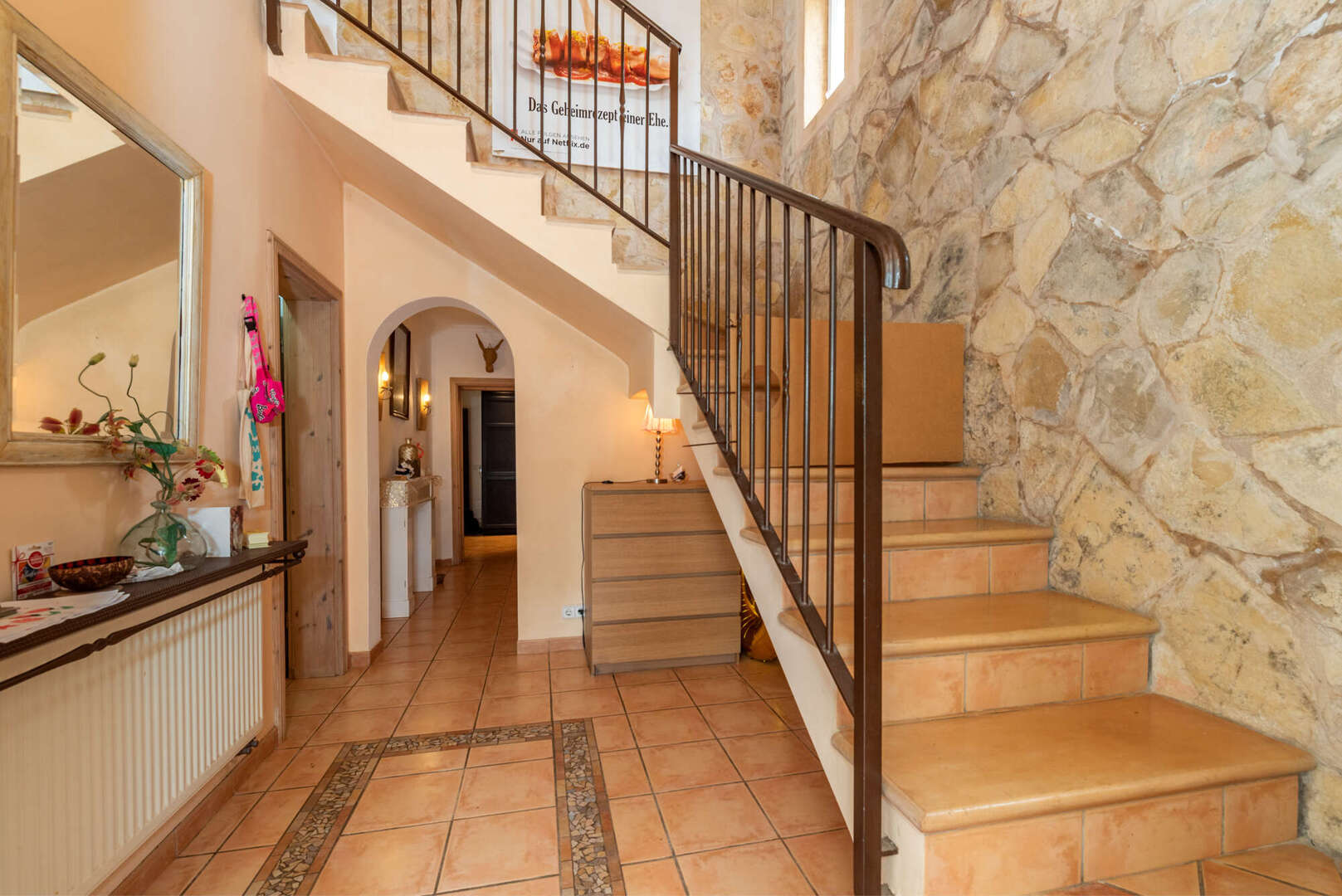 La casa principal, de unos 155 m² de superficie habitable, se distribuye en dos plantas y se caracteriza por una arquitectura tradicional con una fachada de piedra y una impresionante altura de techo de unos 8 m en la zona de entrada. Estos elementos característicos constituyen la base perfecta para una modernización elegante en un estilo mediterráneo-moderno.