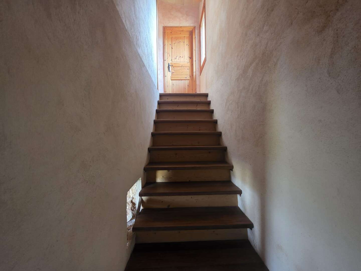 Una escalera de madera conduce a la planta superior con tres dormitorios. El dormitorio principal ofrece acceso directo a la terraza e impresionantes vistas hasta la sierra de Tramuntana. Un cuarto de baño está a la espera de ser terminado a su gusto - aquí usted puede añadir sus propios toques personales.