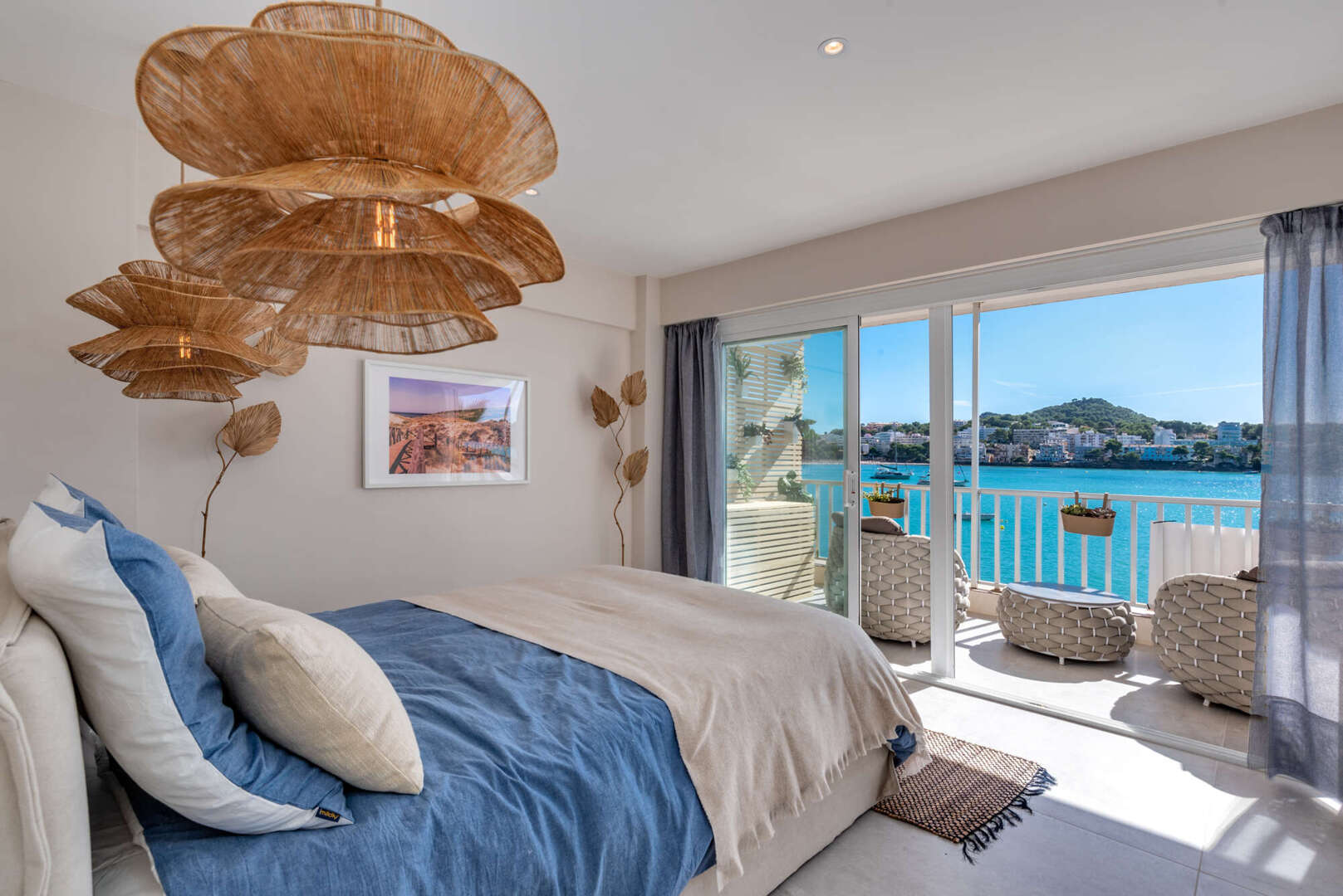 El frente continuo de ventanas abre el espacio vital a la bahía de Santa Ponsa y va acompañado de un amplio balcón que se extiende a lo largo de toda la fachada. Aquí podrá disfrutar del sol, el mar y la tranquilidad absoluta en un ambiente privado.