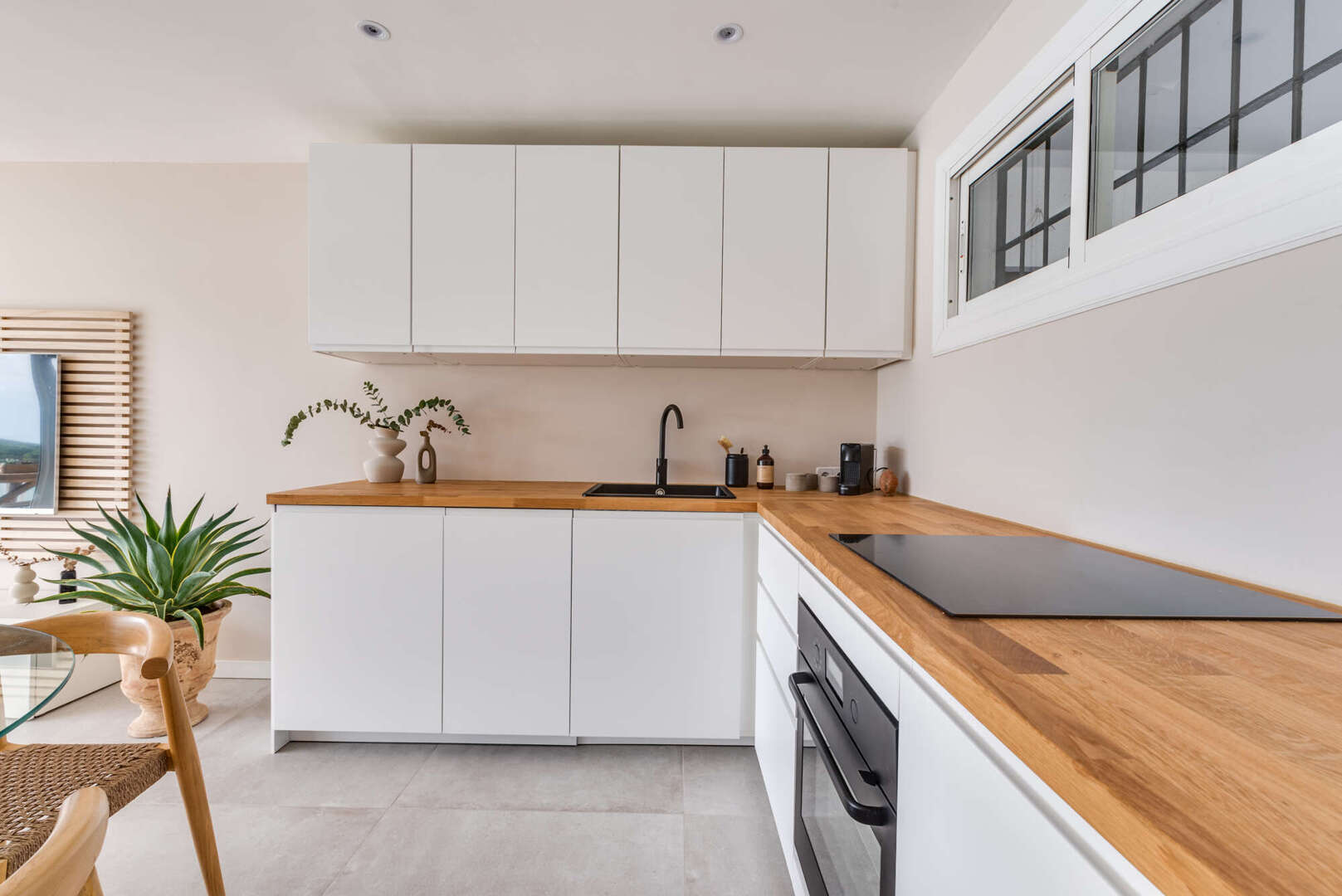 El piso cuenta con dos dormitorios luminosos, un elegante cuarto de baño con ducha a ras de suelo y una cocina abierta y moderna que se integra armoniosamente en la zona de estar y comedor. El plano bien pensado y el mobiliario de alta calidad crean un ambiente mediterráneo lleno de ligereza y estilo.
