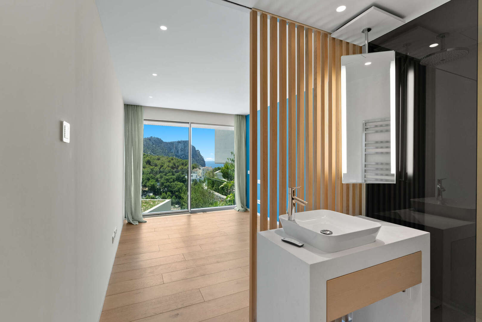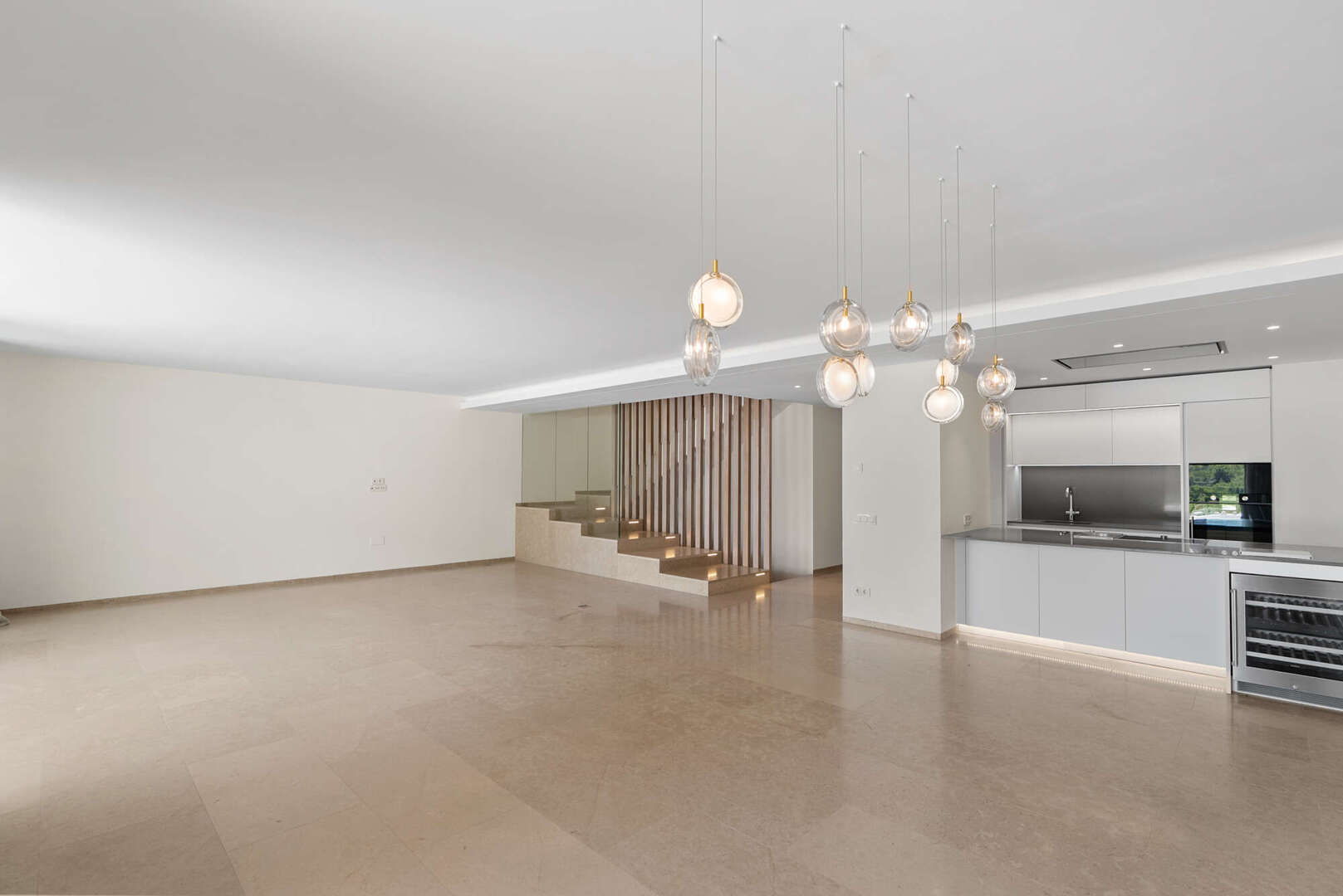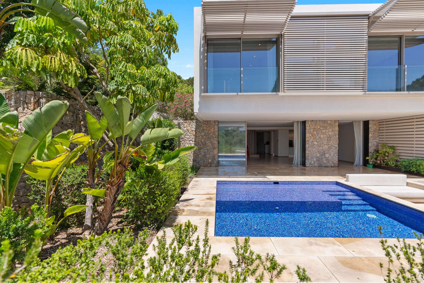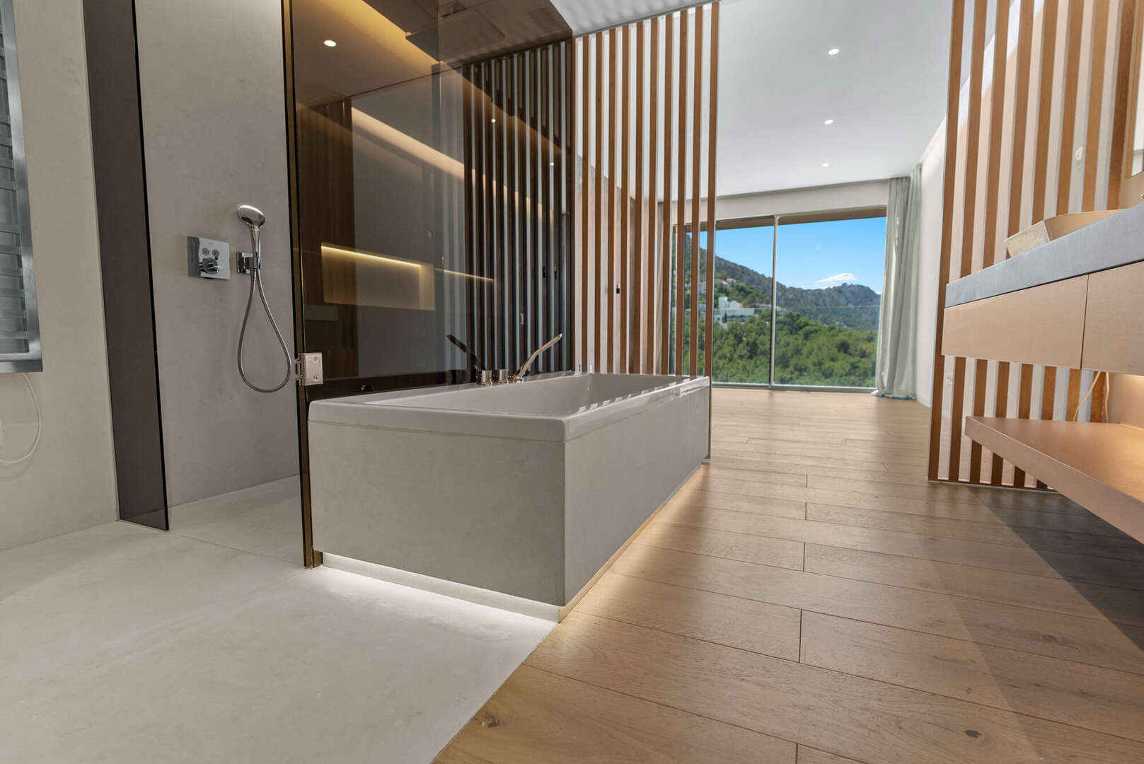 En la planta baja, encontrará un amplio salón-comedor con una cocina de lujo abierta (electrodomésticos Gaggenau), un aseo de invitados y un patio de diseño encantador. El acceso directo conduce a la gran terraza cubierta (41 m²), a la piscina privada (20 m²) y a otra zona de estar con vistas panorámicas al mar y a la montaña: su oasis personal de paz.