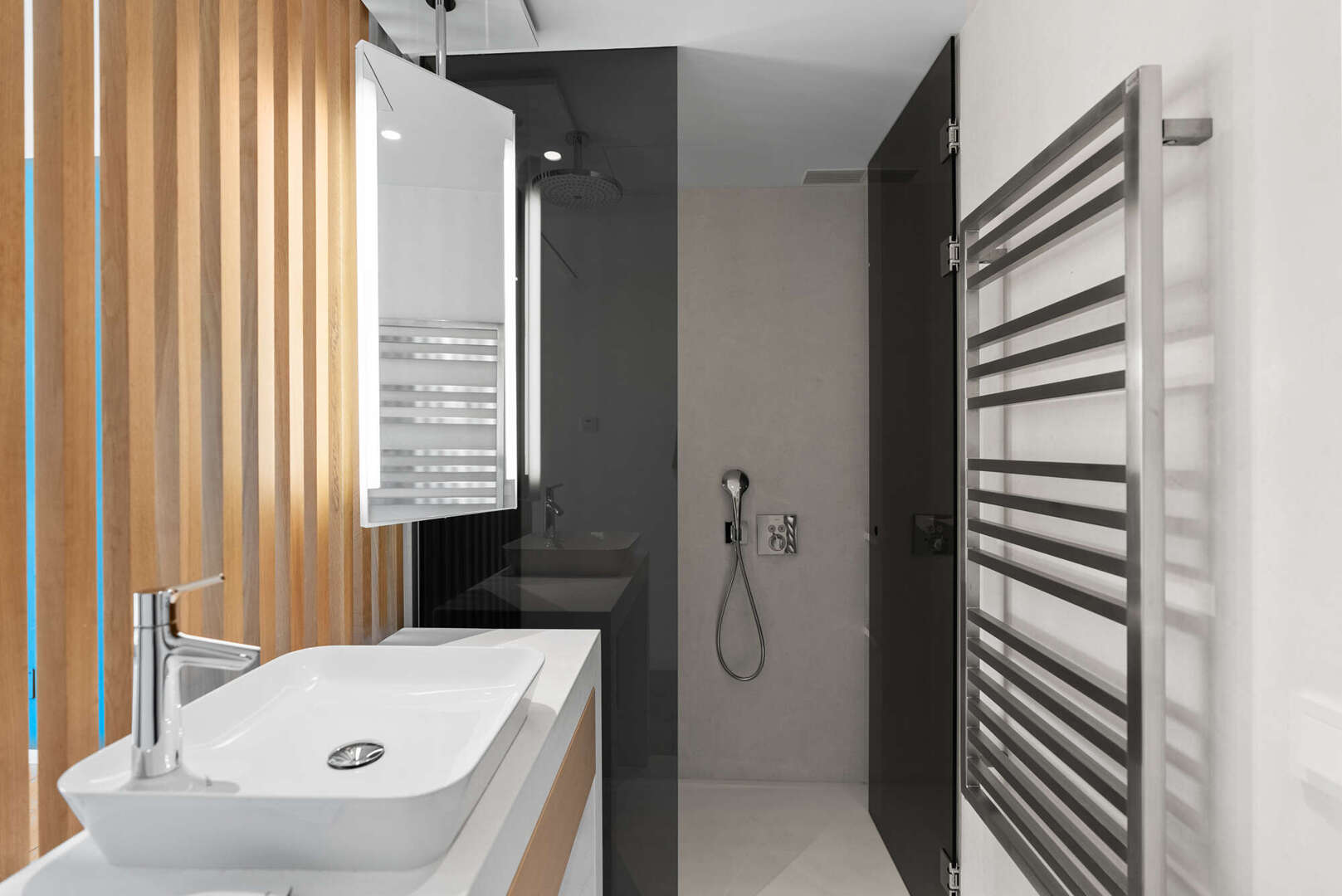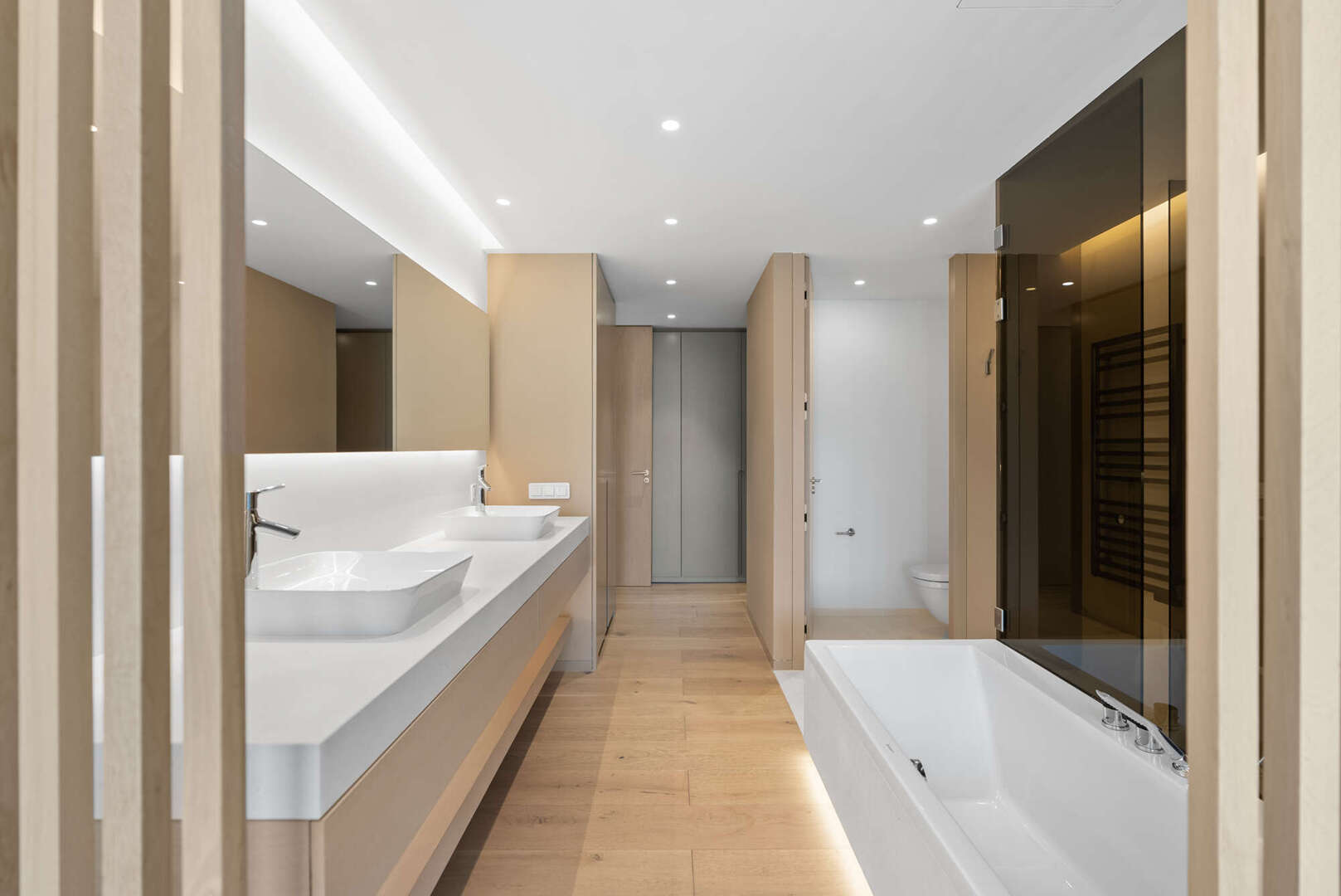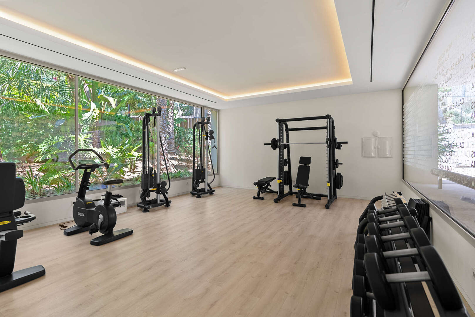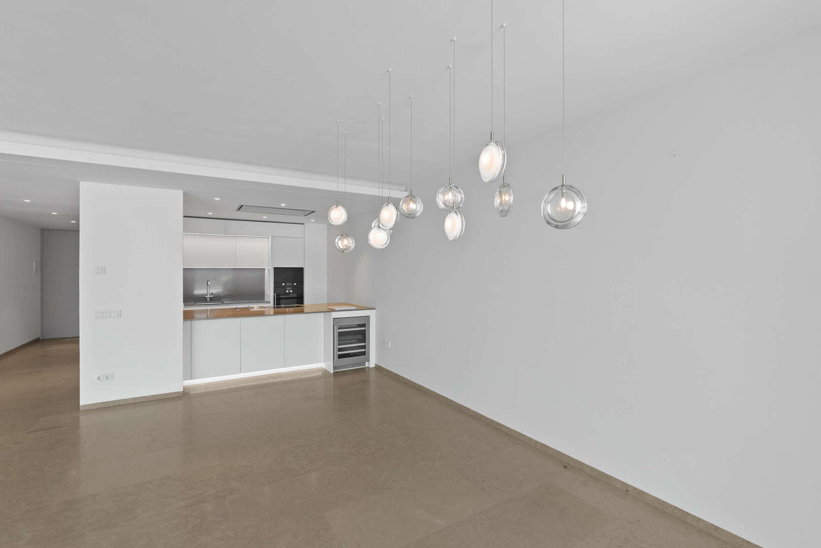 En la planta baja, encontrará un amplio salón-comedor con una cocina de lujo abierta (electrodomésticos Gaggenau), un aseo de invitados y un patio de diseño encantador. El acceso directo conduce a la gran terraza cubierta (41 m²), a la piscina privada (20 m²) y a otra zona de estar con vistas panorámicas al mar y a la montaña: su oasis personal de paz.