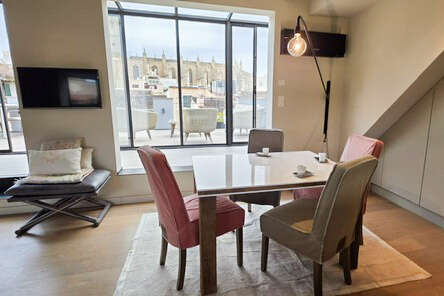 Das absolute Highlight dieser Immobilie ist die beeindruckende ca. 60 m² große Terrasse, die sich über die gesamte Länge des Apartments erstreckt. Von hier aus genießen Sie einen einzigartigen Blick auf die Kirche und die Dächer der Altstadt. Dank der großen bodentiefen Fensterelemente eröffnet sich auch aus dem Innenbereich ein nahezu gigantischer Panoramablick, der dieses Apartment zu einer echten Rarität macht.