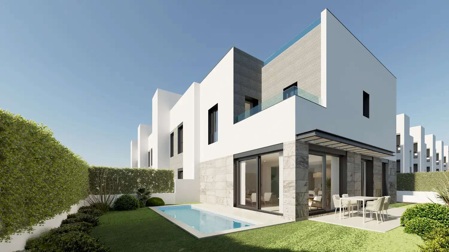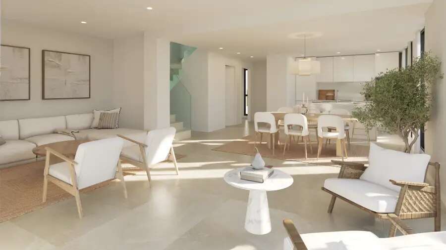 En la planta principal encontramos un luminoso espacio de salón-comedor con cocina integrada, que conecta directamente con el jardín privado, creando una agradable continuidad entre interior y exterior. En el exterior destaca una magnífica piscina, ideal para disfrutar del clima mediterráneo durante todo el año.