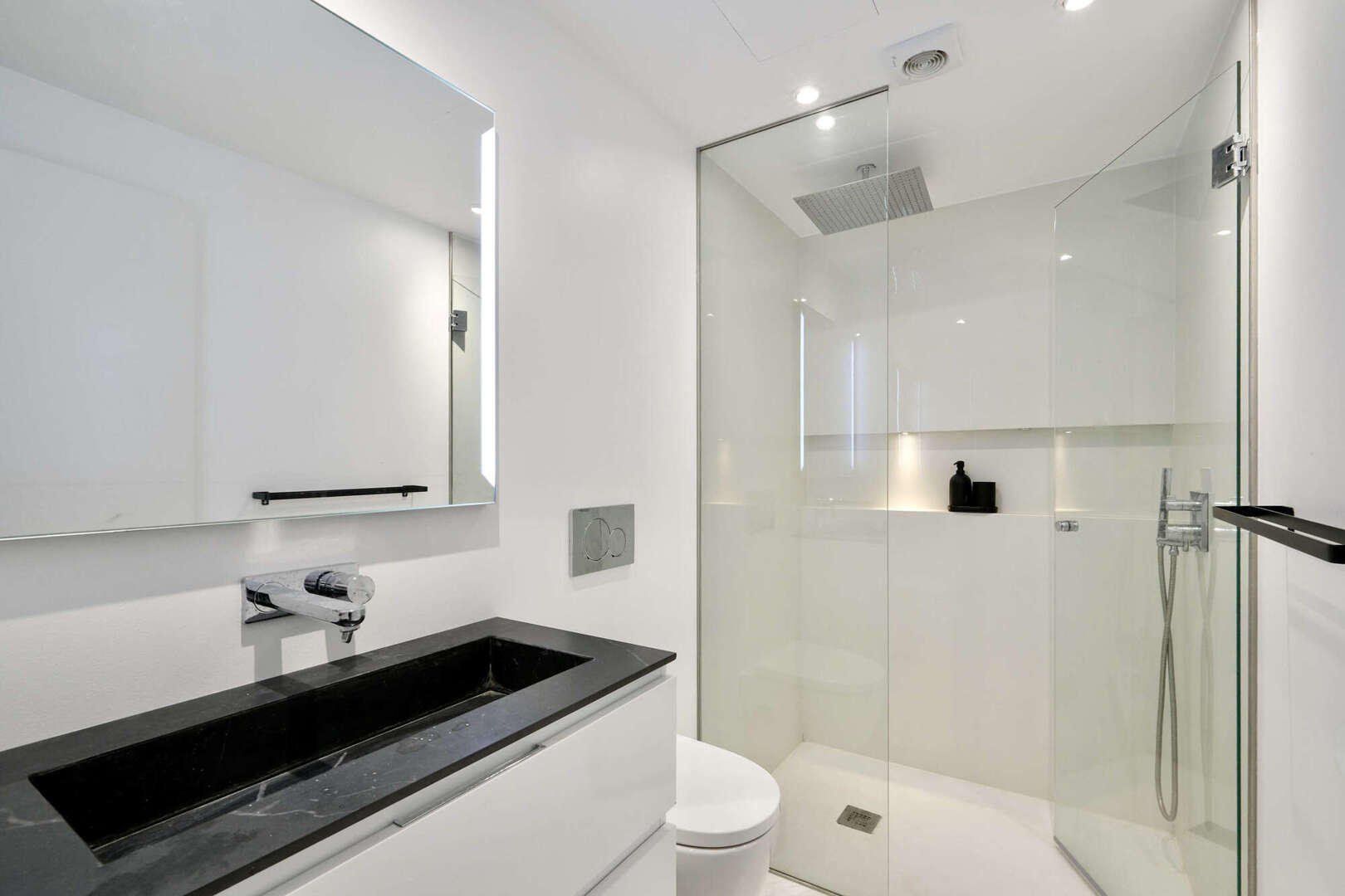 Das Hauptschlafzimmer mit Bad en suite befindet sich im ruhigen hinteren Bereich der Wohnung und eröffnet einen harmonischen Blick auf einen vertikalen Zen-Garten – eine private Oase der Ruhe. Ein weiteres Schlafzimmer sowie ein zusätzliches Badezimmer bieten Komfort für Gäste oder Familie.