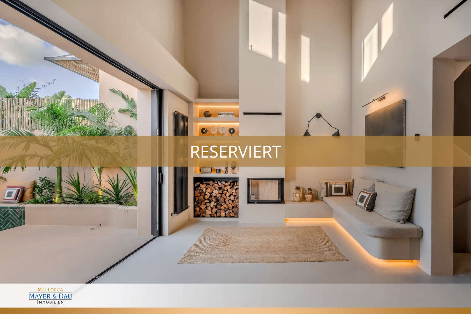 Desde el salón se accede a la soleada terraza con una amplia piscina de agua salada rodeada de palmeras mediterráneas.