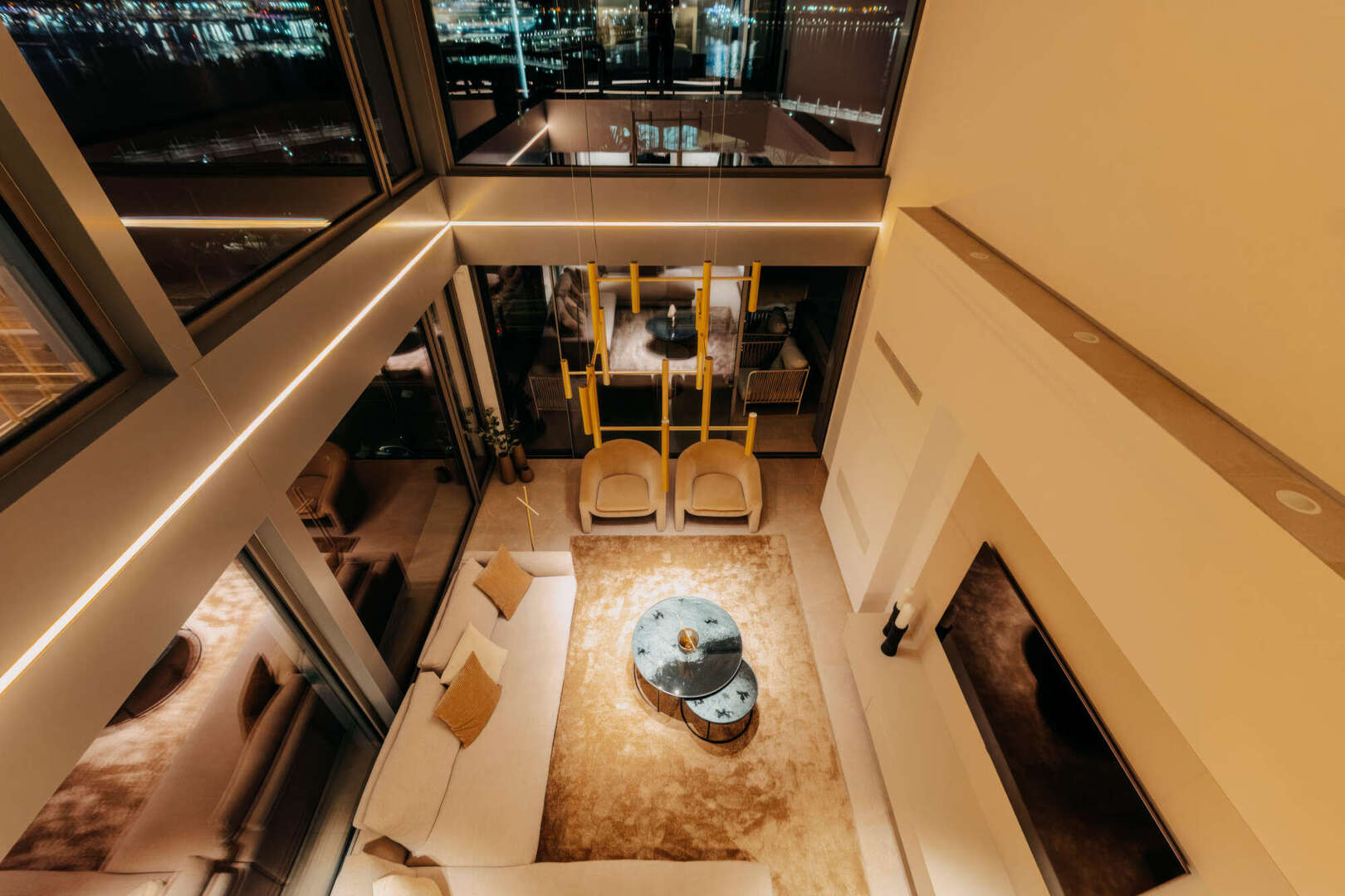 El luminoso salón con techos de doble altura crea una impresionante sensación de espacio y ofrece acceso directo a la terraza. Los amplios ventanales permiten la entrada de mucha luz natural y crean un ambiente abierto, luminoso y elegante.
