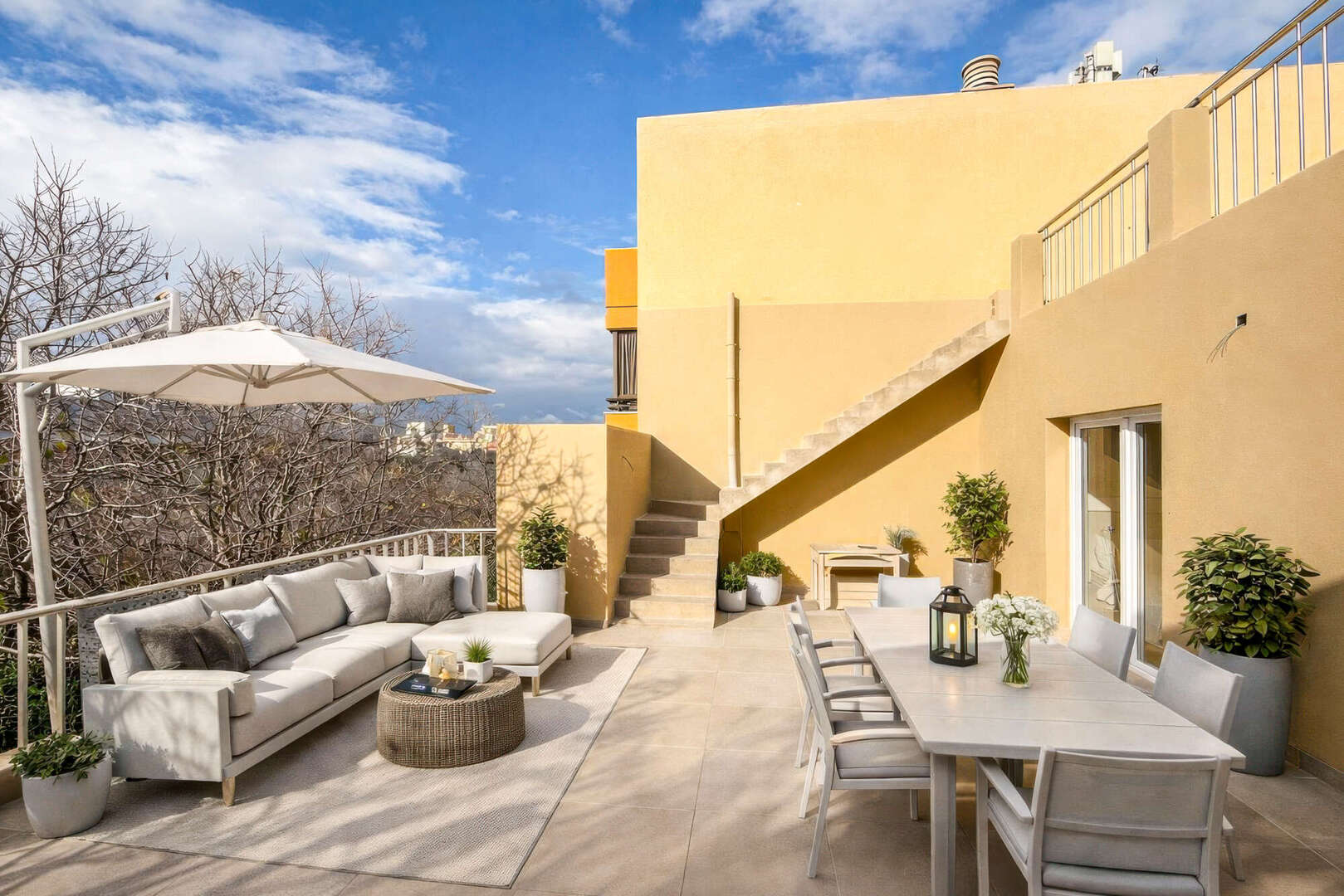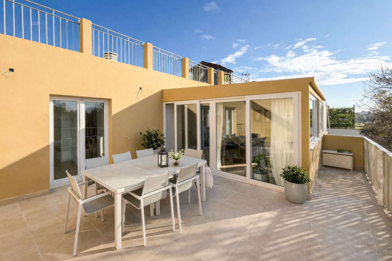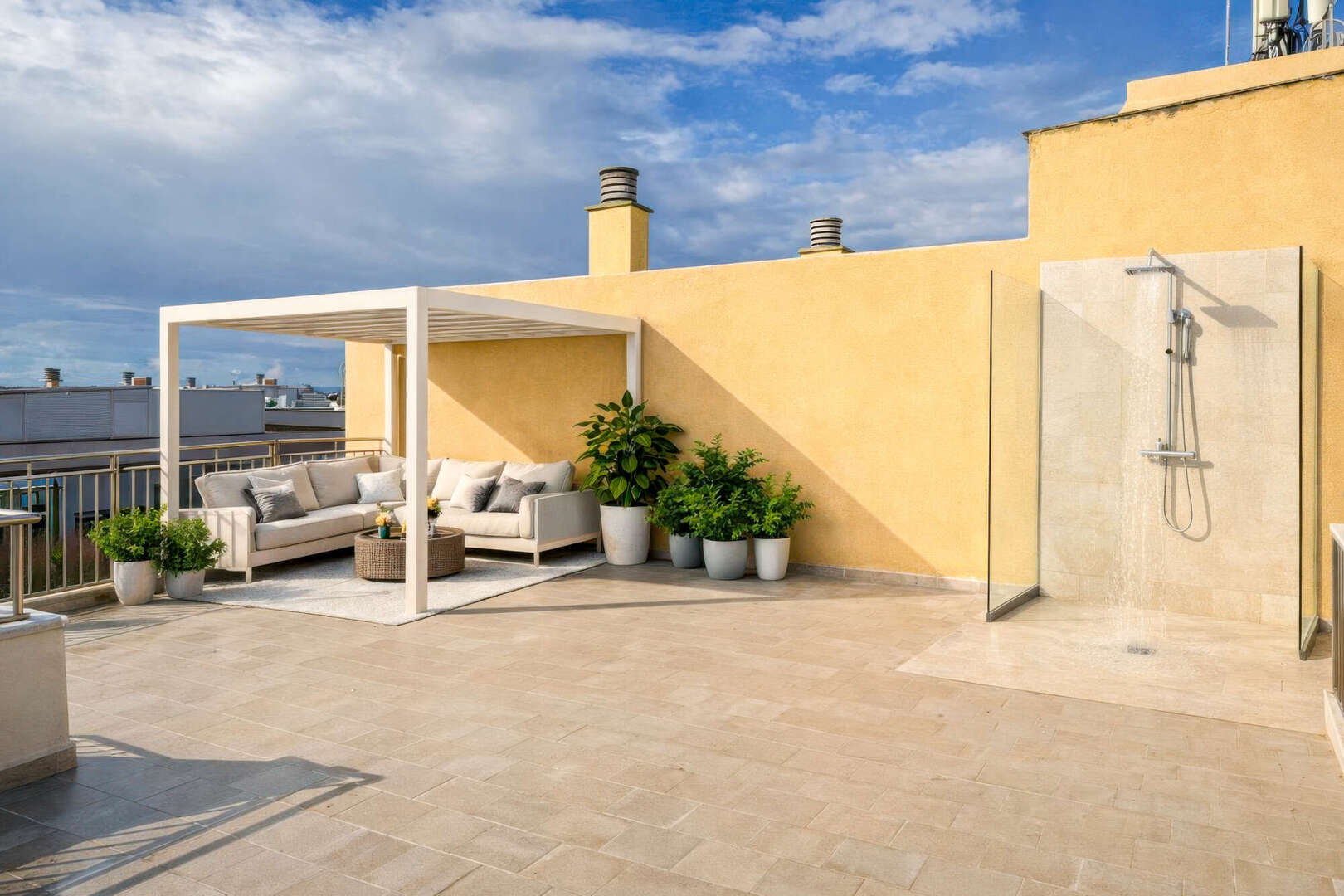 La azotea superior dispone de una ducha exterior y vistas parcialmente ampliadas. Ambas terrazas están ajardinadas con plantas de primer crecimiento y disfrutan de sol todo el día. Un entorno ideal para tumbonas, elegantes zonas de estar, cenas al aire libre para relajarse por la noche al aire libre.