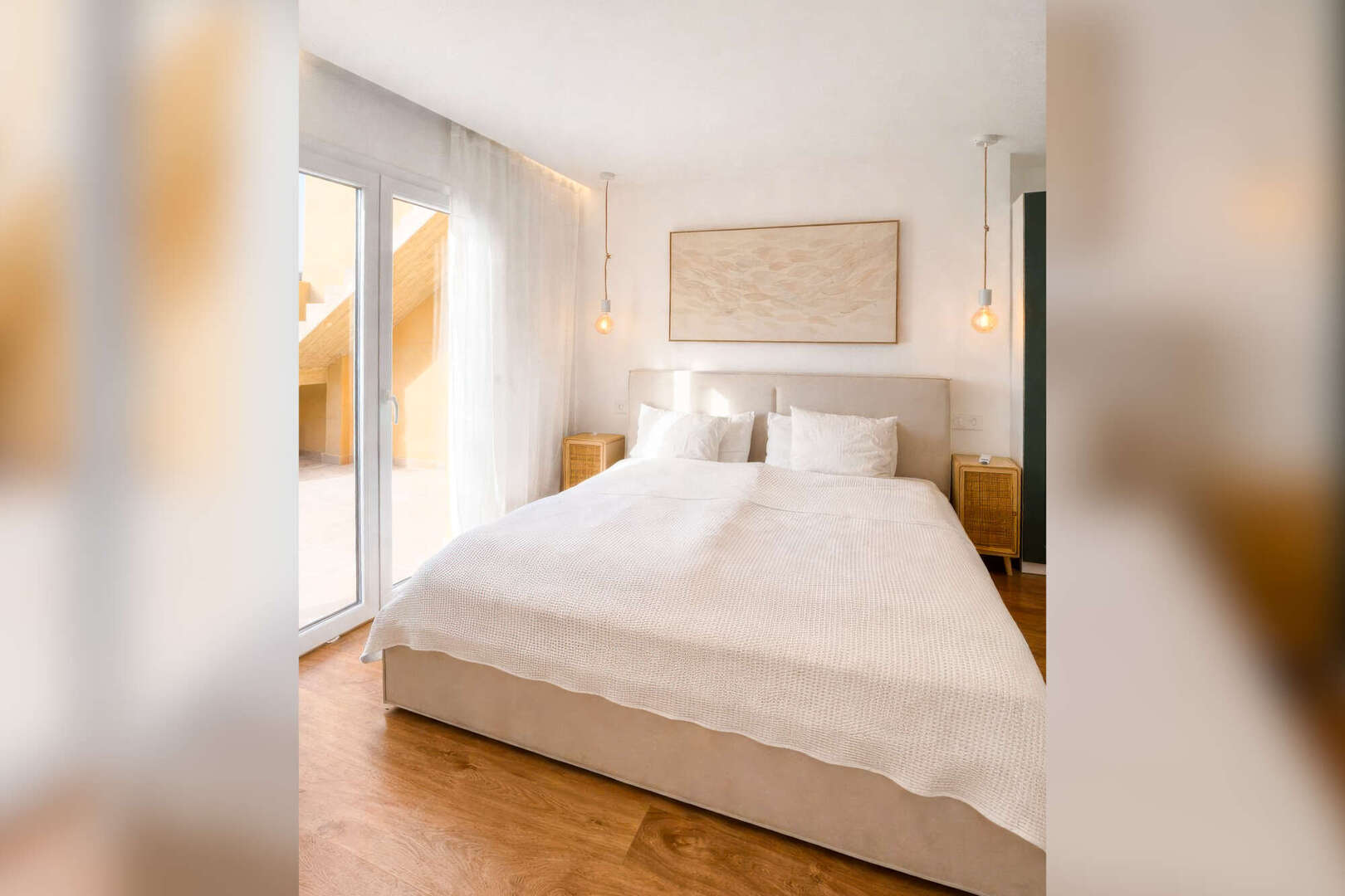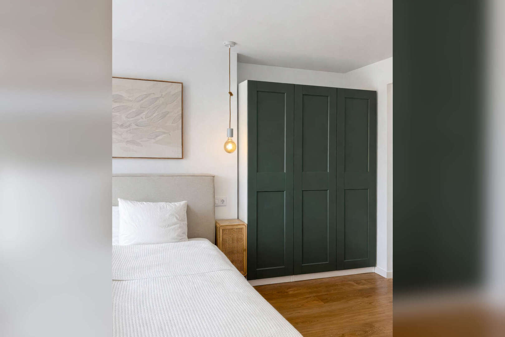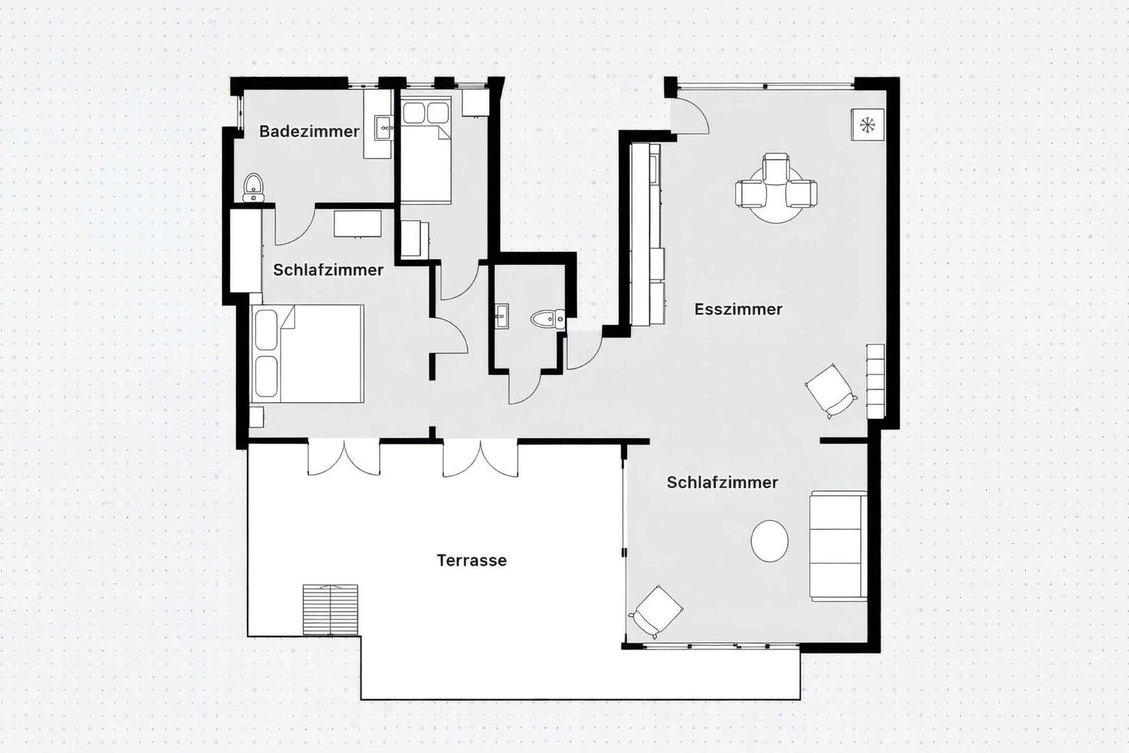Un total de 3 dormitorios y 2 baños se reparten en unos 95 m² de superficie habitable. El dormitorio principal dispone de un cómodo cuarto de baño en suite. Otro dormitorio tiene un diseño flexible y puede separarse de la zona de estar mediante puertas correderas de alta calidad. Un tercer dormitorio, algo más pequeño, completa la oferta de espacio y es ideal como habitación de invitados, habitación infantil u oficina en casa.