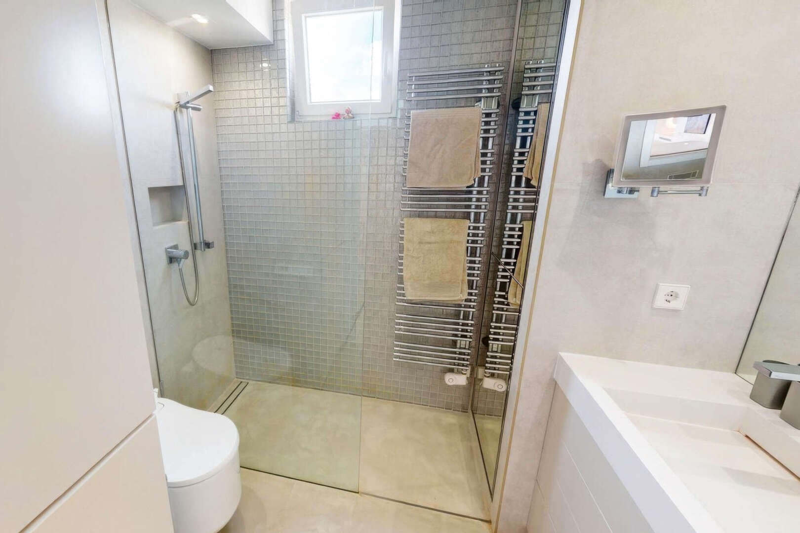 El mobiliario no deja nada que desear: El aire acondicionado y la calefacción funcionan a través de energía geotérmica, la calefacción por suelo radiante en el baño proporciona comodidad adicional y un moderno inodoro con ducha japonesa redondea la imagen general de alta calidad. Ventanas de doble acristalamiento con persianas eléctricas, armarios empotrados hechos a medida y una cocina amueblada lacada de alta calidad con modernos electrodomésticos acentúan el carácter exclusivo del piso. Los revestimientos del suelo también son de muy alta calidad y la propiedad se ofrece con muebles de diseño nuevos y elegantes.