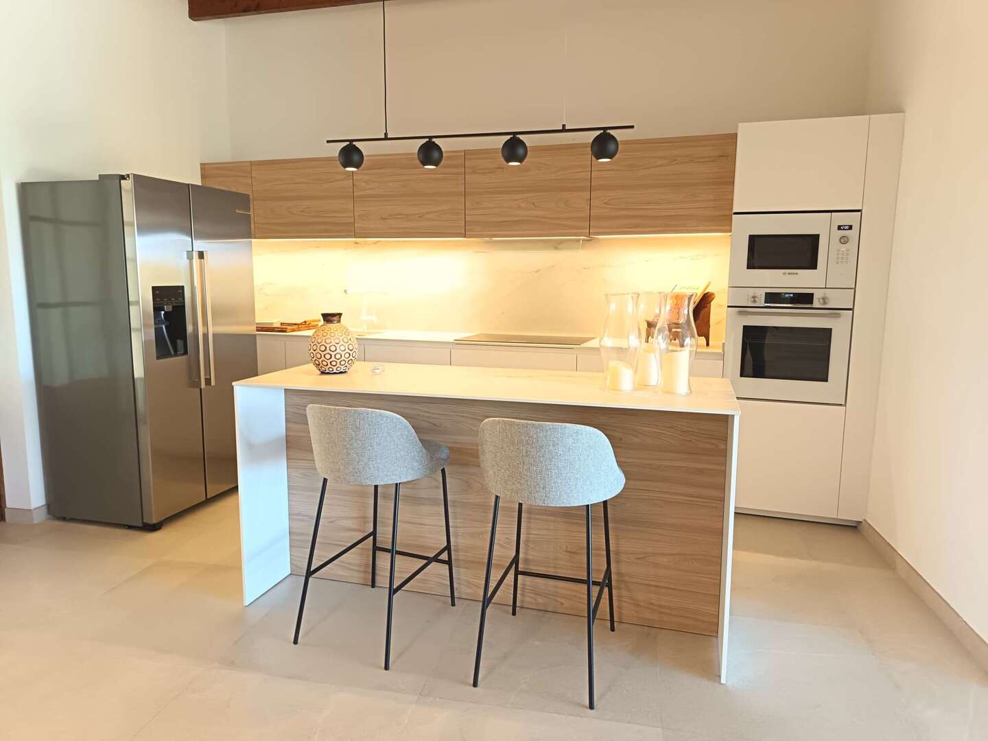 La moderna cocina no deja nada que desear: Equipada con electrodomésticos Bosch de alta calidad, un frigorífico americano y elegantes muebles de cocina de la marca Santos. La innovadora placa vitrocerámica es de última generación.