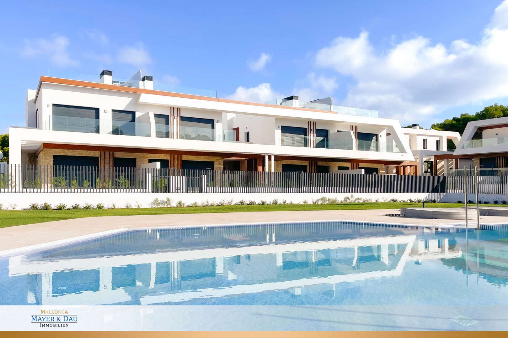 Aproveche los jardines comunitarios con una piscina de aprox. 100 m², duchas exteriores, dos jacuzzis y una gran terraza solarium para disfrutar plenamente del clima mediterráneo de Mallorca.