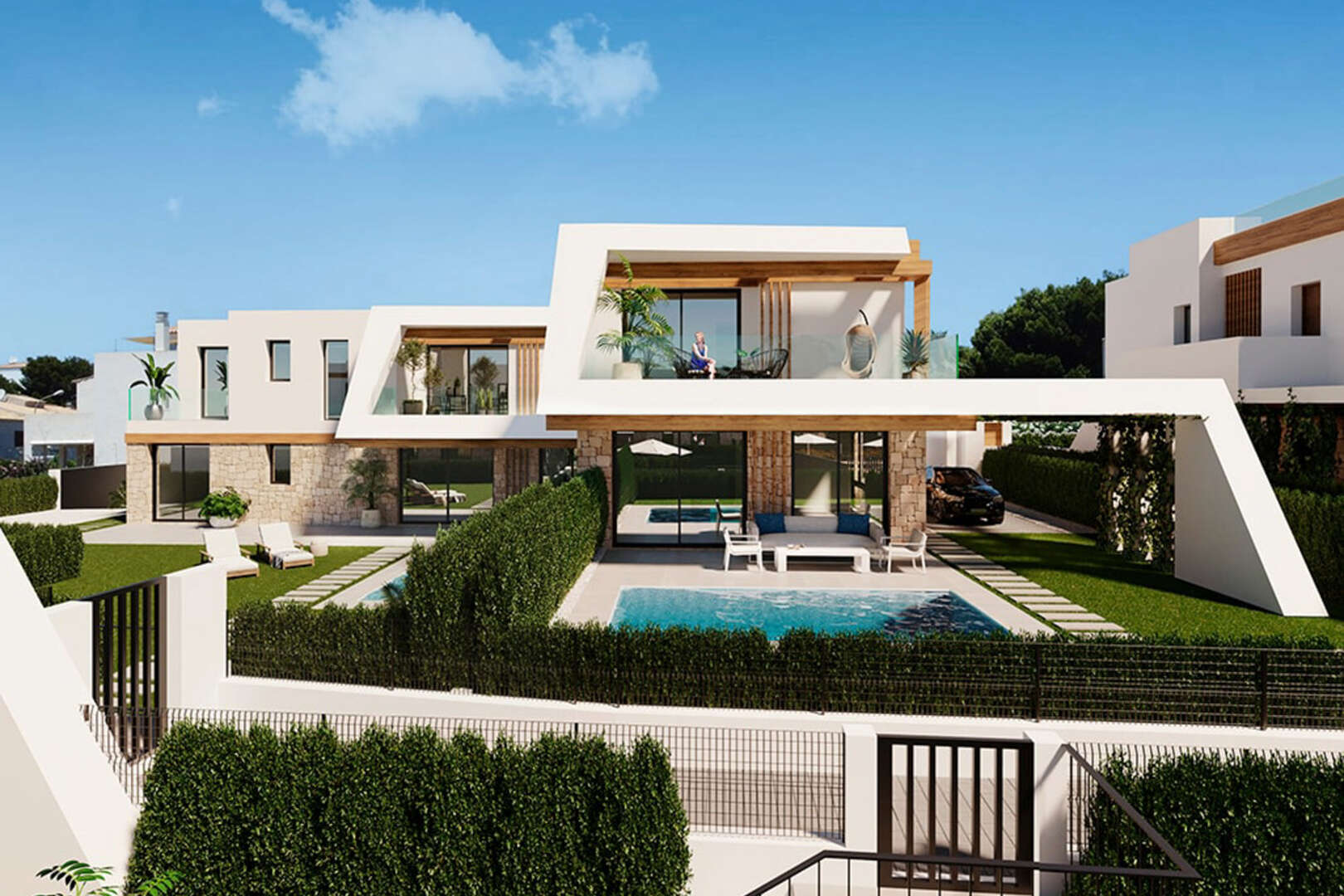 Aproveche los jardines comunitarios con una piscina de aprox. 100 m², duchas exteriores, dos jacuzzis y una gran terraza solarium para disfrutar plenamente del clima mediterráneo de Mallorca. Para mayor privacidad, también tiene la opción de tener una piscina privada instalada en su propio jardín.