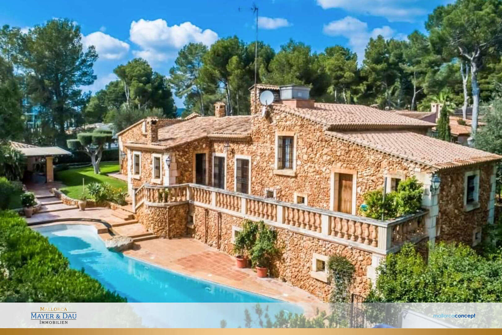 Esta propiedad se encuentra en el tranquilo asentamiento costero de Costa de los Pinos, a pocos pasos del mar. La representativa puerta de entrada con pesadas puertas antiguas de madera conduce al hermoso y cuidado jardín mediterráneo, en el que la casa con su fachada de piedra natural está armoniosamente incrustada. La casa consta de dos niveles. En el nivel habitable de la planta baja hay un salón con chimenea, comedor con cocina americana, despacho, cuatro dormitorios y cuatro cuartos de baño repartidos en una superficie habitable de unos 280 m². En el sótano de la casa hay un garaje doble y varias habitaciones auxiliares. La sólida casa de estilo mallorquín fue construida con materiales de alta calidad, algunos de los cuales son antiguos. Una dependencia alberga una cocina de verano totalmente equipada con comedor cubierto, despensa y cuarto de ducha. También hay un jacuzzi junto a la piscina con fuente de agua. También hay un baño de vapor en la casa. El equipamiento de alta calidad de la casa incluye calefacción central de gasoil, unidades de aire acondicionado split en los dormitorios, puerta automática con videovigilancia y mucho más. La casa también tiene una licencia de alquiler de vacaciones para seis camas.