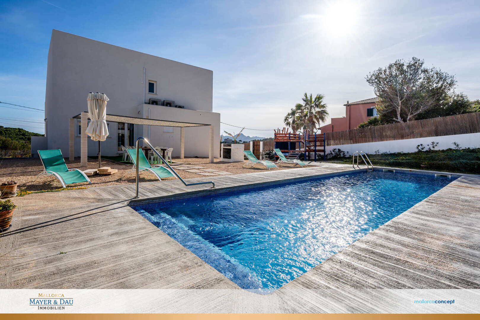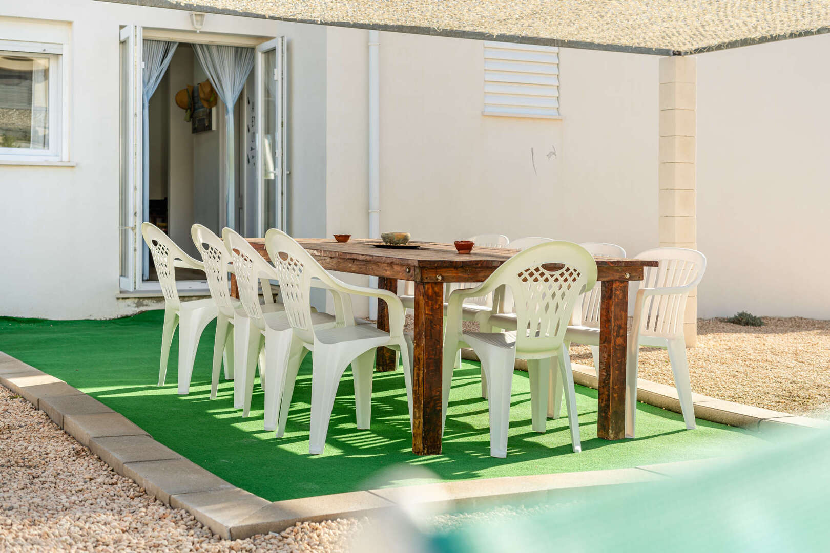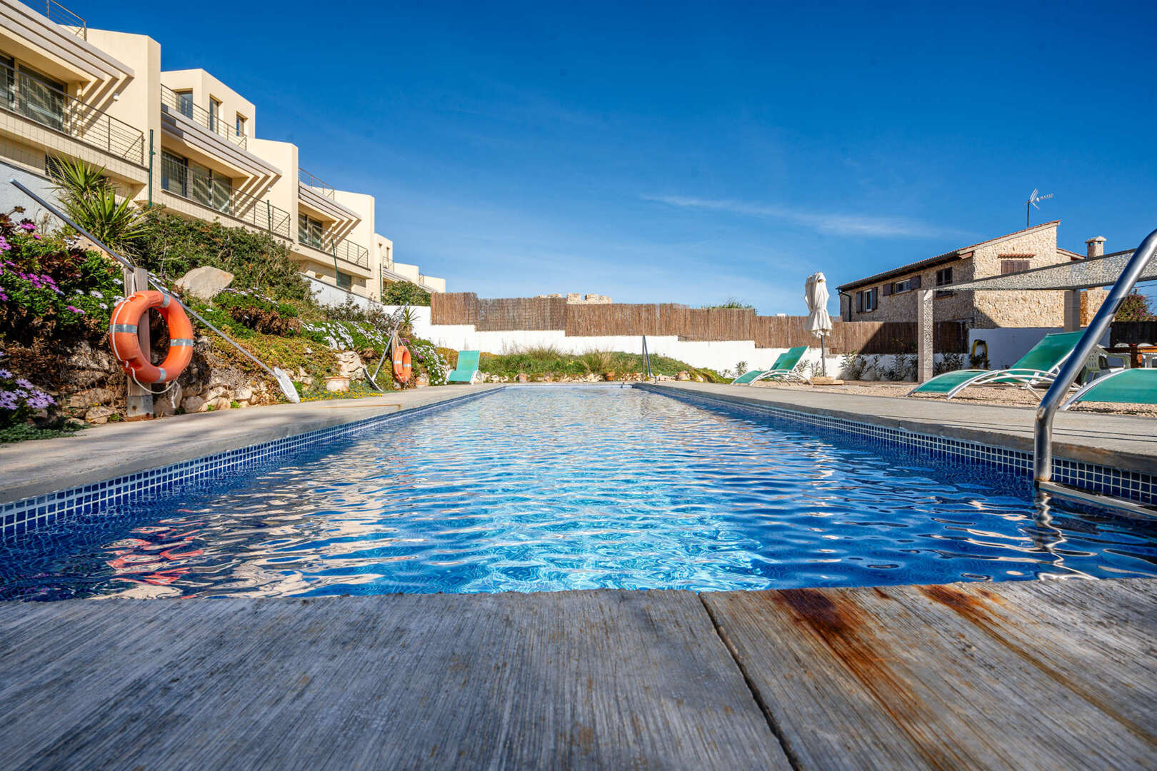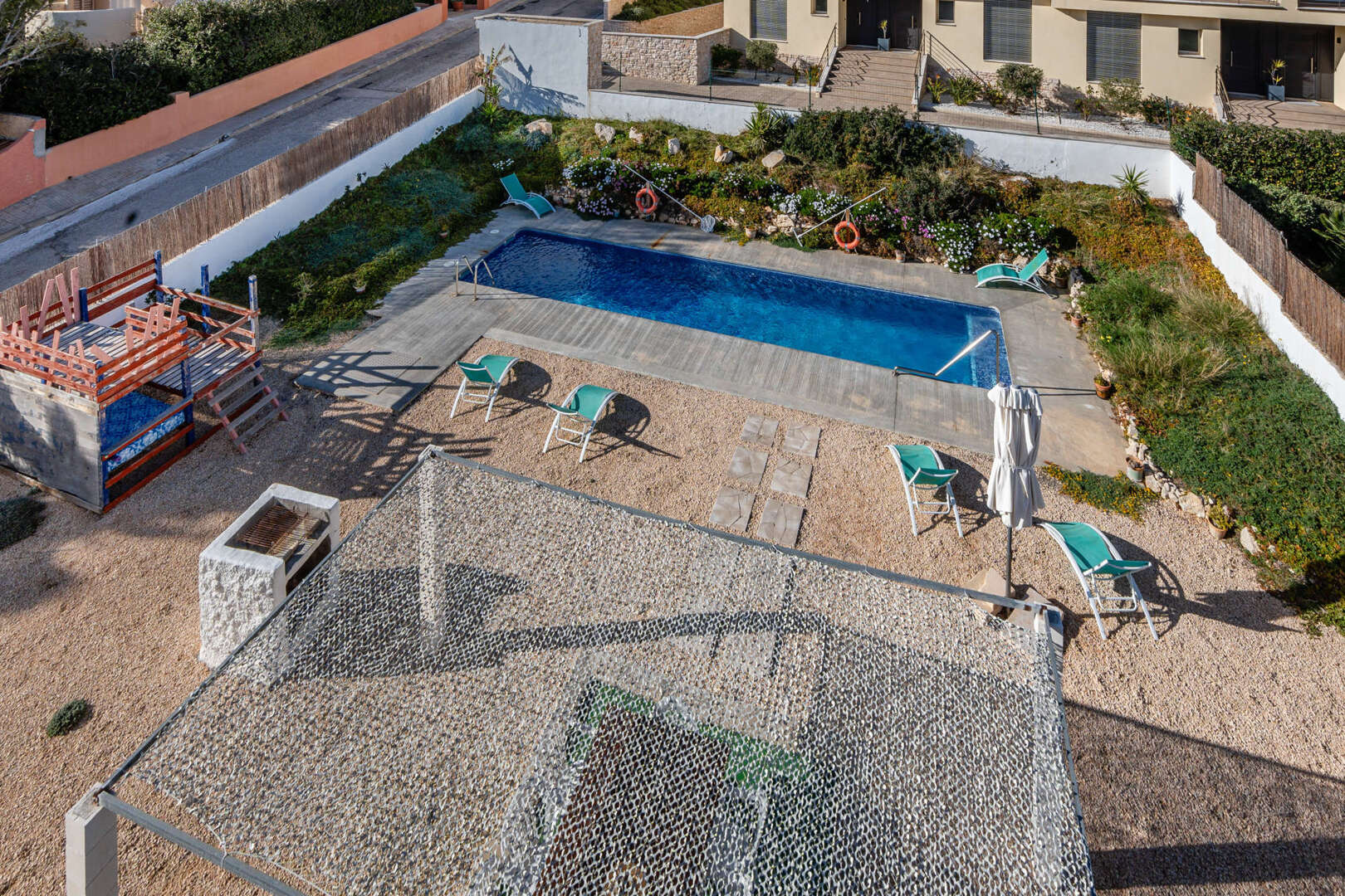 La resplandeciente piscina invita a darse un refrescante chapuzón al sol, mientras que la zona de barbacoa y el espacio exterior ofrecen el marco perfecto para socializar y cenar al atardecer.