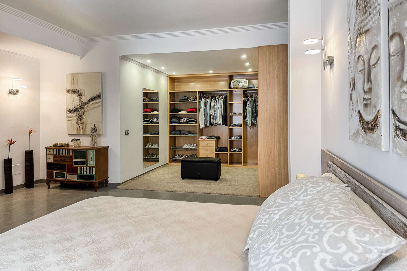 En la planta baja hay un salón/comedor, dos dormitorios dobles con baños en-suite (uno de ellos con un espacioso vestidor), una habitación de invitados o estudio, una cocina moderna totalmente equipada con isla de cocción y un lavadero. Un aseo de invitados adicional completa la oferta. Desde esta planta se accede a un típico patio mallorquín con piscina y cocina de verano donde podrá disfrutar de agradables veladas con amigos y familiares. También hay otro aseo de invitados con ducha.