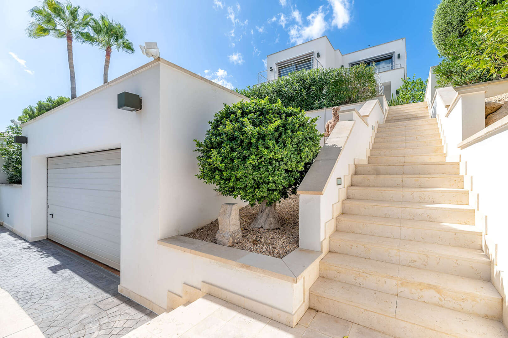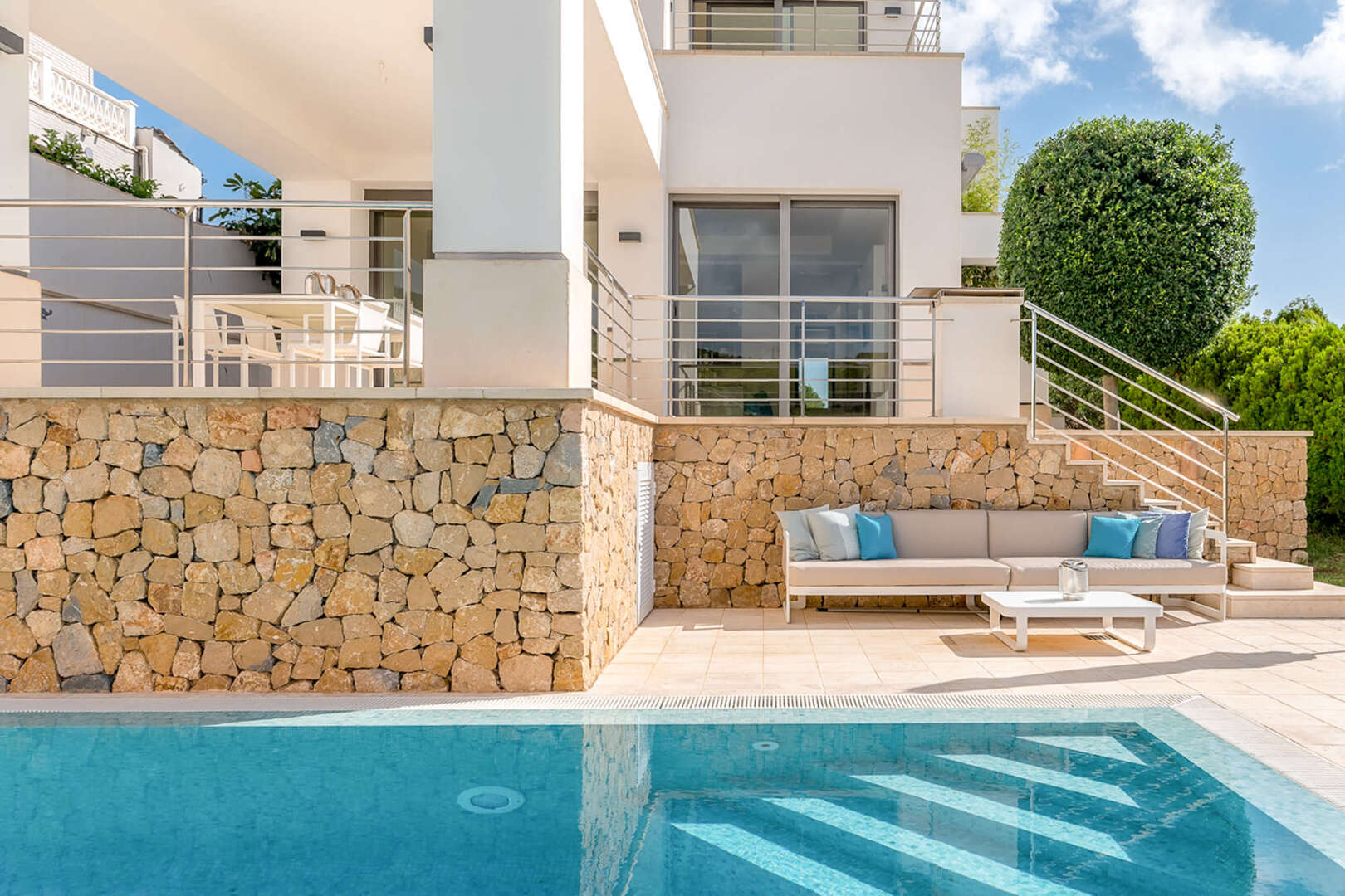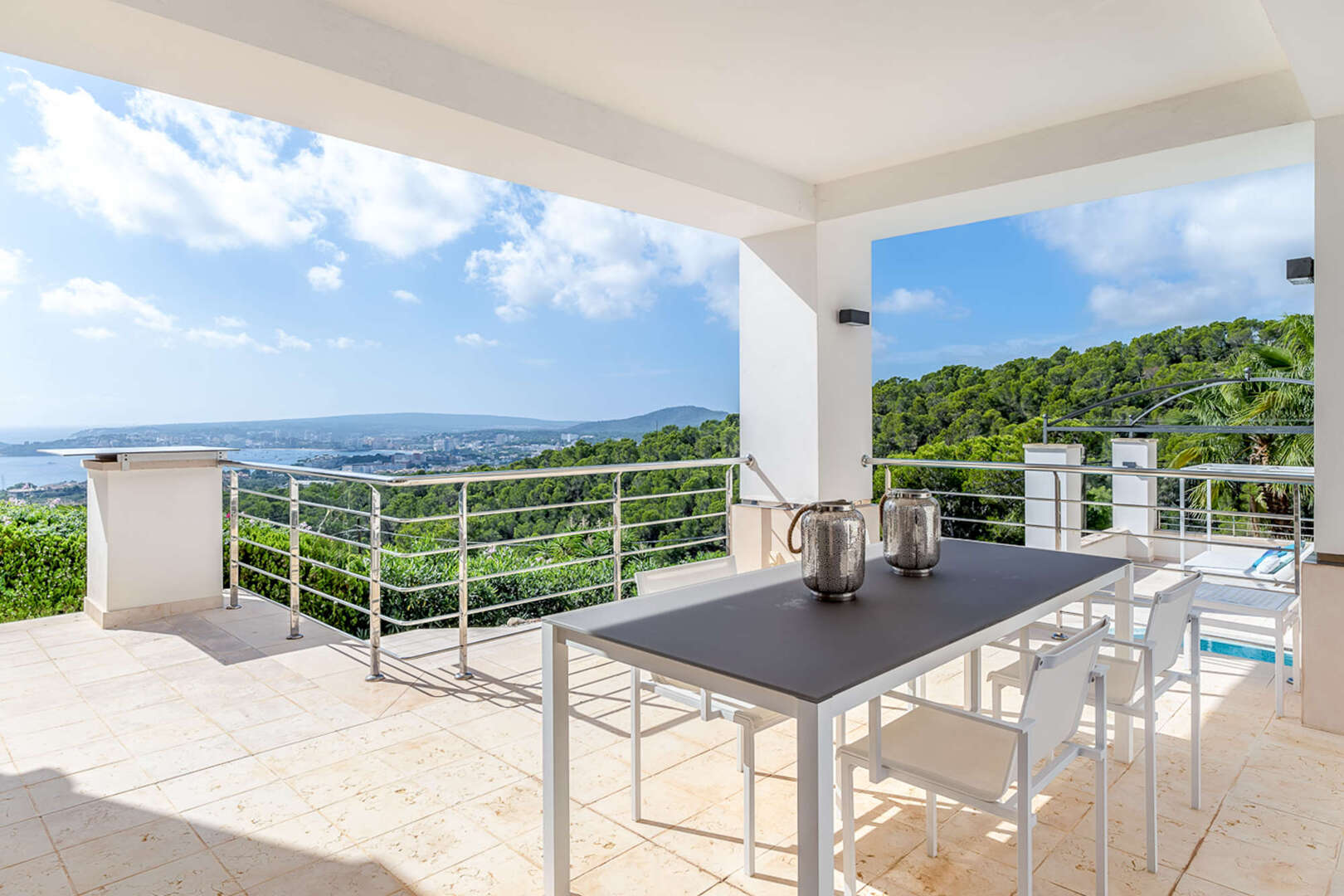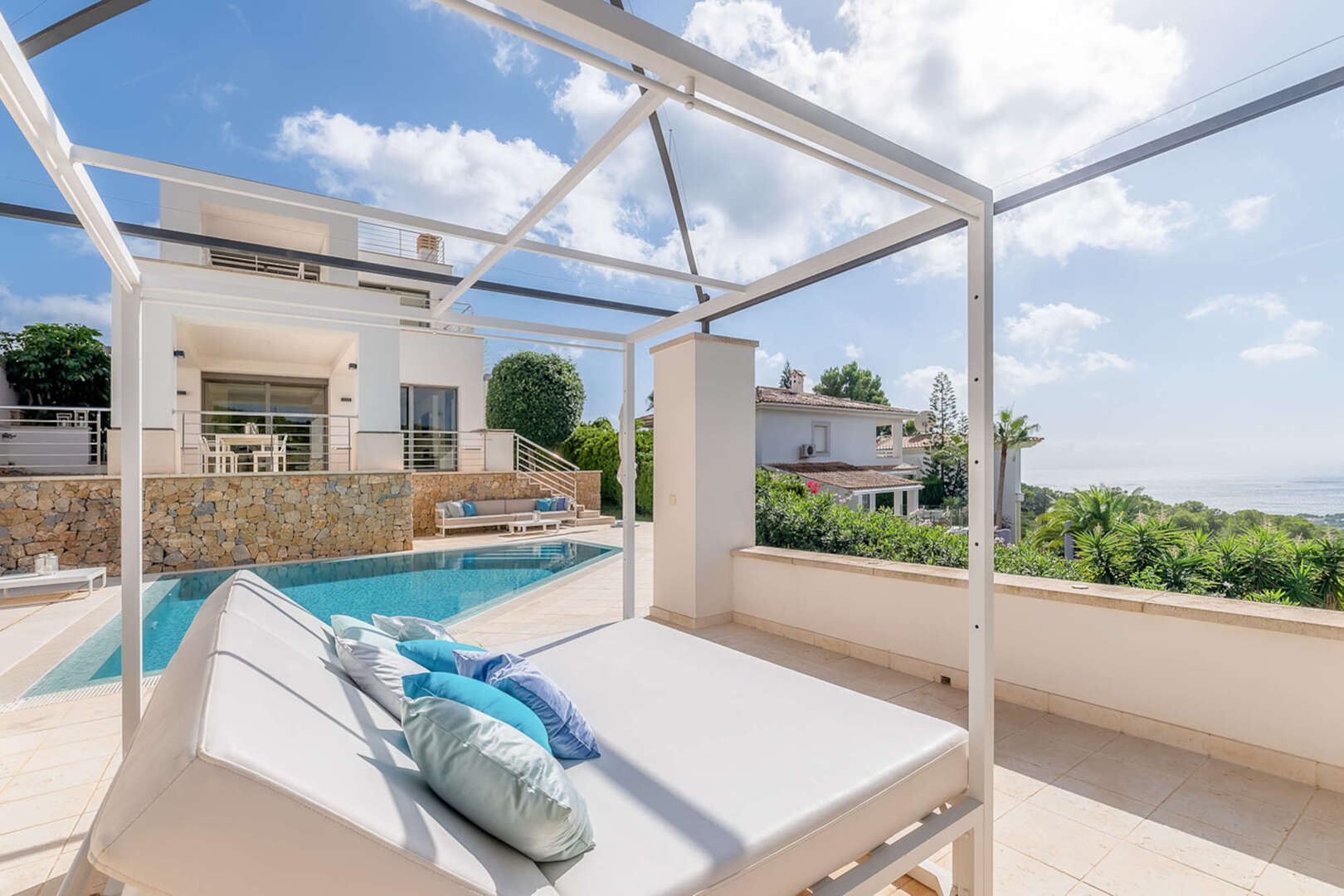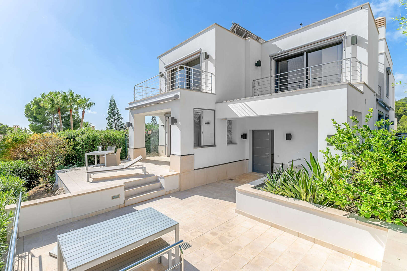 La amplia terraza de la planta baja ofrece mucho espacio para relajarse y disfrutar del sol mediterráneo. Las vistas al mar son especialmente impresionantes.