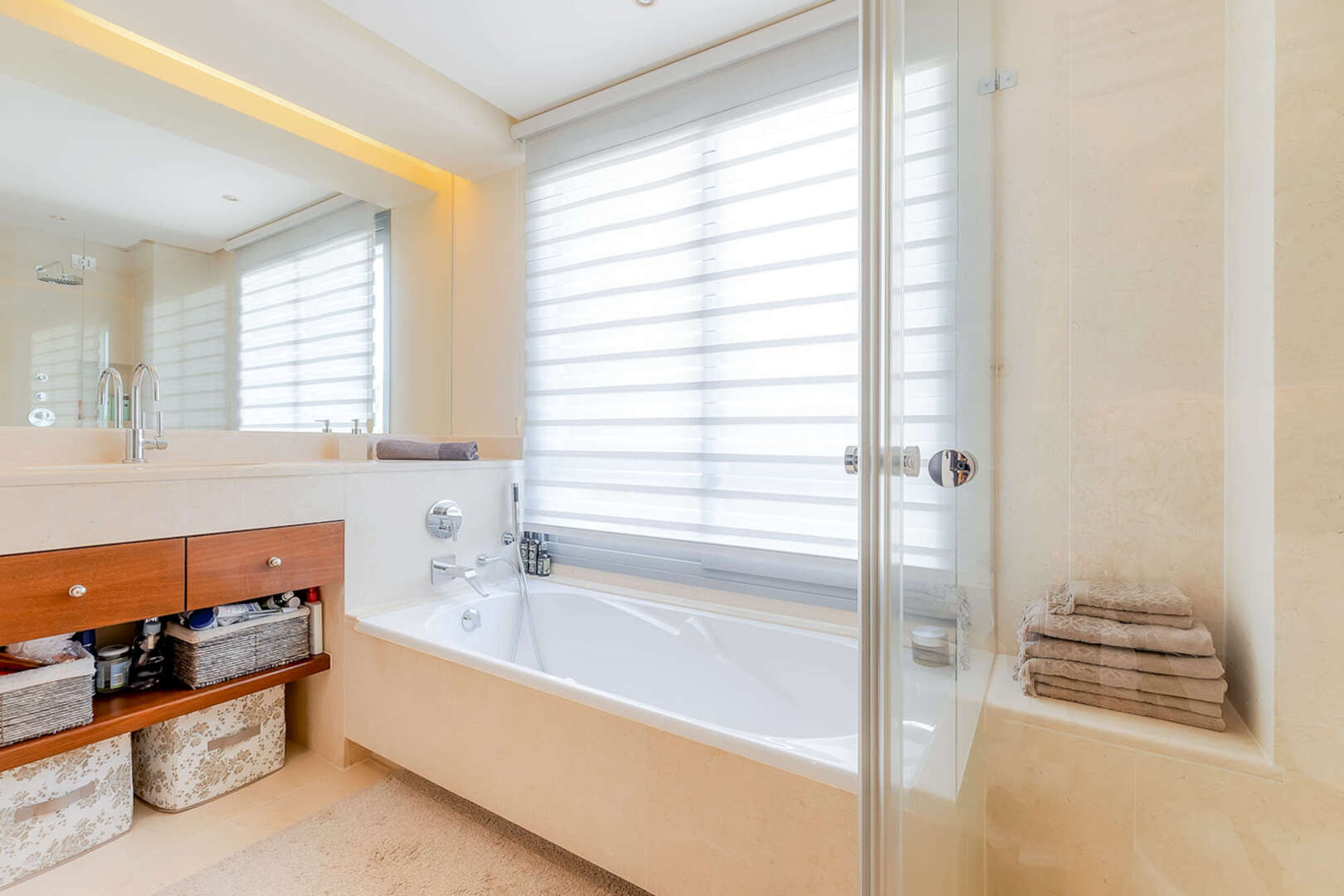 El dormitorio principal tiene su propio cuarto de baño de lujo y ofrece espectaculares vistas al mar desde su terraza privada.