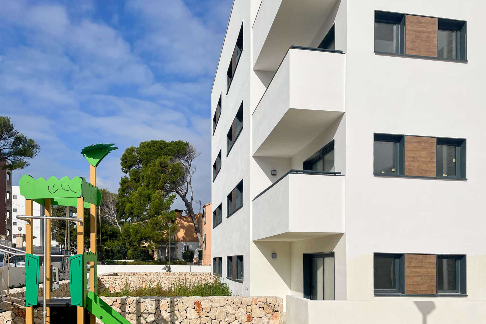 33 plazas de aparcamiento al aire libre, una piscina comunitaria con solarium y un parque infantil completan la oferta. También hay preinstalación para coches eléctricos.