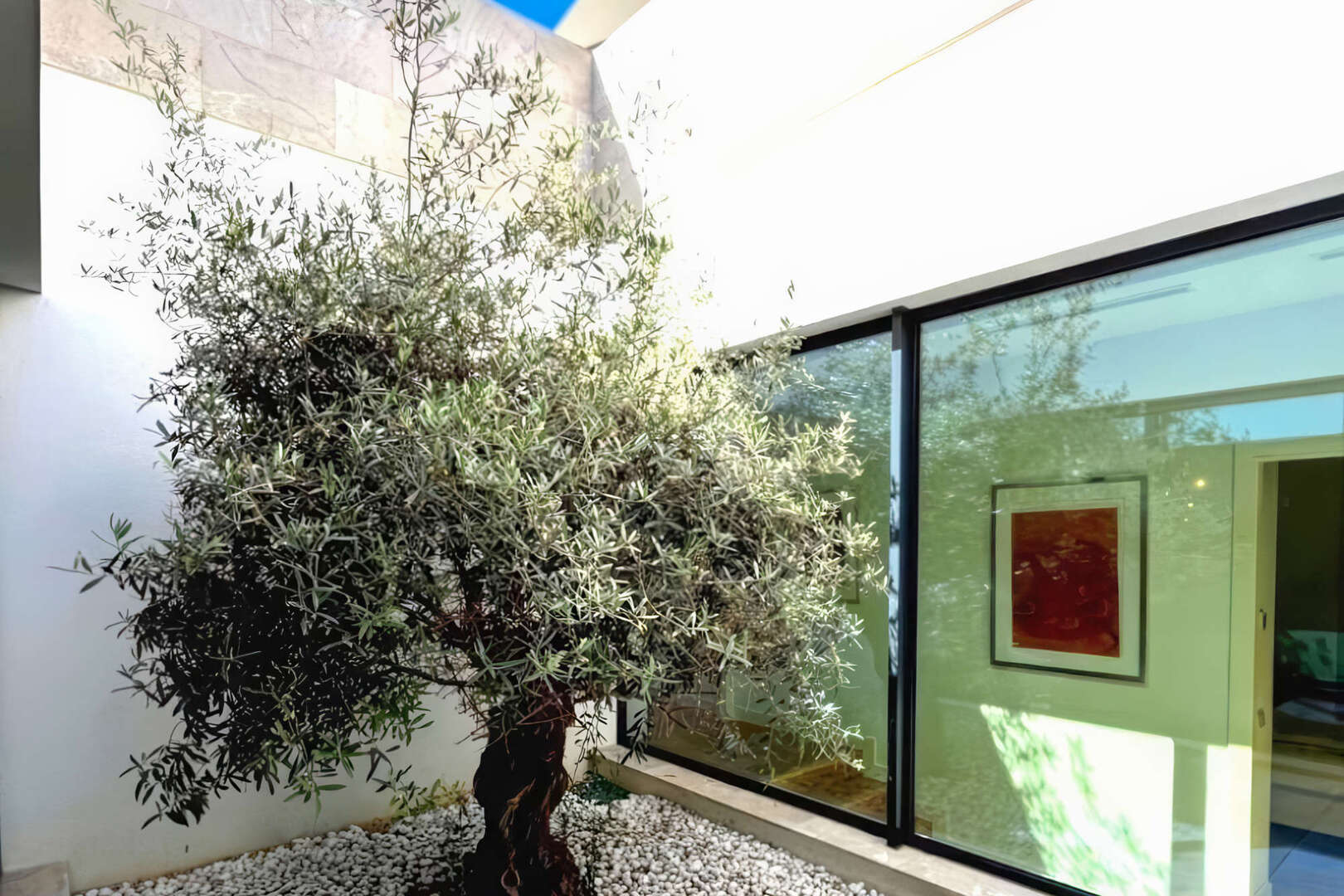 Der großzügige Wohnbereich ist perfekt für gesellige Abende, während die moderne Küche mit hochwertigen Geräten ausgestattet ist und zum Kochen inspiriert. Mit drei geräumigen Schlafzimmern bietet dieses Haus ausreichend Platz für die ganze Familie oder Gäste. Jedes Schlafzimmer ist geschmackvoll eingerichtet und sorgt für erholsame Nächte. Große Fenster lassen viel Tageslicht herein und bieten einen herrlichen Ausblick auf die umliegenden, pflegeleichten Gärten, die sich auf mehreren Ebenen erstrecken. Ein kleiner eigener Pool sorgt für erfrischende Momente an heißen Tagen.