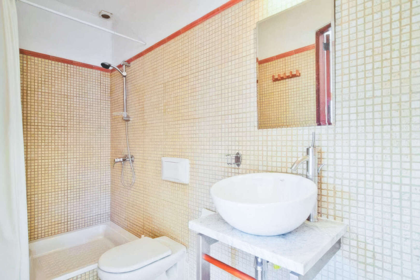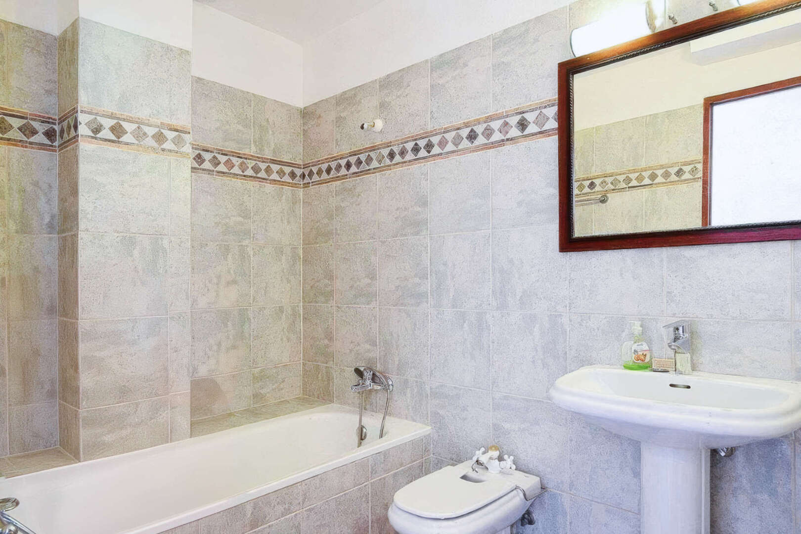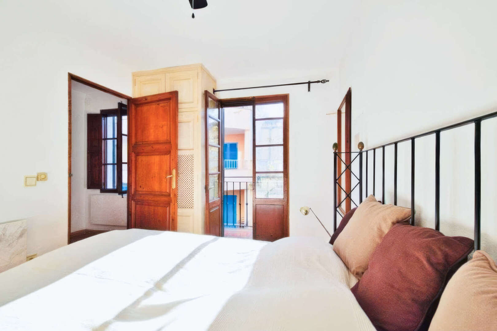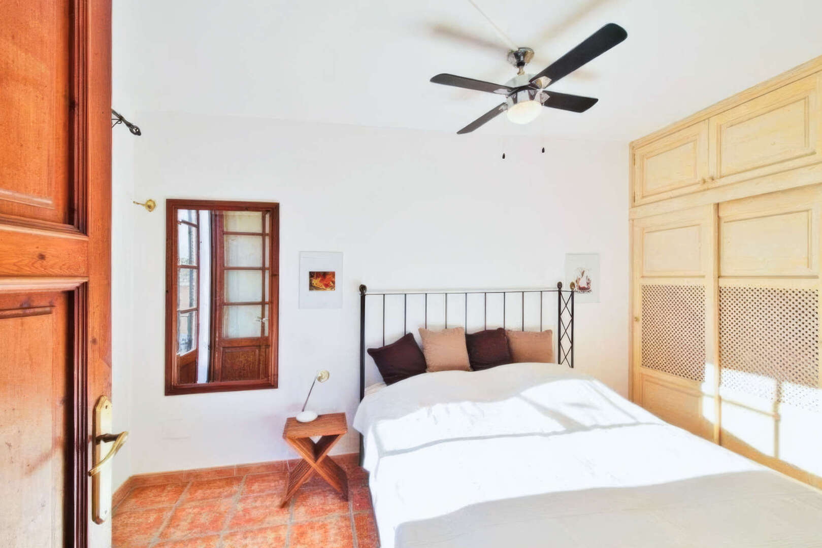 Im zweiten Stock befindet sich ein großzügiges Doppelzimmer mit Deckenventilator, reichlich Einbauschränken und gefliesten Böden. Ein Badezimmer mit Wanne, Dusche, Bidet, WC und Waschtisch bietet zusätzlichen Komfort. Ein weiteres Schlafzimmer bietet viel Stauraum mit raumhohen Regalen, einem Deckenventilator und einem kleinen Balkon.