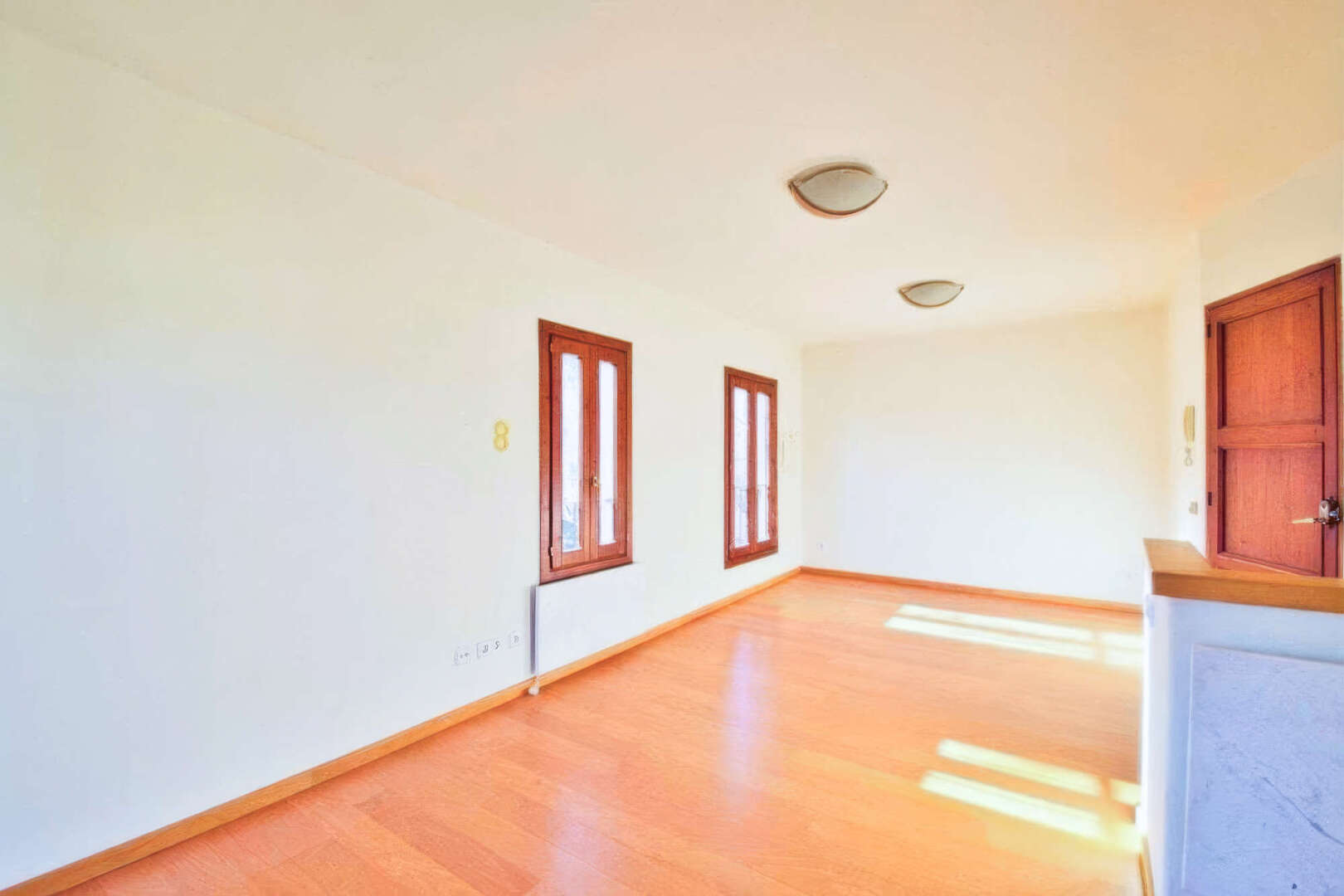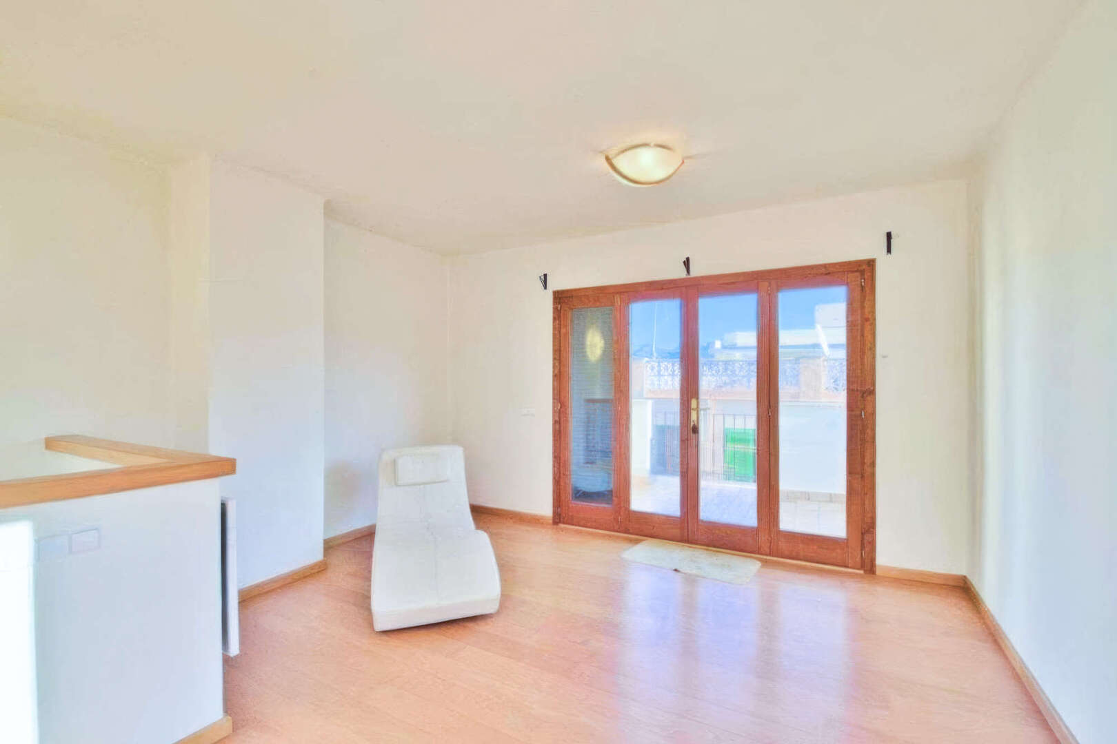 Die dritte Etage beherbergt das große, helle Hauptschlafzimmer und einem eigenen Duschraum mit WC und Waschbecken. Zwei große Fenster sorgen für viel Licht, und es gibt einen Ausgang zum Balkon.