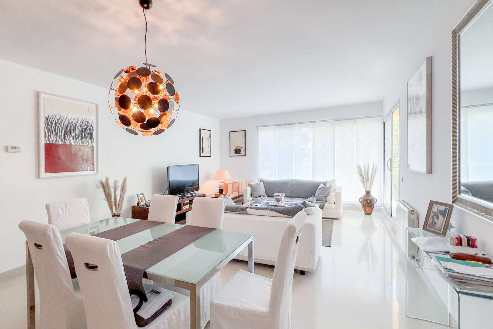Im Inneren erwarten Sie 2 Schlafzimmer und 2 Bäder, eines davon en Suite, sowie ein geräumiges Wohn-Esszimmer und eine voll ausgestattete Küche. Der Hauswirtschaftsraum bietet zusätzlichen Stauraum, während der große Eingangsbereich und die vielen Einbauschränke für Ordnung und Komfort sorgen.