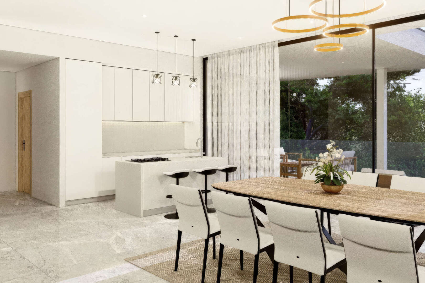Der offen gestaltete Wohn- und Essbereich mit bodentiefen Fenstern bietet lichtdurchflutete Räume und direkten Zugang zur Terrasse. Hier genießen Sie den Blick auf den privaten Pool, der zum Entspannen einlädt.