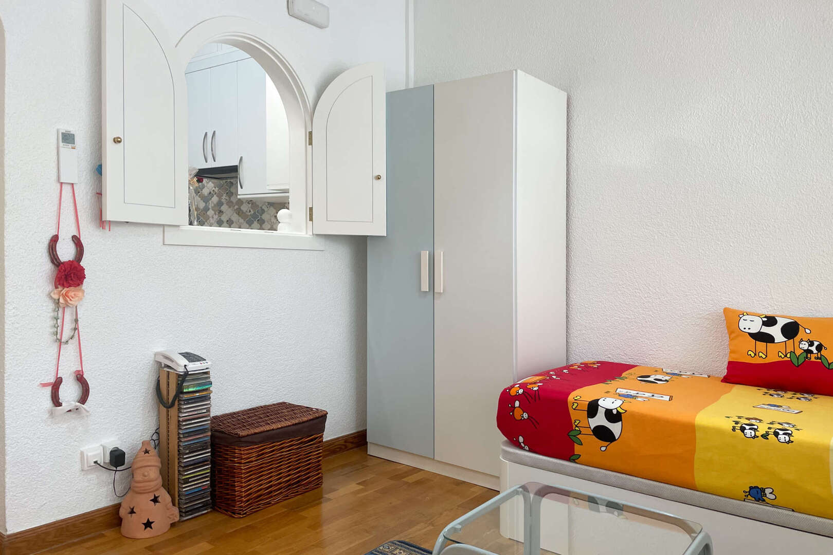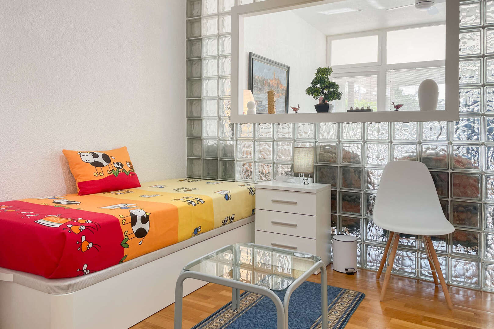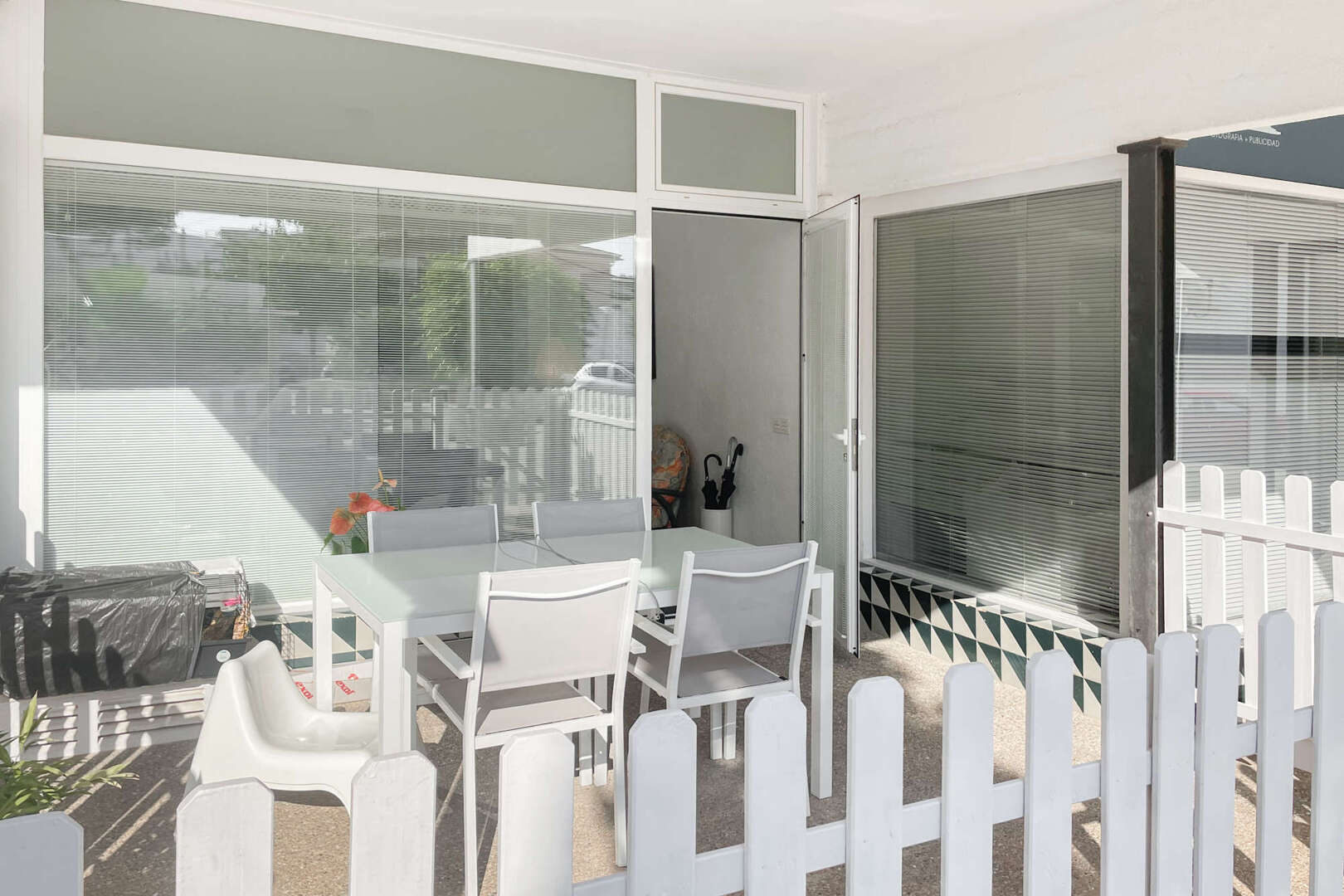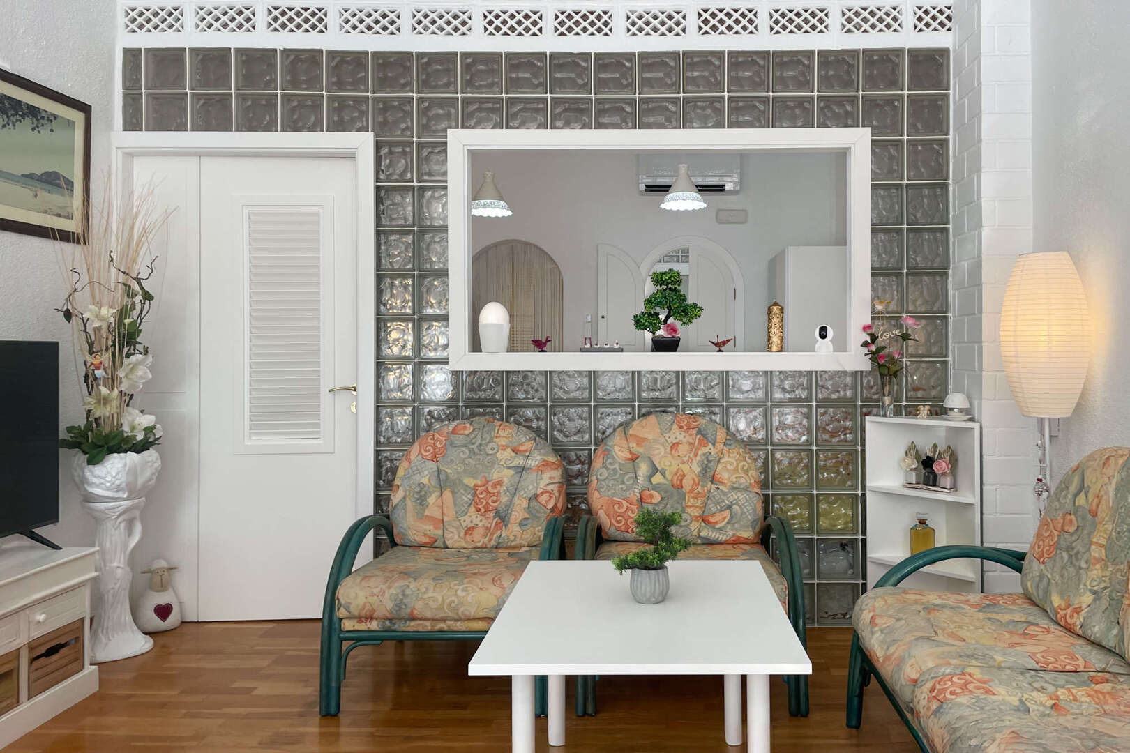 Die Immobilie bietet zwei Zimmer, eines davon ist durch eine Wand aus Glasbausteinen getrennt. Diese Wand kann problemlos entfernt werden, um den Raum zu vergrößern. Der Wohnbereich ist besonders hell und besticht durch große Fenster- und Türanlagen aus isolierverglastem Kunststoff, die auf die geräumige Terrasse führen.