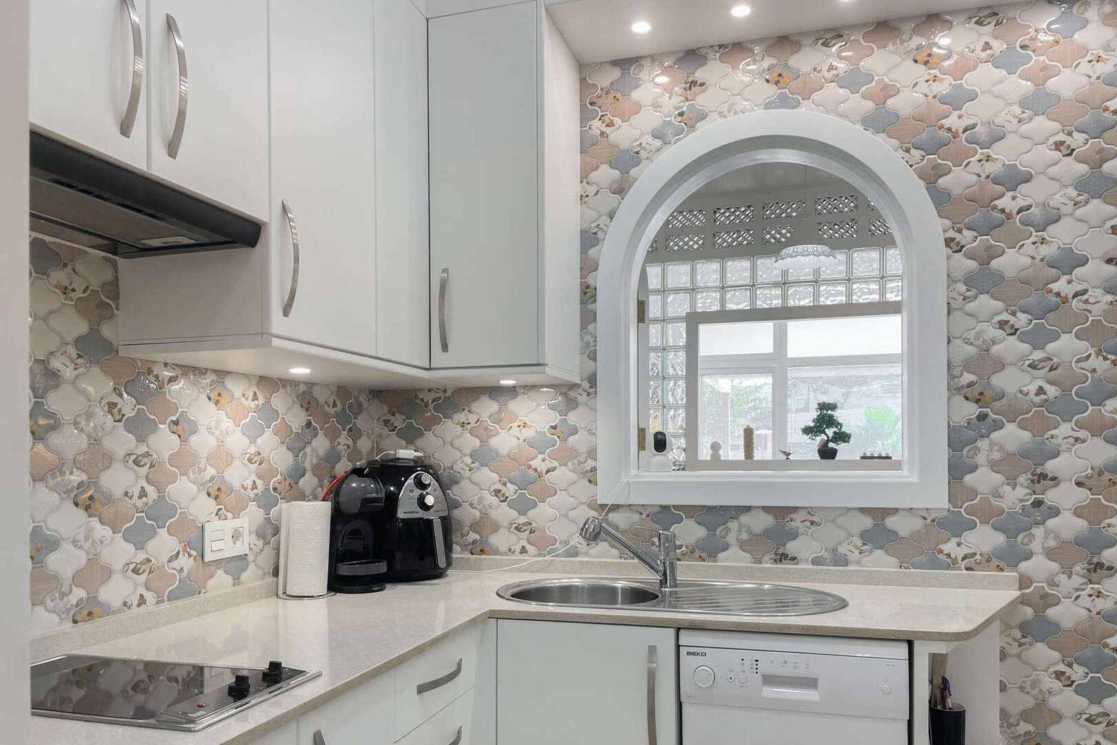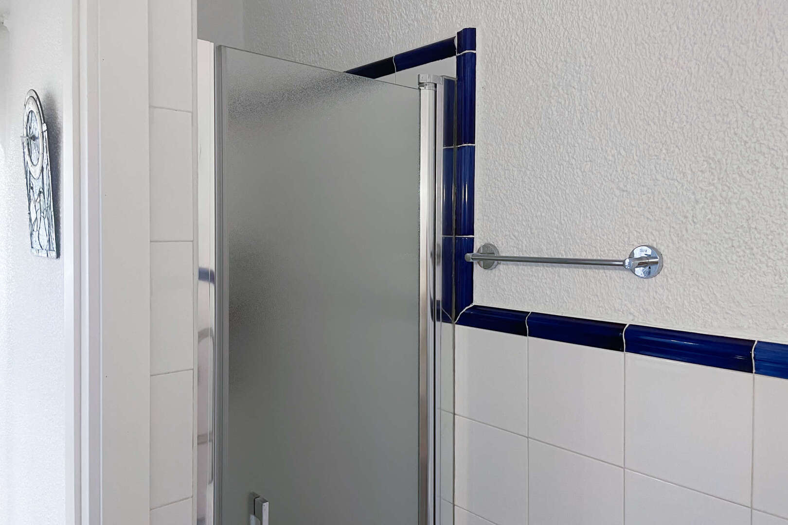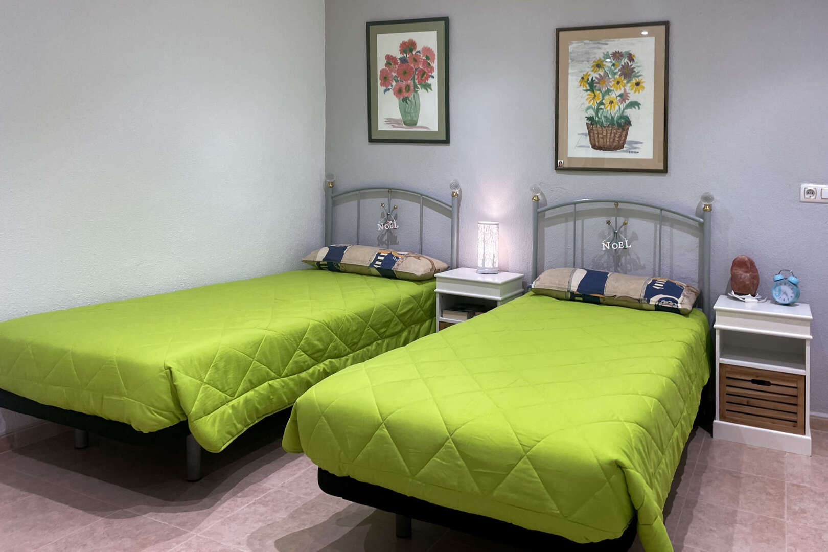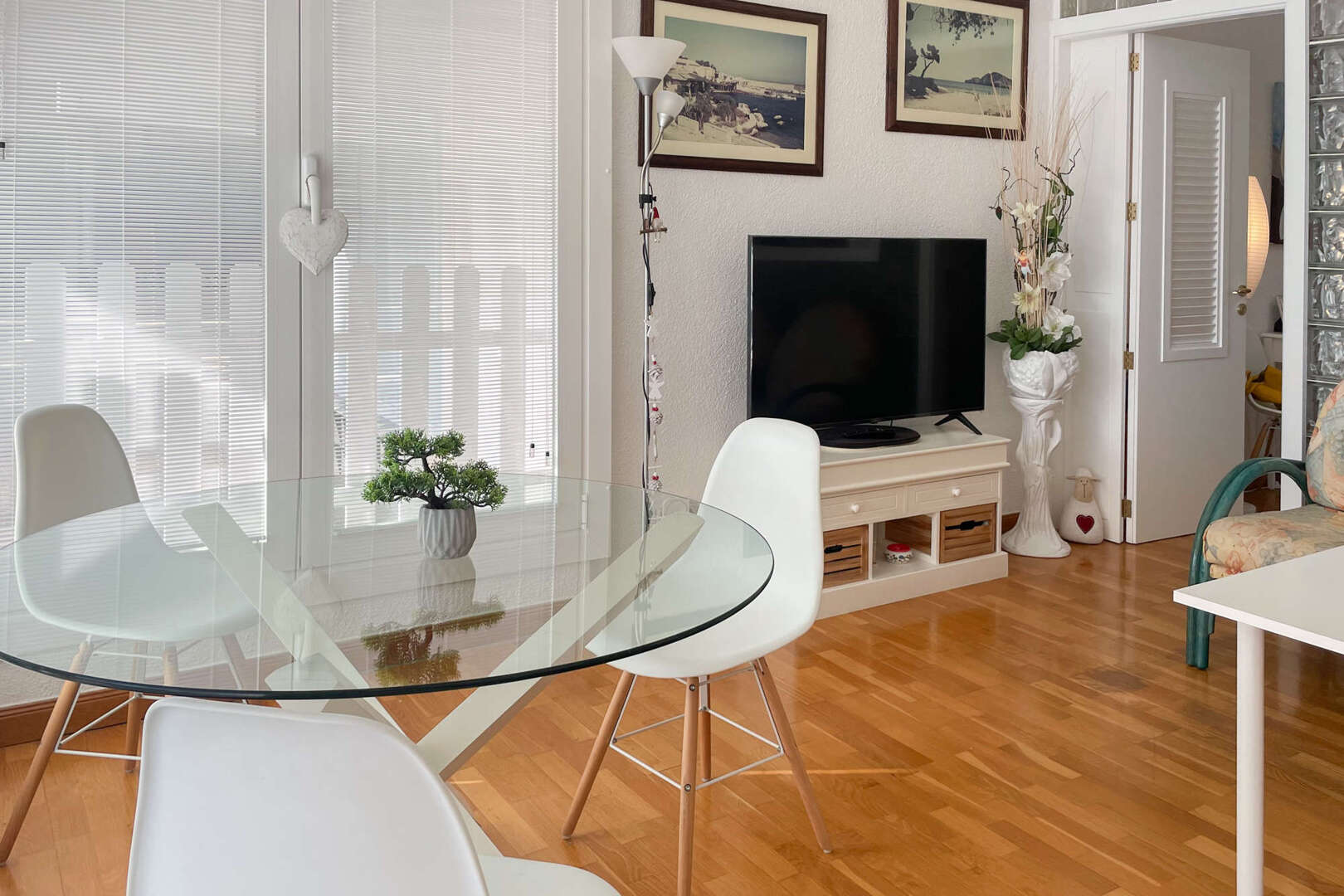 Die Immobilie bietet zwei Zimmer, eines davon ist durch eine Wand aus Glasbausteinen getrennt. Diese Wand kann problemlos entfernt werden, um den Raum zu vergrößern. Der Wohnbereich ist besonders hell und besticht durch große Fenster- und Türanlagen aus isolierverglastem Kunststoff, die auf die geräumige Terrasse führen.