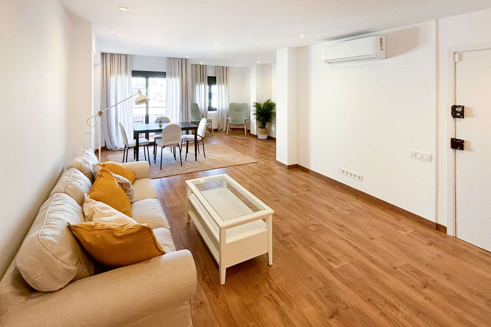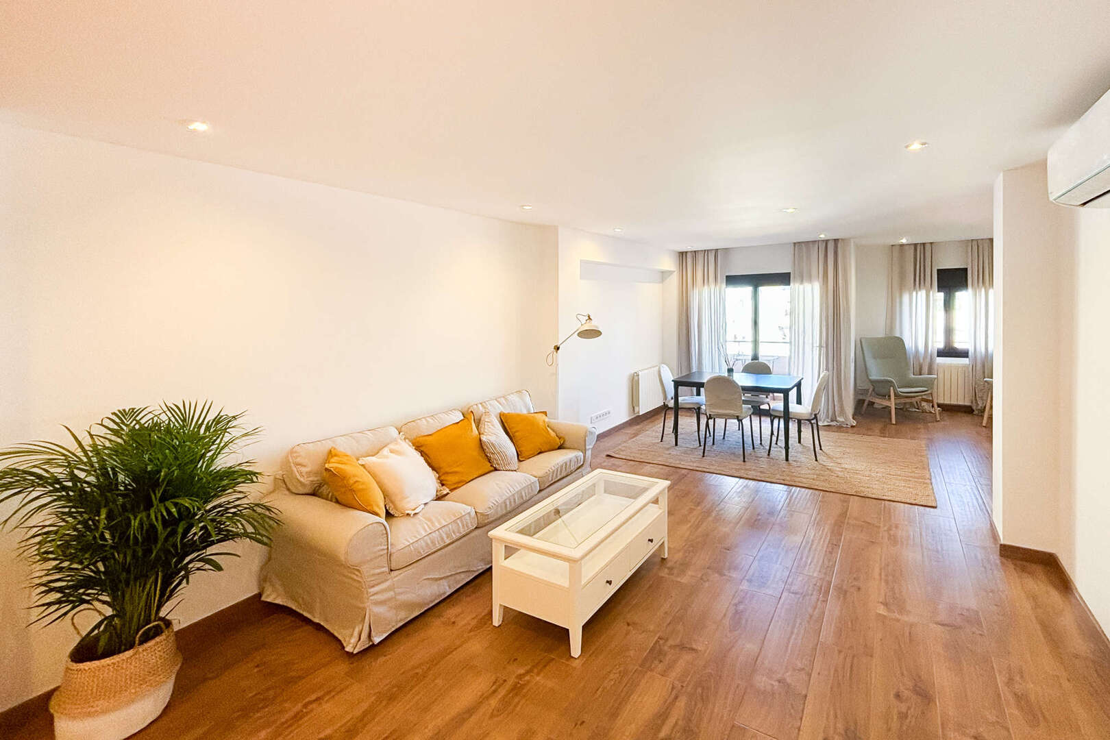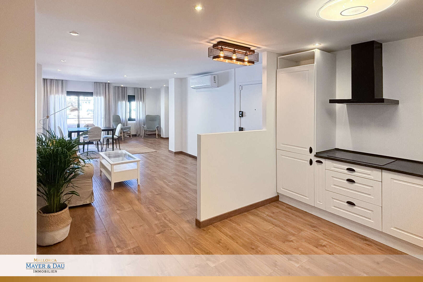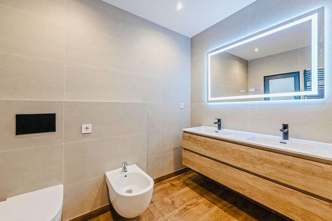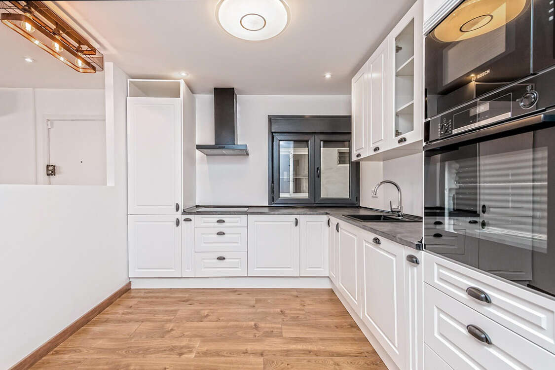 Die Wohnung besticht durch zwei ansprechend gestaltete Schlafzimmer mit komfortablen Doppelbetten und zwei stilvollen Bädern, von denen eines en-suite ist. Ein großzügiger, begehbarer Kleiderschrank sorgt für reichlich Stauraum und trägt zu einem aufgeräumten Wohnambiente bei. Hochwertige Fliesenböden, eine effiziente Heizkörperheizung sowie eine Klimaanlage mit Warm- und Kaltfunktion gewährleisten zu jeder Jahreszeit ein angenehmes Raumklima. Die doppelt verglasten Fenster bieten zusätzliche Ruhe und eine hervorragende Isolierung. Diese Wohnung vereint modernen Wohnkomfort mit einer erstklassigen Lage und ist ideal als Ganzjahresdomizil.