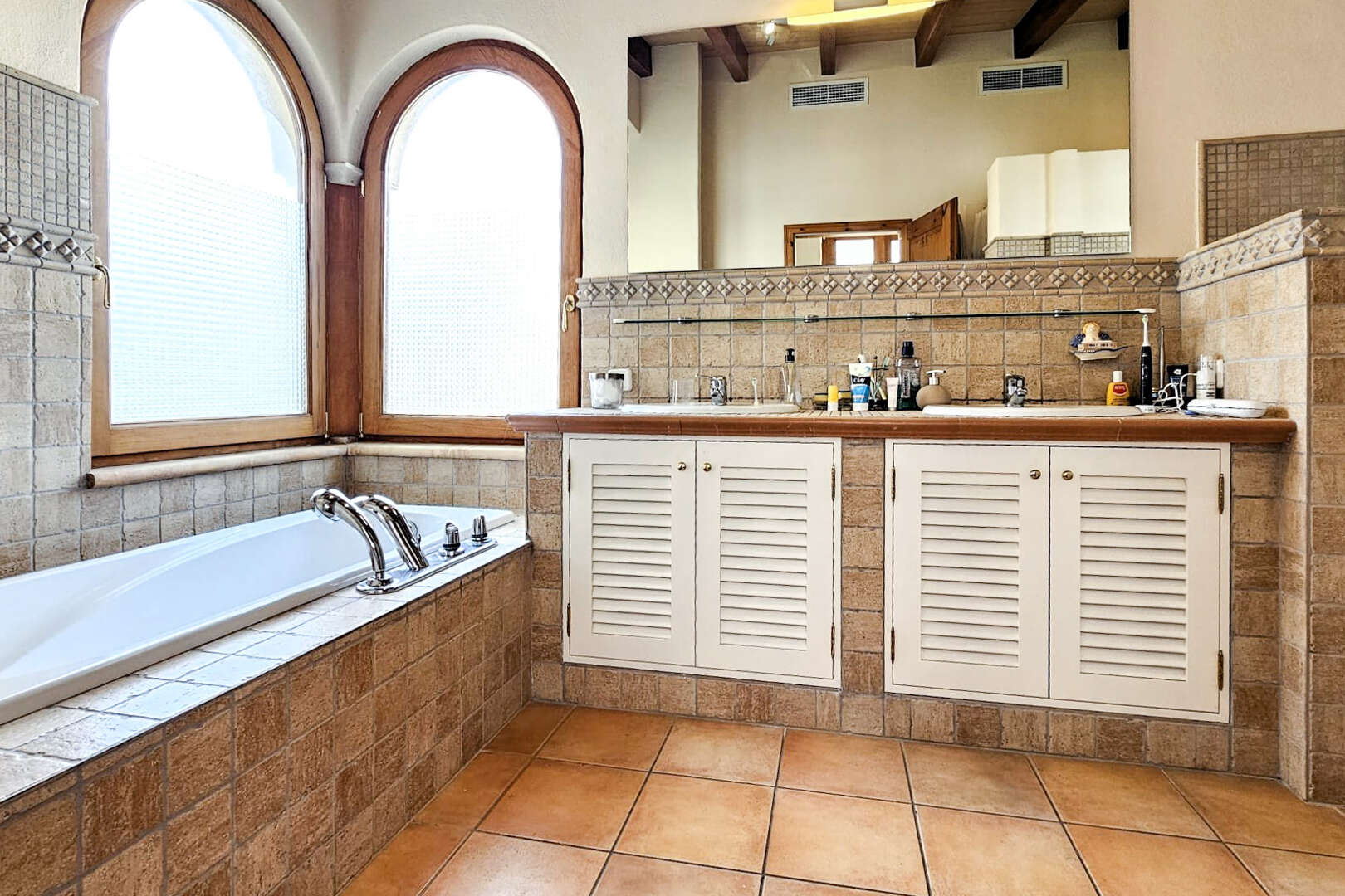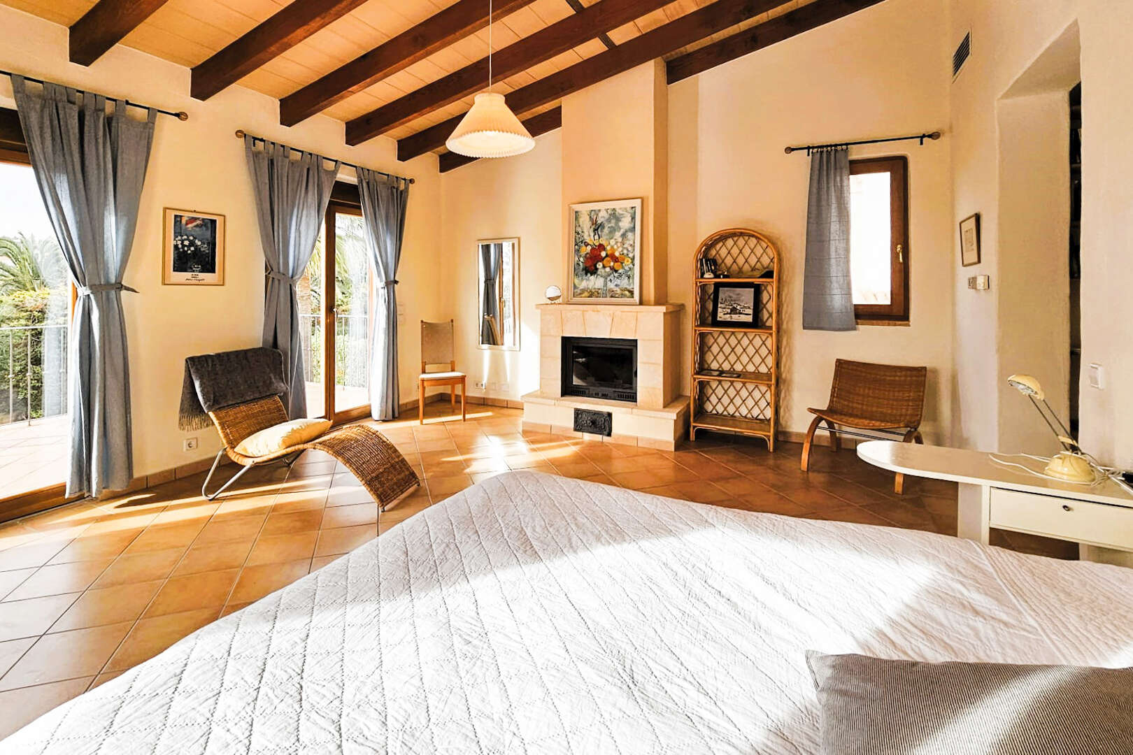 Im Obergeschoss befinden sich vier Schlafzimmer mit hohen, Fincaartigen Holzbalken und drei Badezimmer.