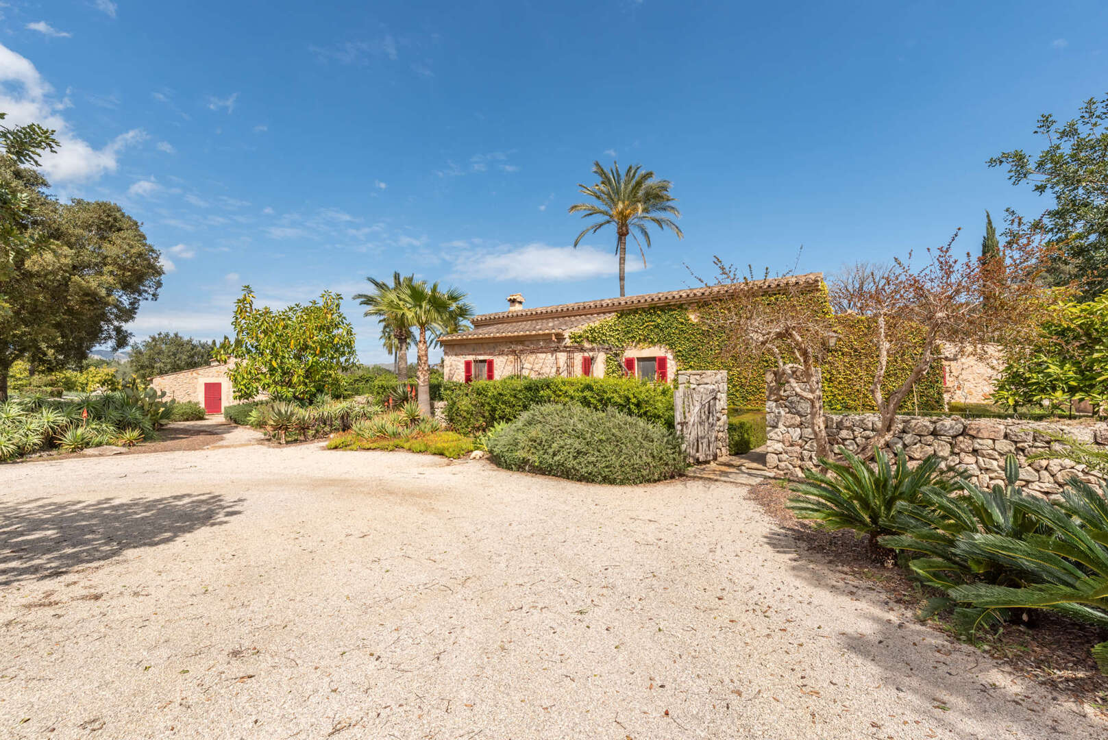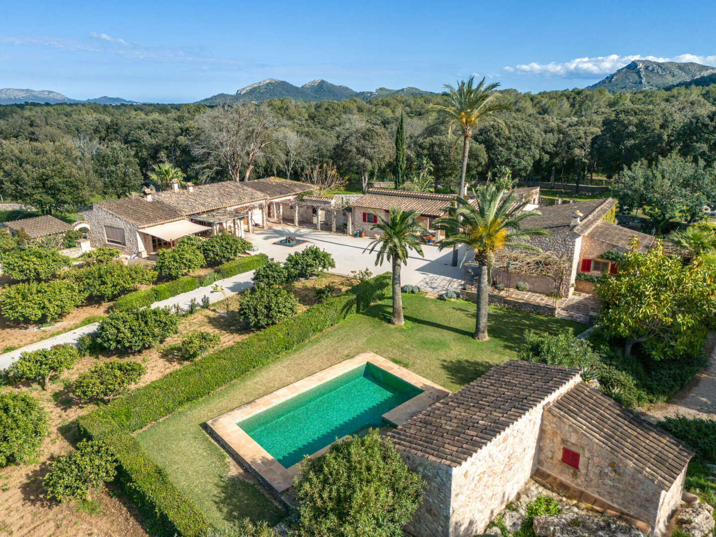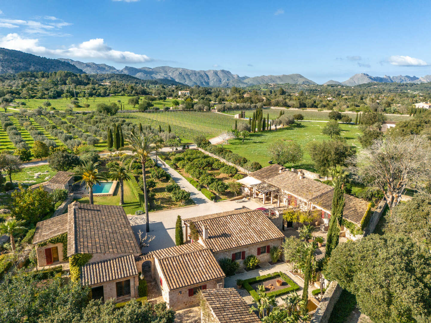 Mitten in der malerischen Hügellandschaft von Pollensa, im Norden Mallorcas, liegt dieses außergewöhnliche Weinberg-Anwesen, ein Rückzugsort für Natur- und Weinliebhaber. Auf einem 17 Hektar großen Grundstück vereint die Finca luxuriöses Wohnen mit mediterranem Charme und nachhaltiger Landwirtschaft. Sechs Hektar Agrarland beherbergen Weinberge, Oliven- und Zitronenbäume, während 11 Hektar privater Wald zu Spaziergängen und Reitausflügen einladen.