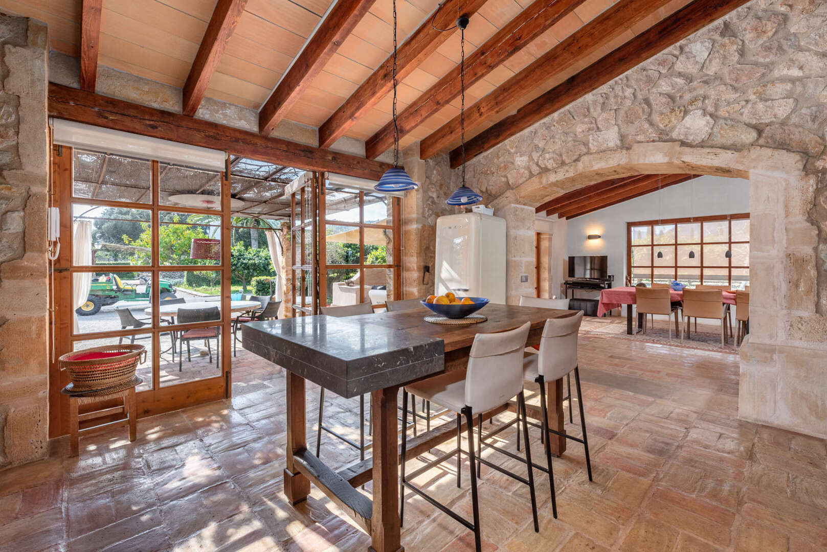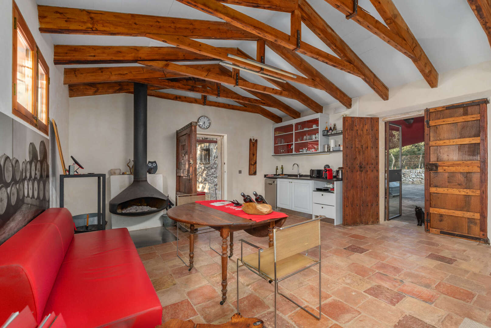 Der in U-Form angelegte Wohnkomplex bietet großzügige Gemeinschaftsräume und private Rückzugsbereiche. Herzstück ist die weitläufige Gemeinschaftsküche mit Essbereich, Kamin und angrenzender Außenterrasse mit Sommerküche. Das Masterapartment verfügt über eigene Küche, Schlafzimmer mit Kamin, Arbeitszimmer, Bad en Suite und Terrasse mit Panoramablick. Weitere Apartments bieten Platz für Gäste oder Mitarbeiter, eine Garage kann als Fitnessbereich genutzt werden.