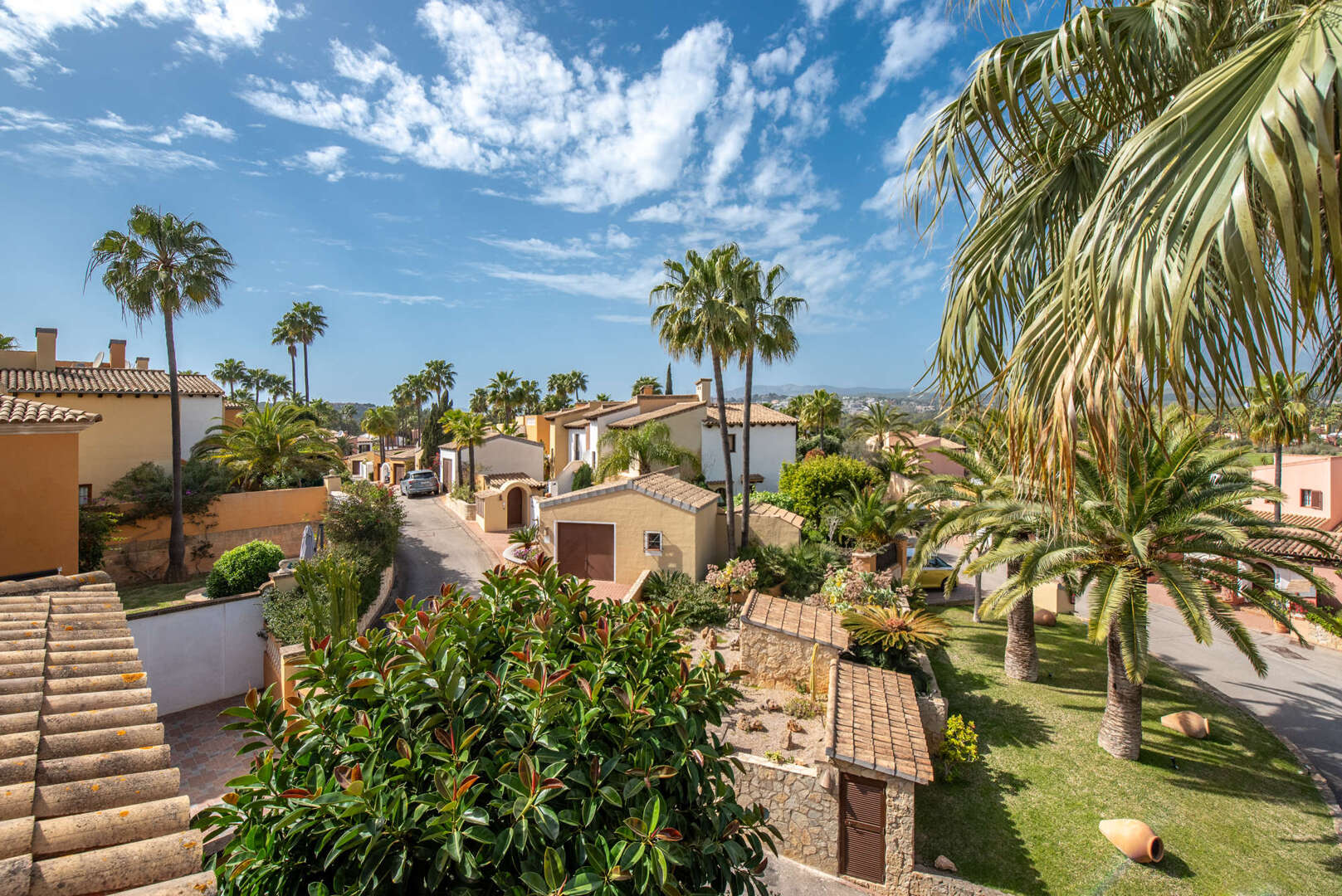 Die Fassade des Hauses präsentiert sich in typischen mallorquinischen Erdtönen mit traditionellen Fensterläden und einem einladenden Eingangsbereich. Die gepflegte Gartenanlage und die großzügigen Terrassenflächen fügen sich harmonisch in die mediterrane Umgebung ein und bieten einen malerischen Ausblick auf den Golfplatz.