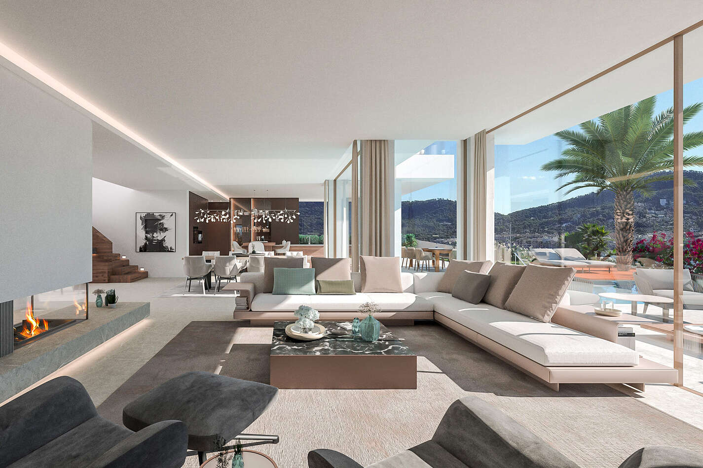 Nachhaltigkeit spielt eine zentrale Rolle: Eine 30 kW Photovoltaikanlage mit Speicher sorgt für eine effiziente und umweltfreundliche Energieversorgung. Die Villa wird mit einer exklusiven Inneneinrichtung von **Terraza Balear** ausgestattet, die perfekt auf den mediterranen Lebensstil abgestimmt ist und das luxuriöse Ambiente unterstreicht.