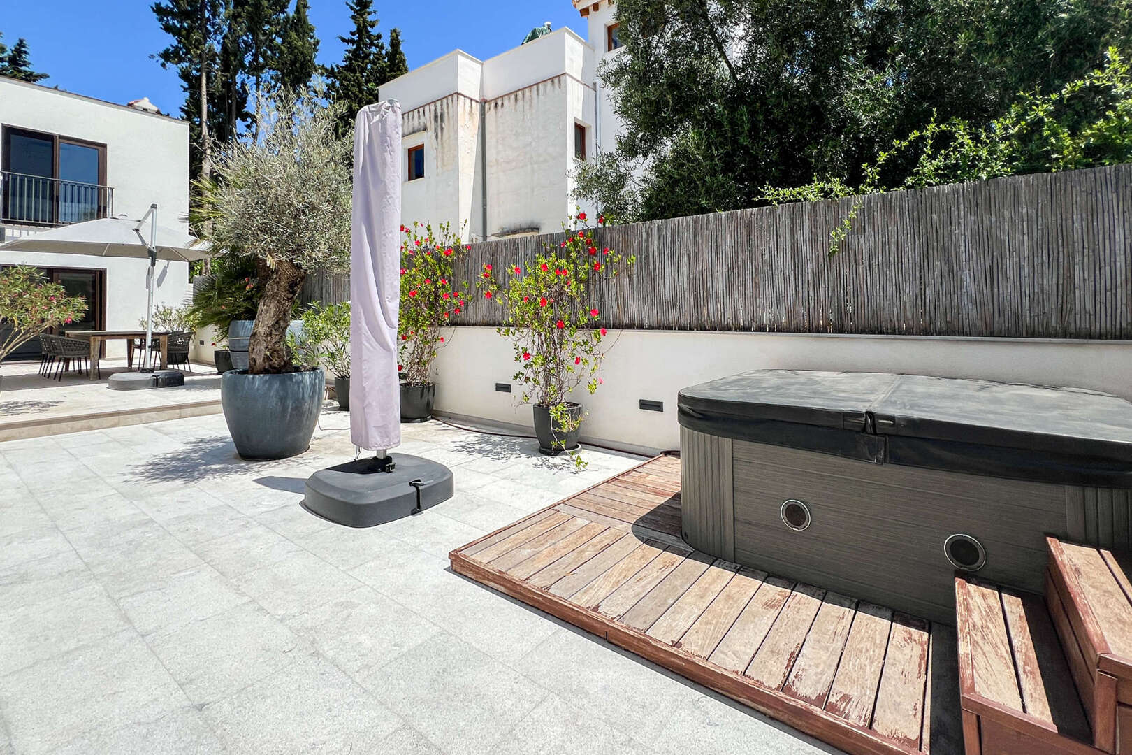 Besonders ansprechend ist die schöne Terrasse mit Jacuzzi und der private Balkon, die zum Entspannen und Genießen des mediterranen Klimas einladen – alles in einer ruhigen und gepflegten Wohnlage.
