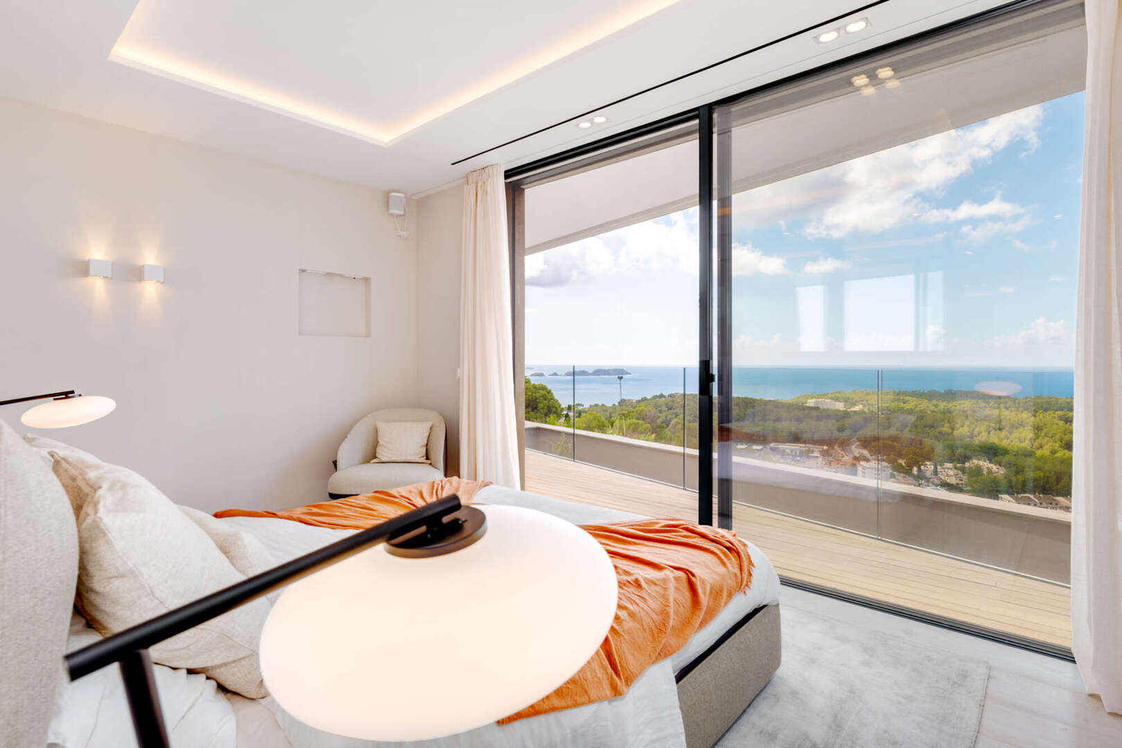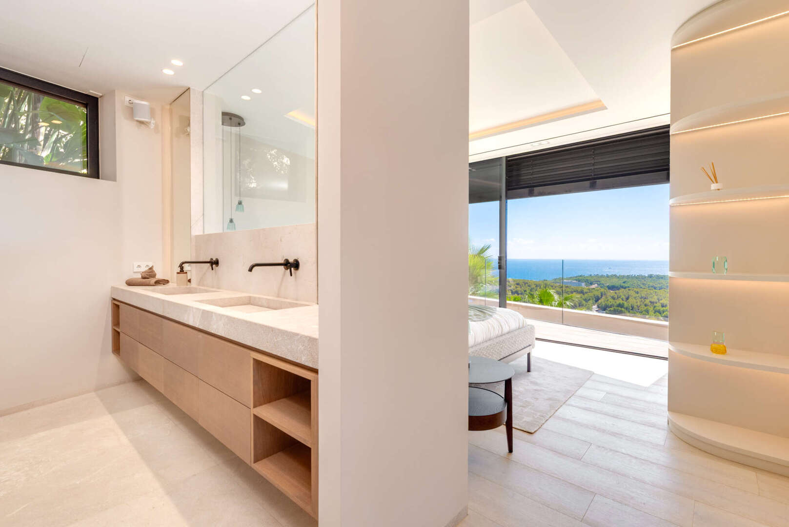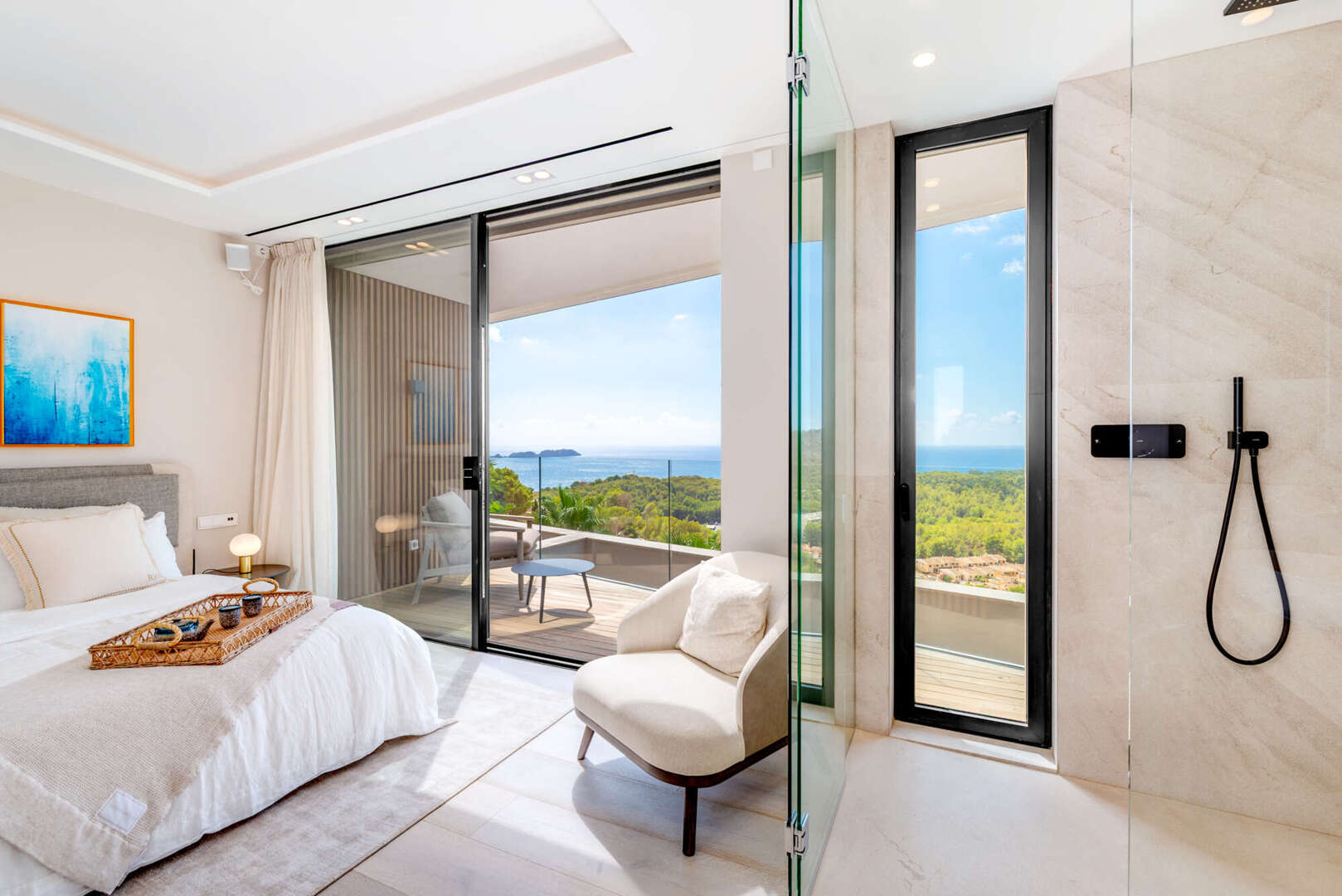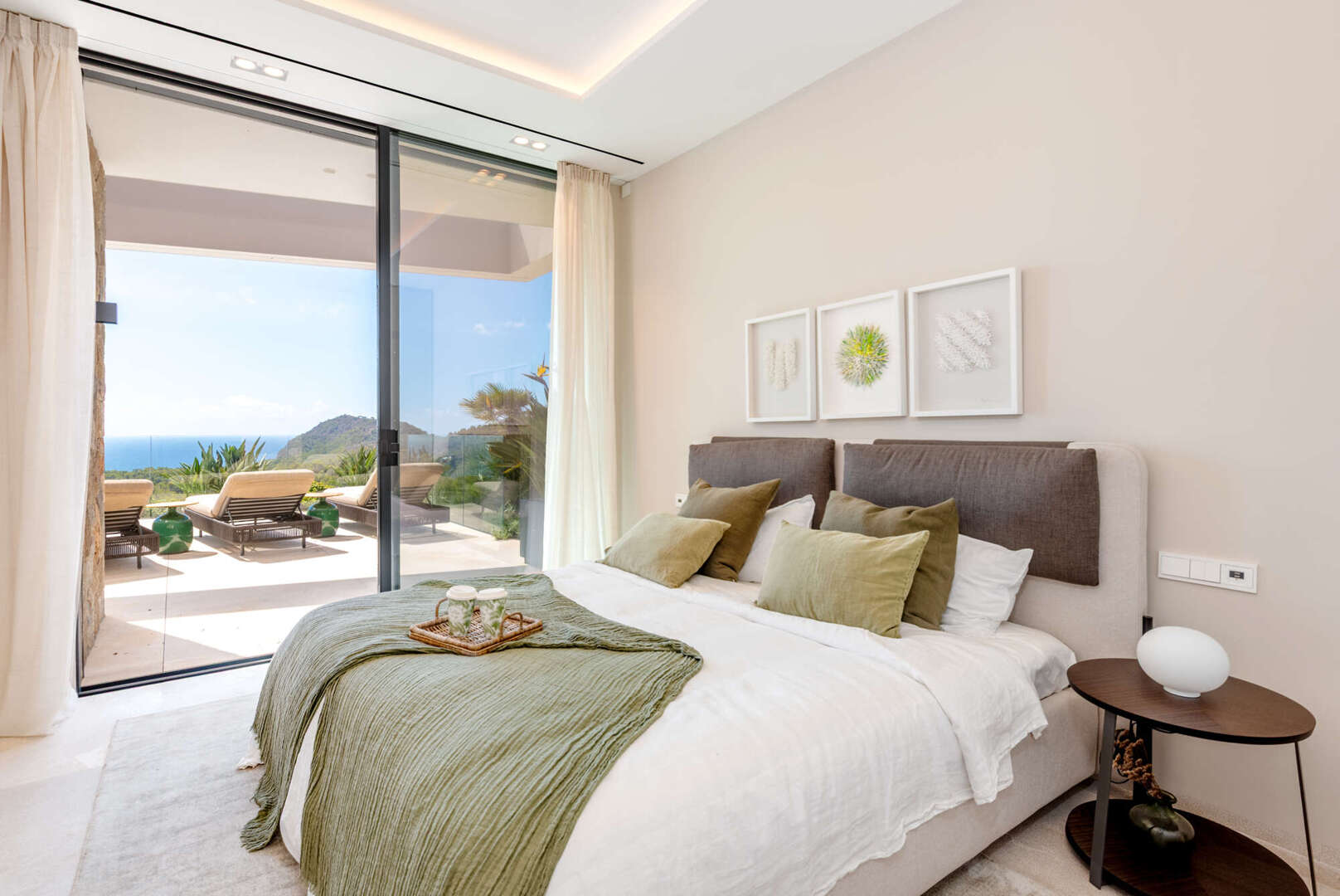 Das Obergeschoss empfängt Sie mit einem großzügigen Eingangsbereich und drei eleganten Schlafzimmern, alle mit Bad en Suite und direktem Zugang zur weitläufigen Terrasse mit Meerblick.