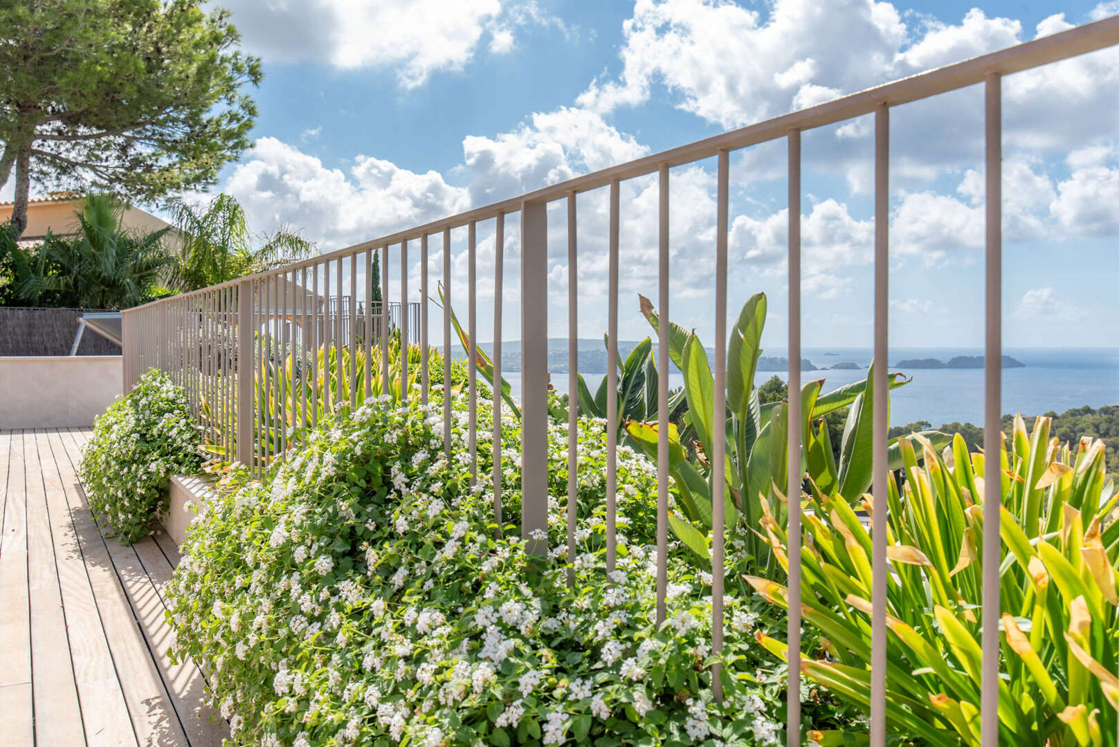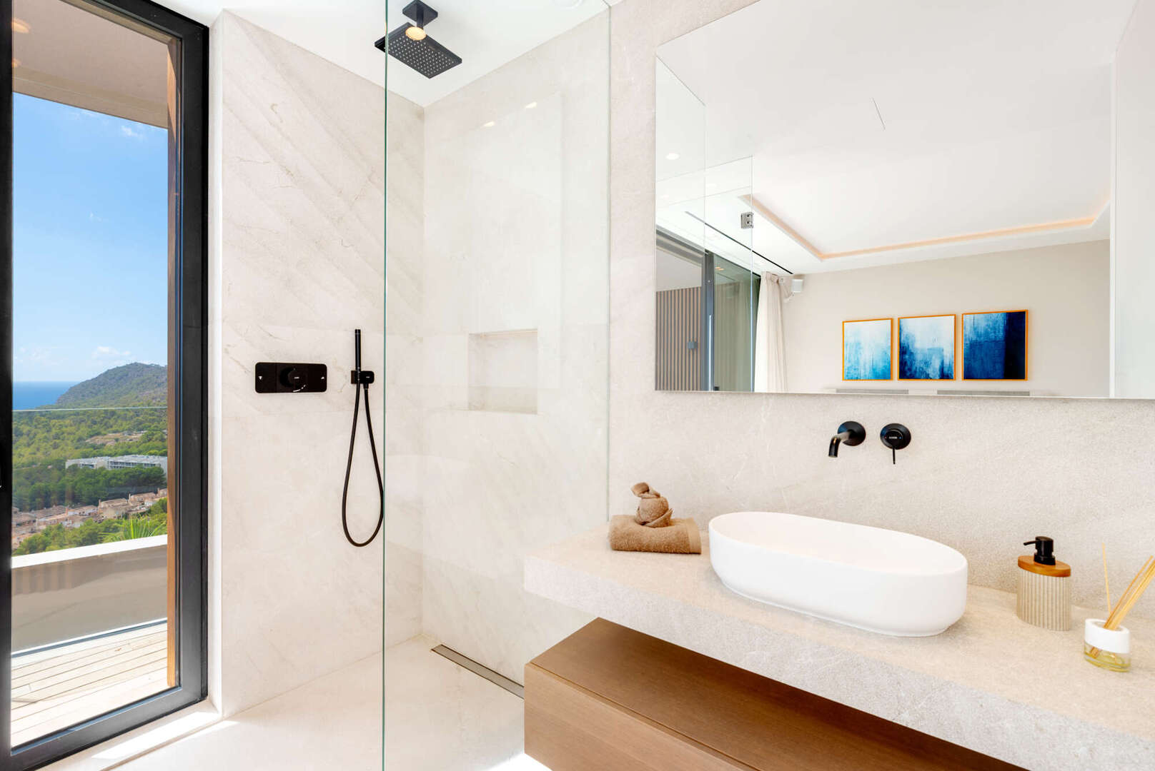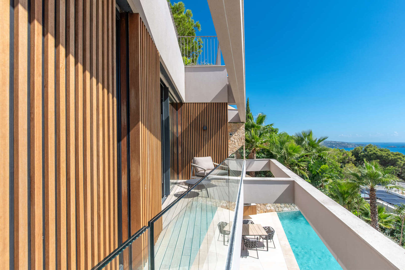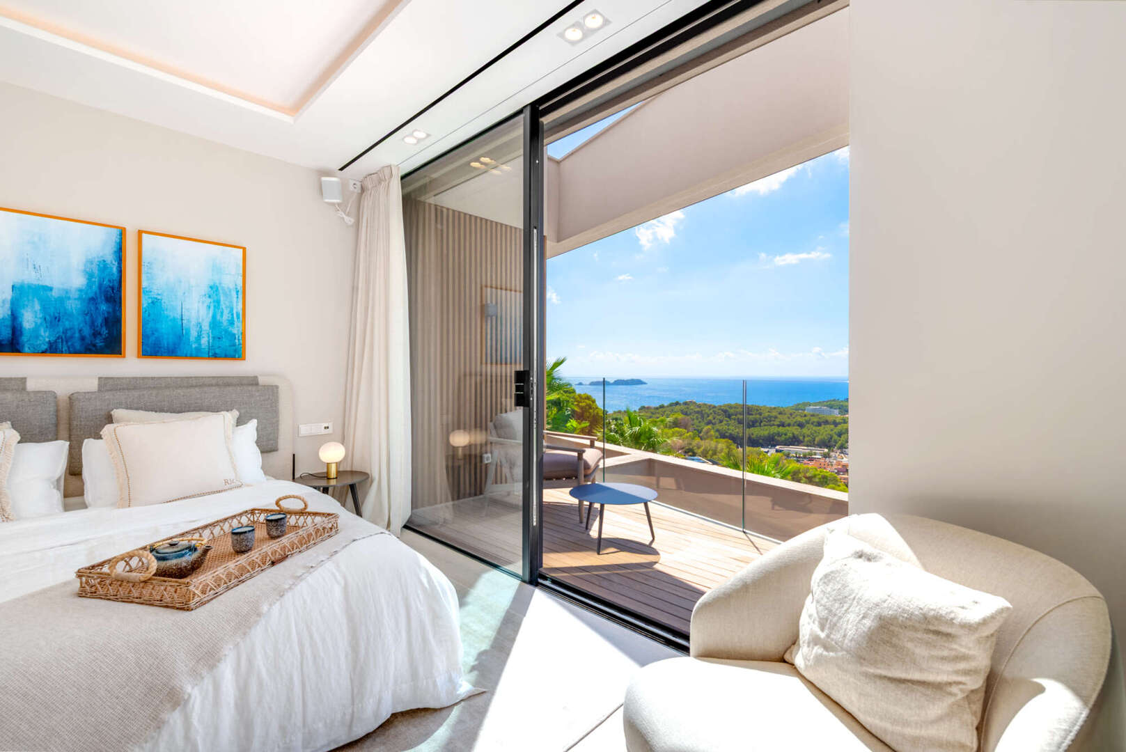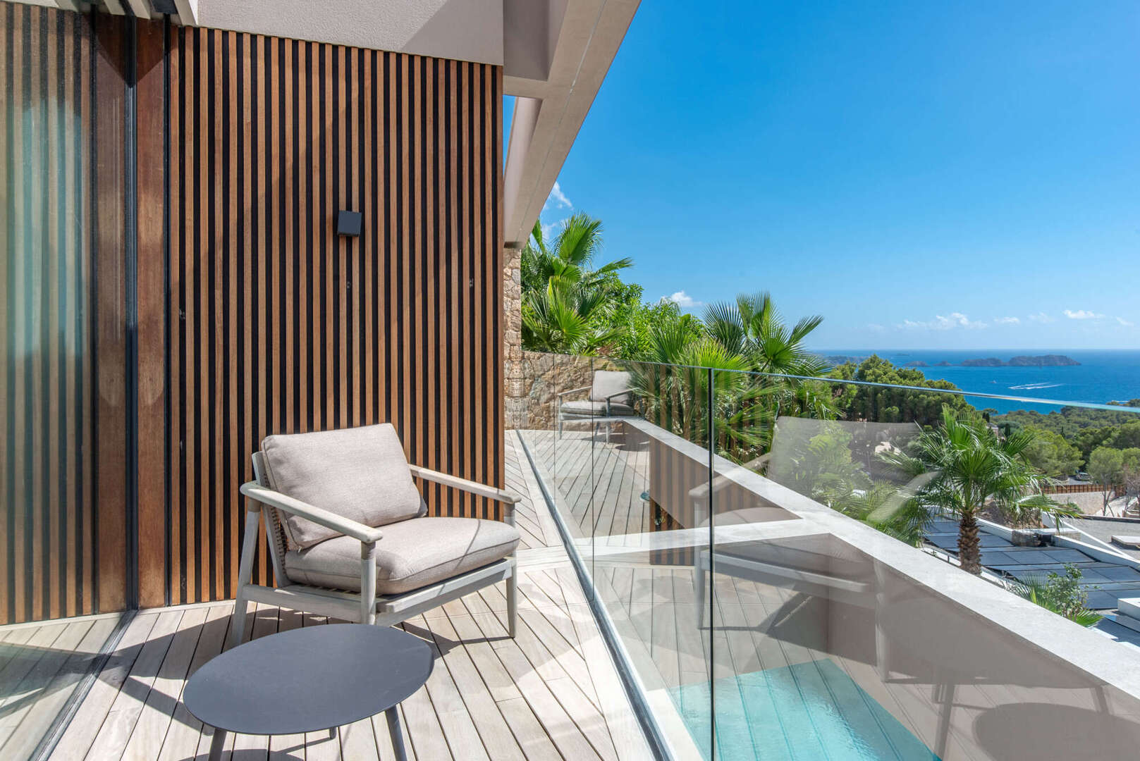 Das Obergeschoss empfängt Sie mit einem großzügigen Eingangsbereich und drei eleganten Schlafzimmern, alle mit Bad en Suite und direktem Zugang zur weitläufigen Terrasse mit Meerblick.