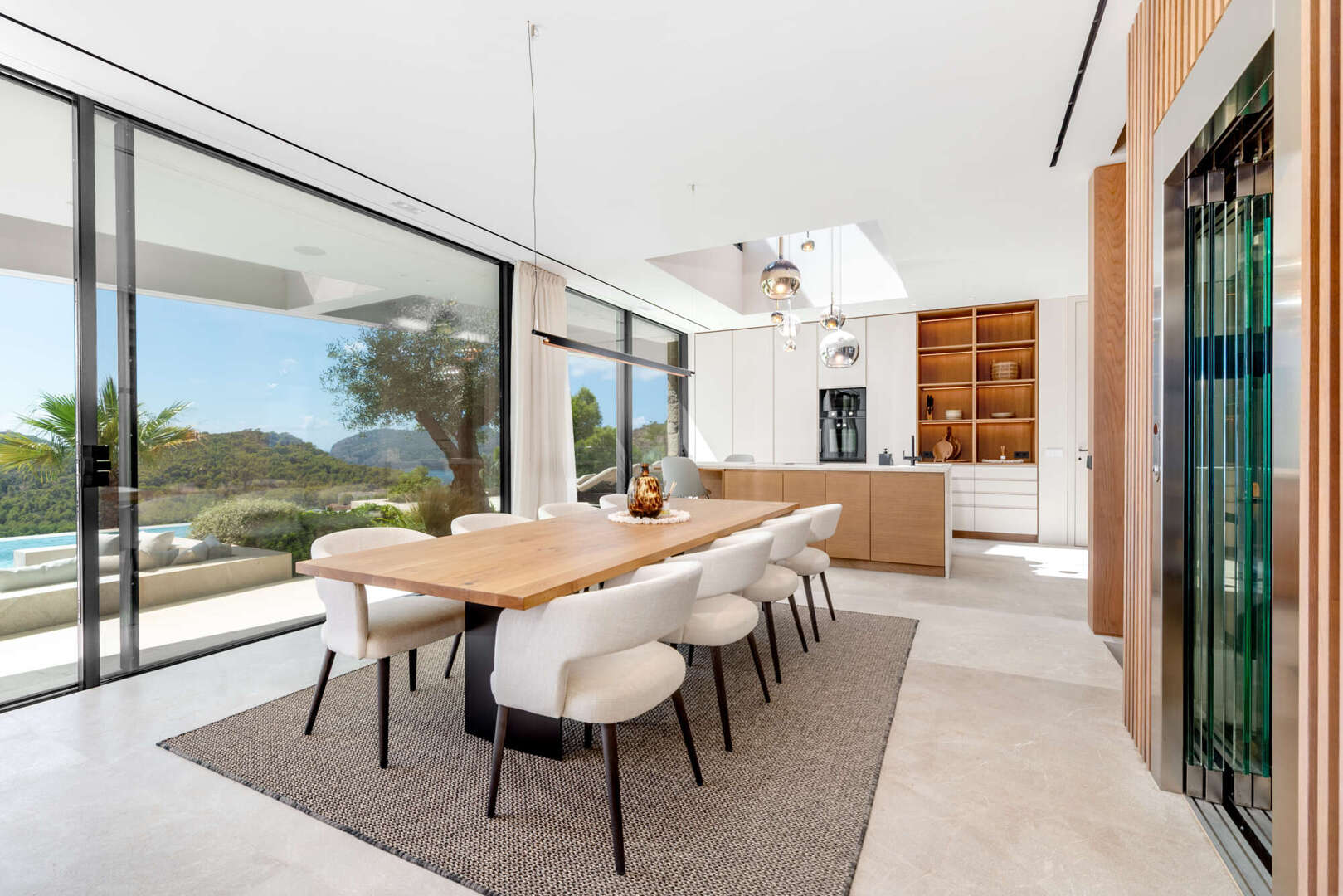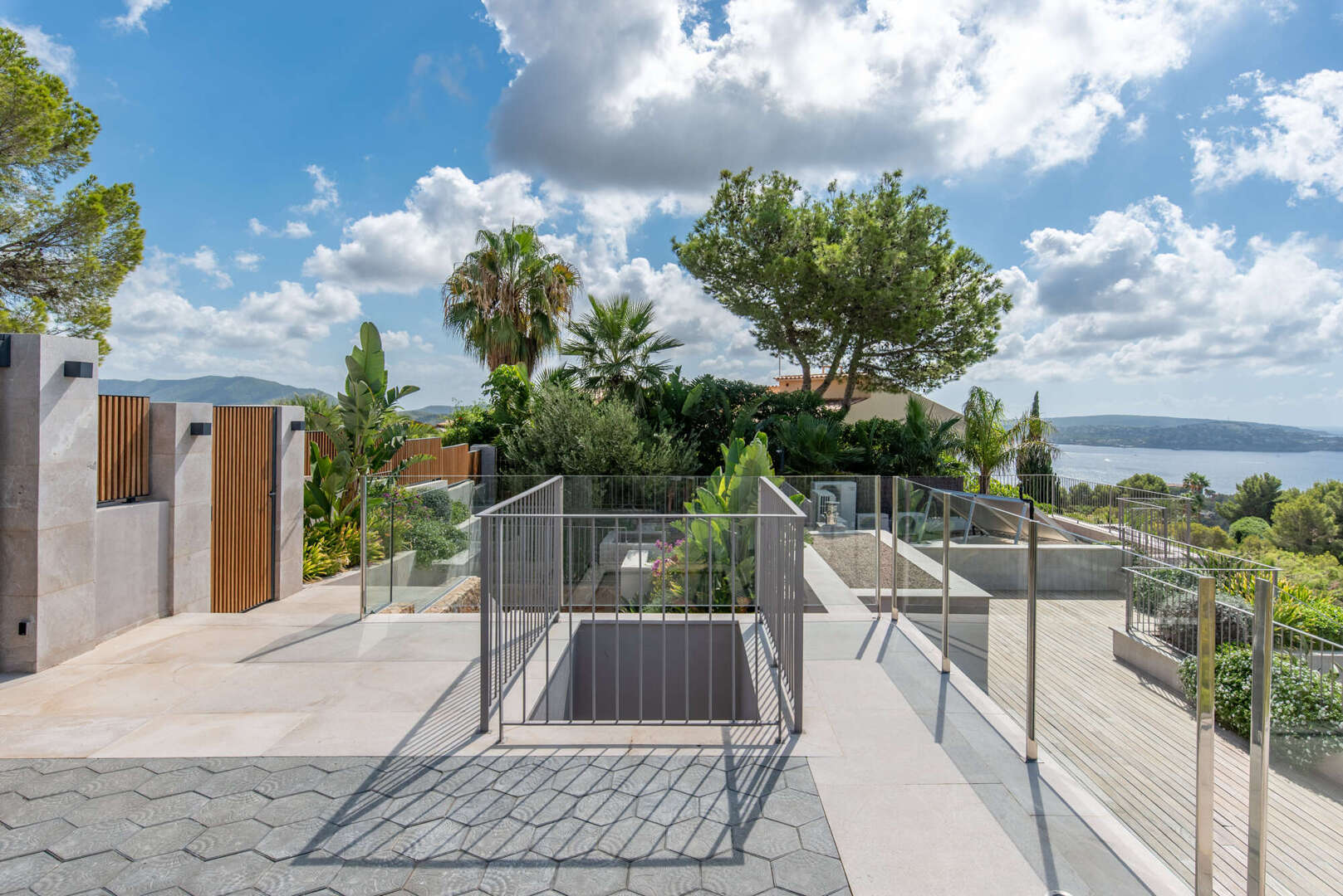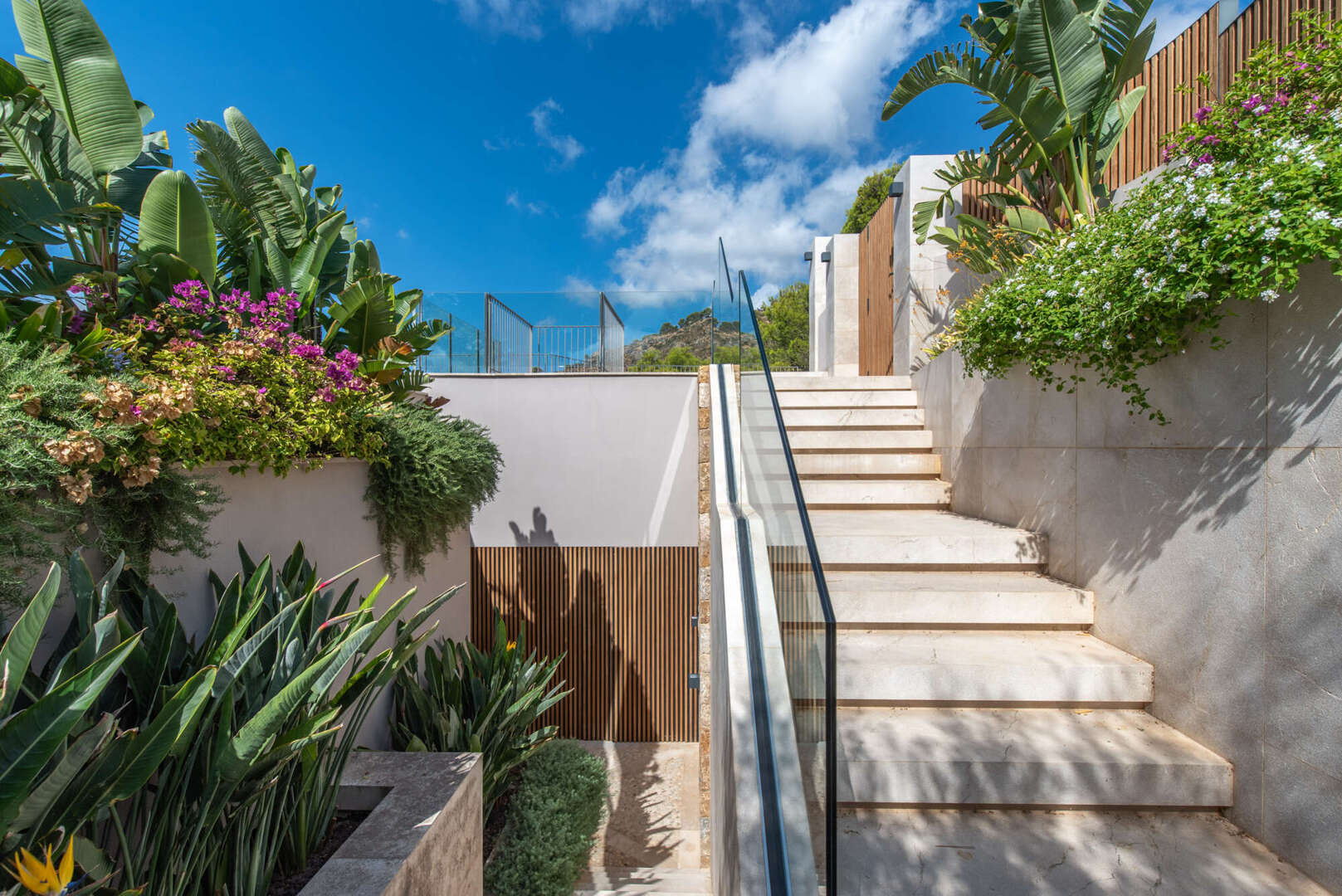 Im Erdgeschoss genießen Sie einen offenen Wohn- und Essbereich mit Gaskamin, eine Designer-Küche mit Bora- und Gaggenau-Geräten, eine stilvolle Bodega, ein Gäste-WC sowie einen Hauswirtschaftsraum. Ebenfalls auf dieser Ebene: ein weiteres Schlafzimmer mit Bad en Suite und ein eindrucksvoller Innenpatio mit Wasserfall.