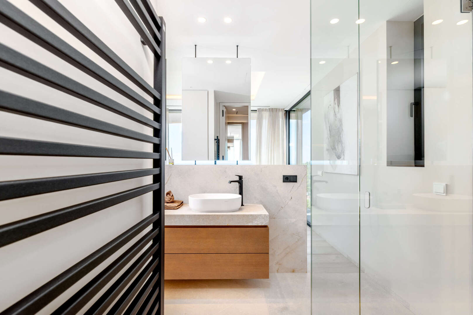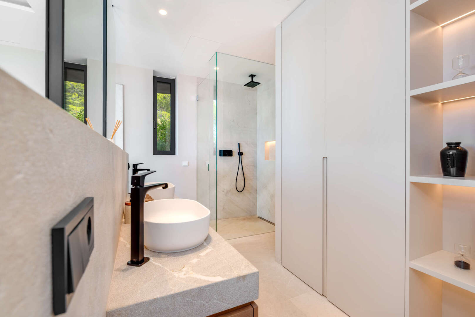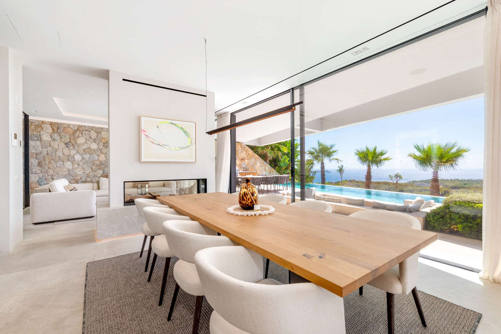 Im Erdgeschoss genießen Sie einen offenen Wohn- und Essbereich mit Gaskamin, eine Designer-Küche mit Bora- und Gaggenau-Geräten, eine stilvolle Bodega, ein Gäste-WC sowie einen Hauswirtschaftsraum. Ebenfalls auf dieser Ebene: ein weiteres Schlafzimmer mit Bad en Suite und ein eindrucksvoller Innenpatio mit Wasserfall.