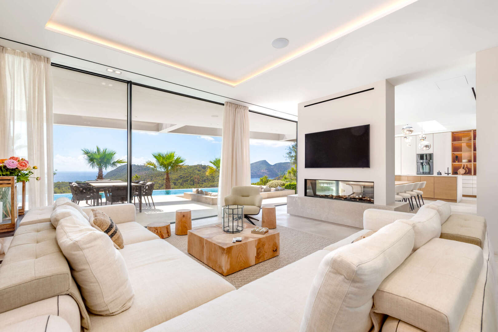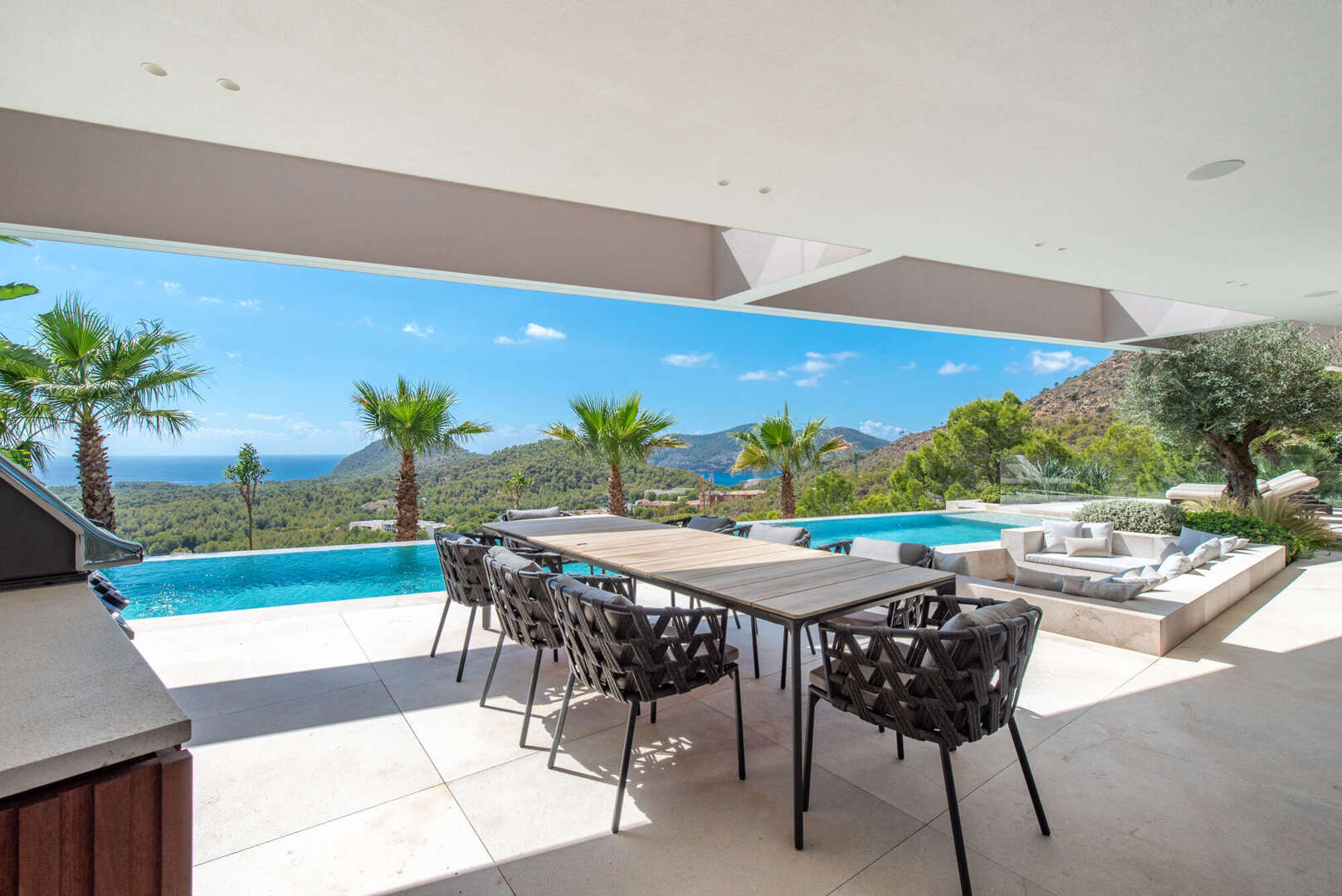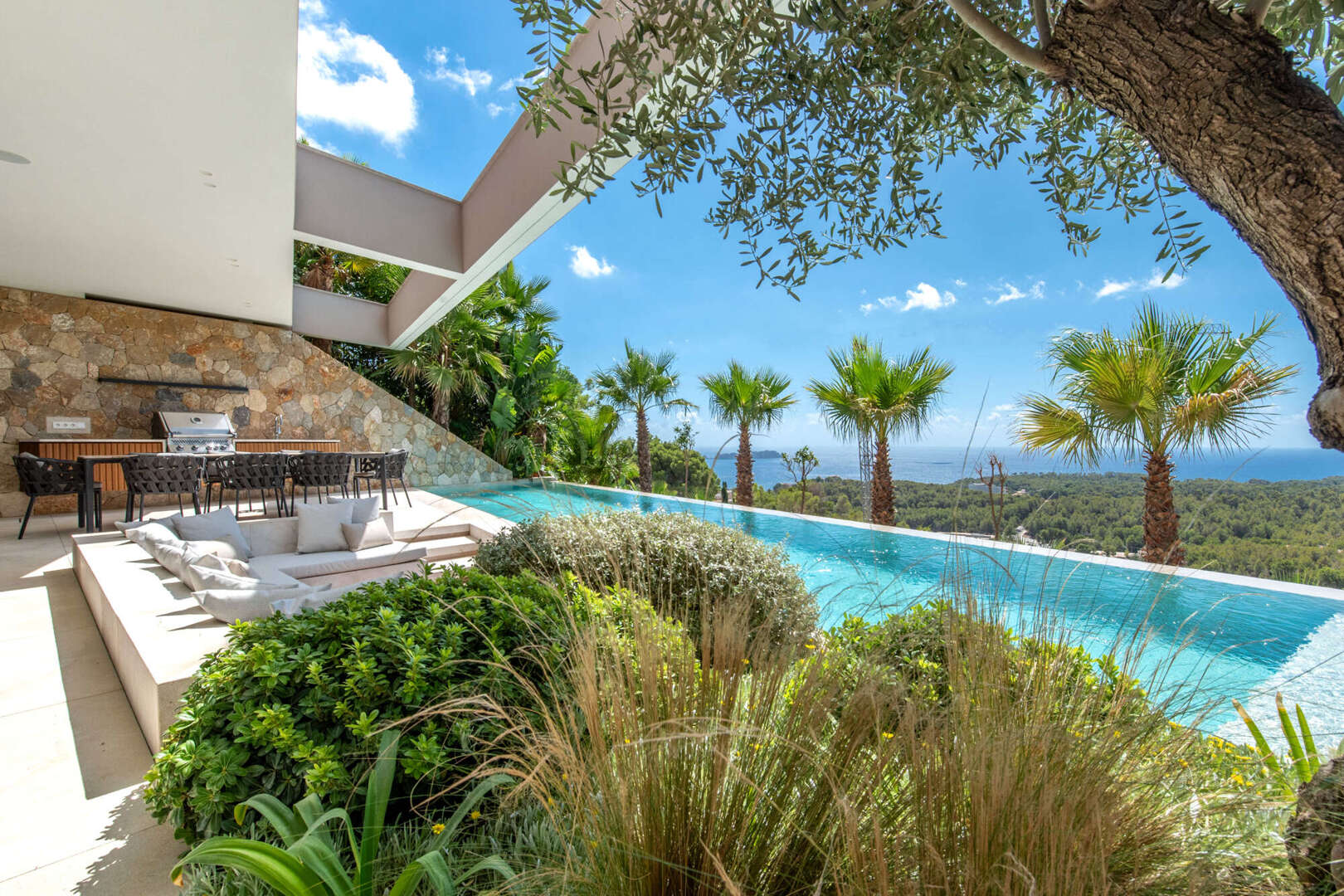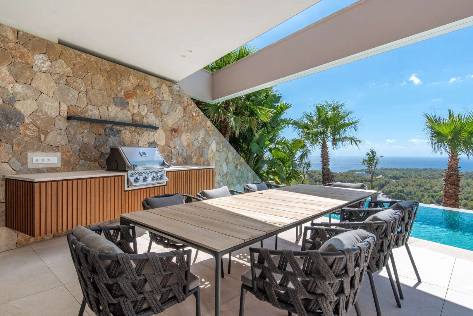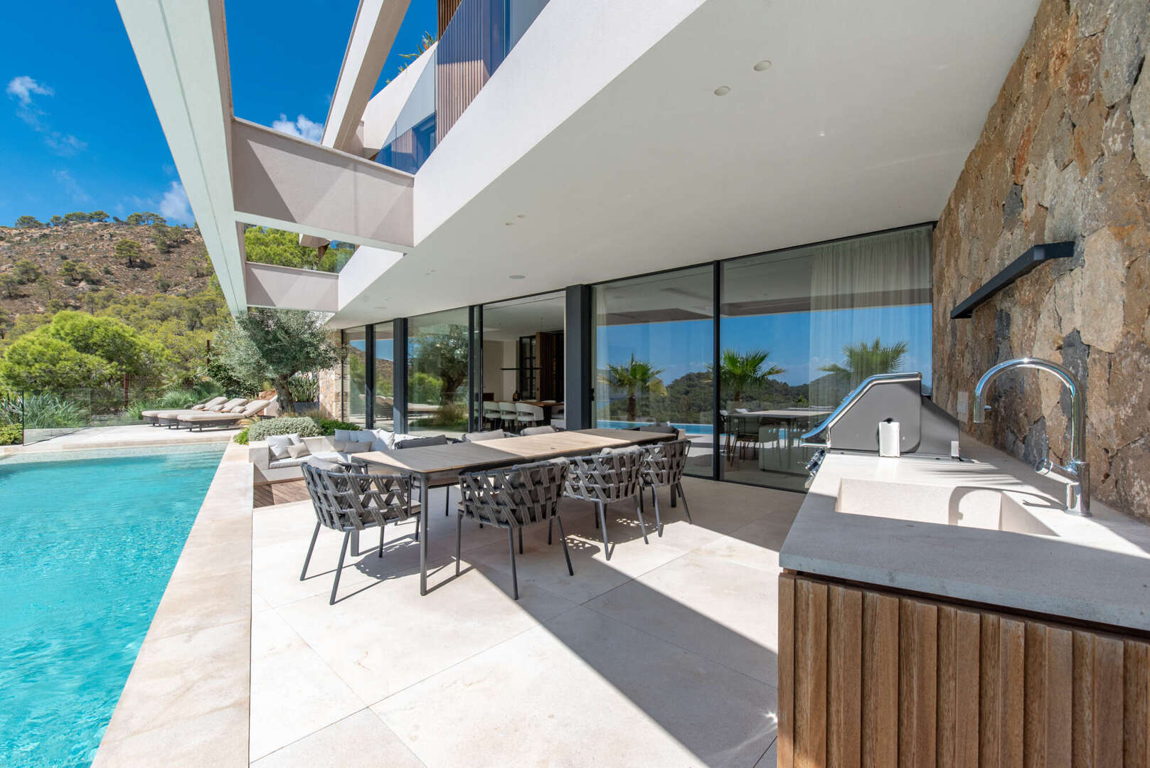Der Außenbereich lädt mit Pool, Sommerküche, Lounge, Feuerstelle und Außendusche zum ganzjährigen Verweilen ein – Ihre private Oase auf Mallorca.