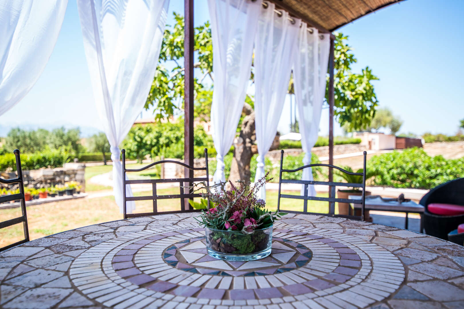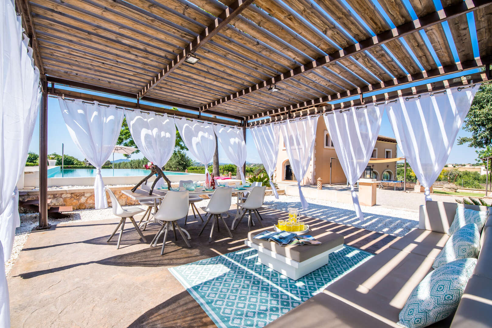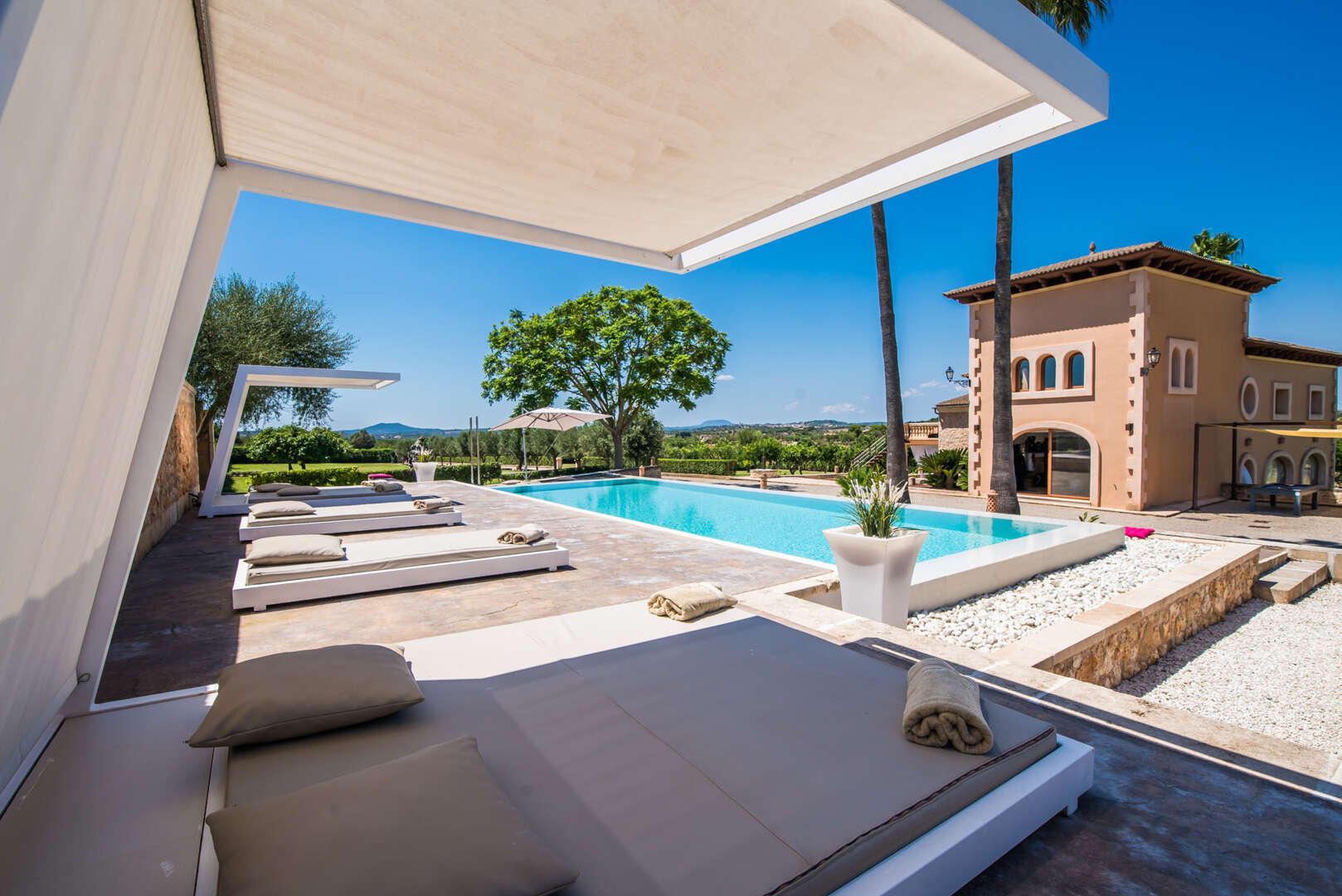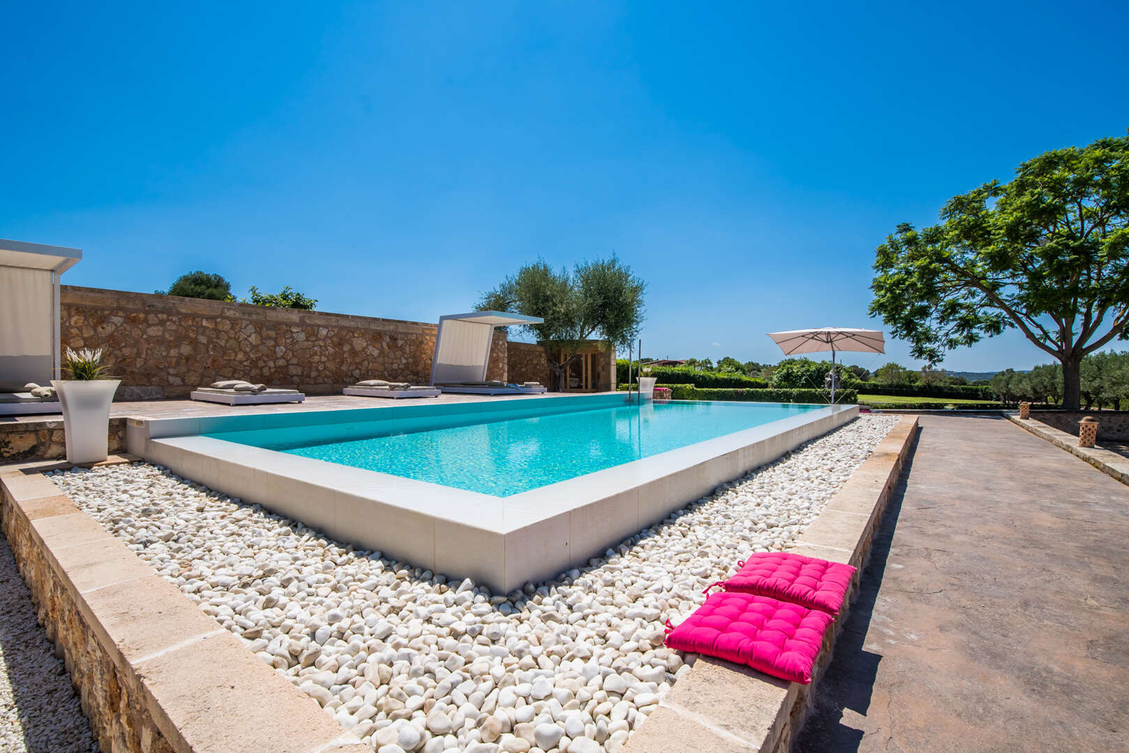 Die Zufahrt? Perfekt. Kein holpriger Feldweg, absolute Ruhe, Natur pur und ein Gefühl von grenzenloser Freiheit. Schon beim Einfahren eröffnet sich ein Panorama, das schwer in Worte zu fassen ist: Das elegante Haupthaus, ein einladender Chill-out-Bereich am großen Pool, das separate Gästehaus, herrliche Gartenanlagen und liebevoll gestaltete Rückzugsorte lassen sofort ein tiefes Gefühl von "Ankommen" entstehen.