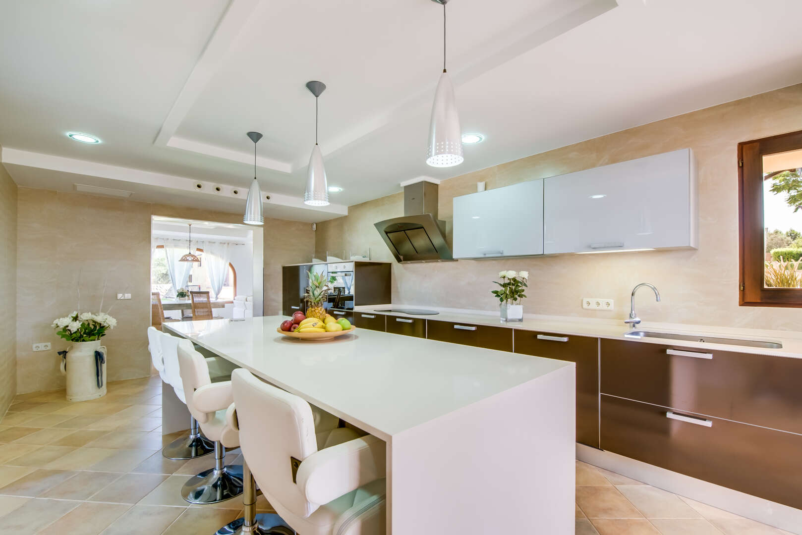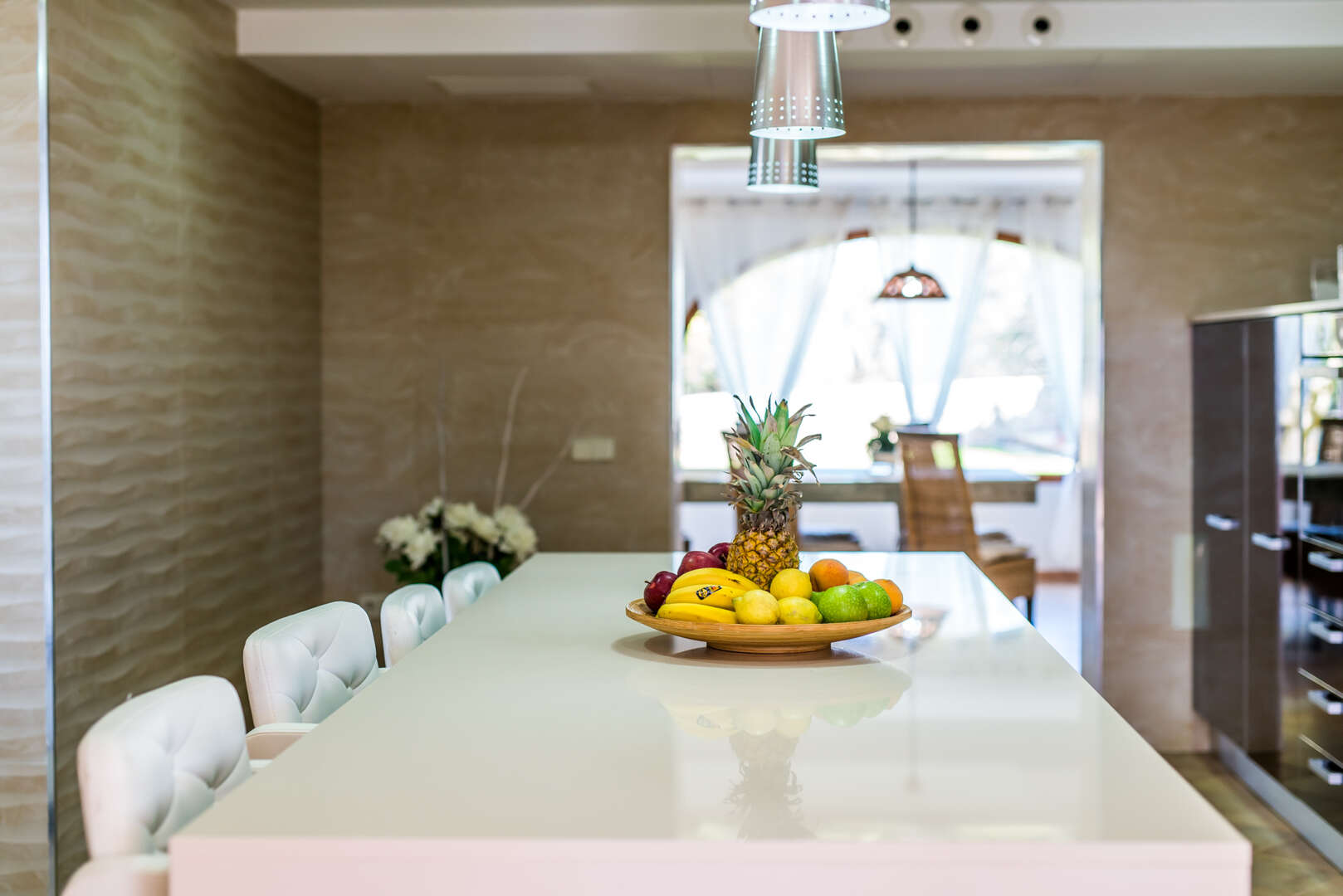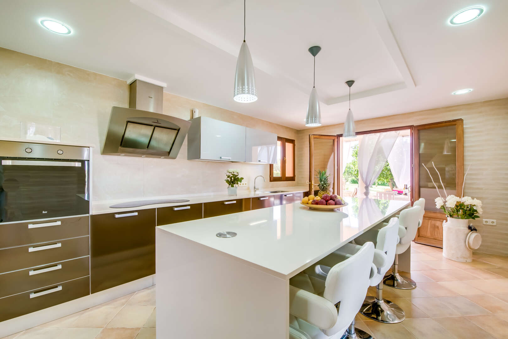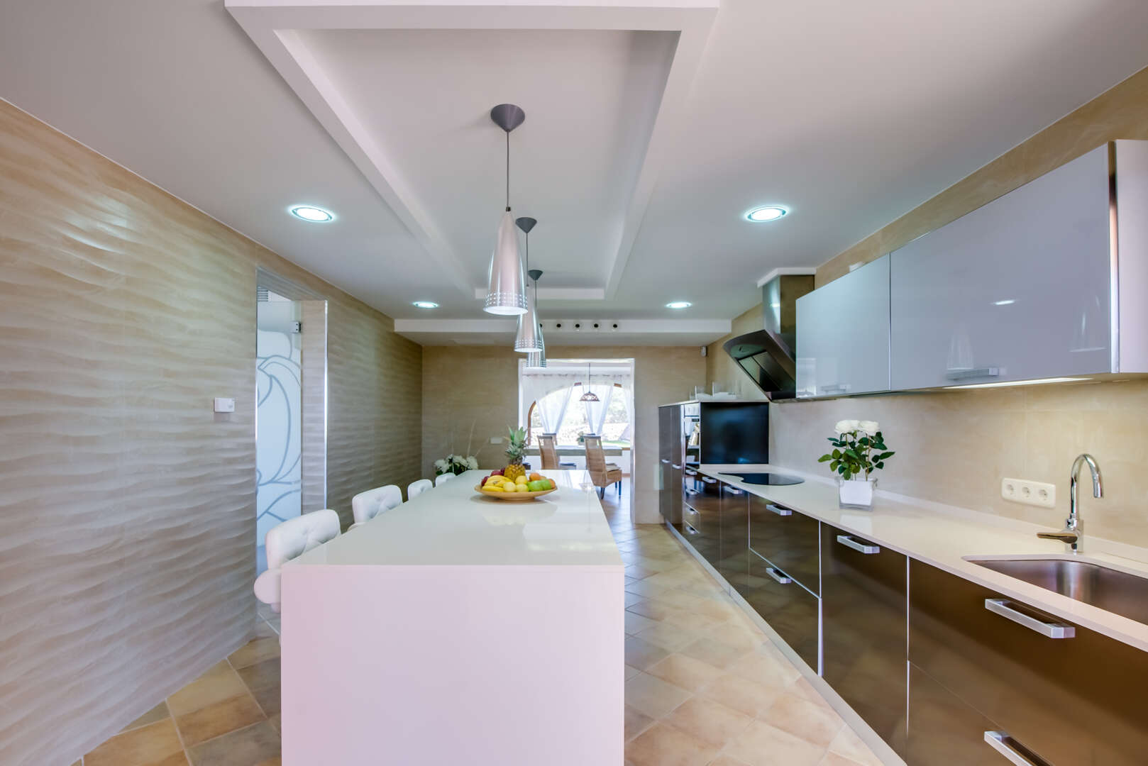 * Offene Designer-Küche mit viel Arbeitsfläche und Tresen – ideal für gemeinsames Kochen