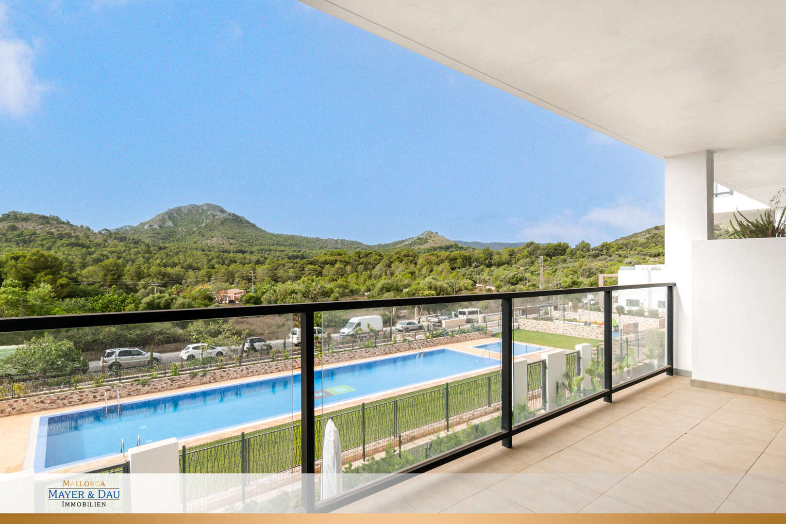 Die 106 m² konstruierte Fläche der Wohnung ist in der 1. Etage gelegen und beeindruckt durch ihren offenen, lichtdurchfluteten Wohn-/Essbereich, von dem aus man durch bodentiefe Fenster einen unglaublichen Blick auf die umliegenden Berge hat.