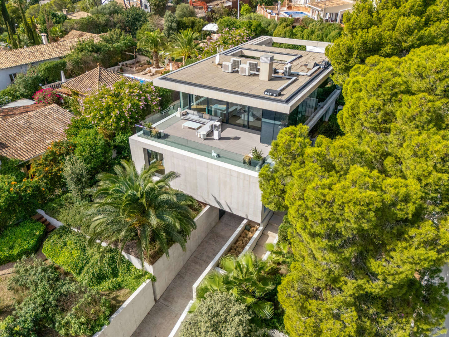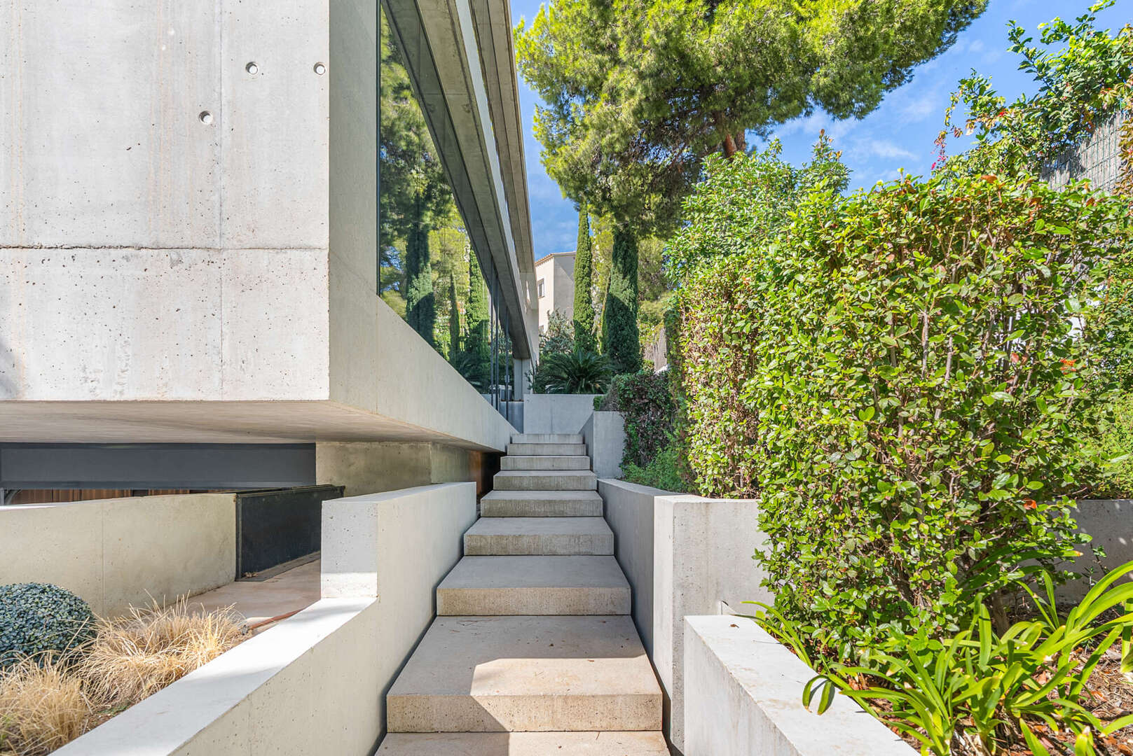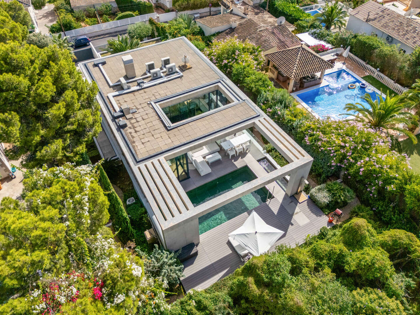 Im Freien entfaltet sich ein Lebensgefühl von mediterraner Leichtigkeit: Ein beheizbarer Pool mit Jacuzzi, weitläufige Terrassen und ein liebevoll angelegter Garten schaffen eine private Oase, in der Entspannung und Genuss mühelos ineinanderfließen. Ergänzt wird das Anwesen durch ein großzügiges Untergeschoss mit Garage für bis zu vier Fahrzeuge, weiterem Stauraum und einem zusätzlichen Badezimmer – ein diskreter Luxus, der das Gesamtbild vollendet.