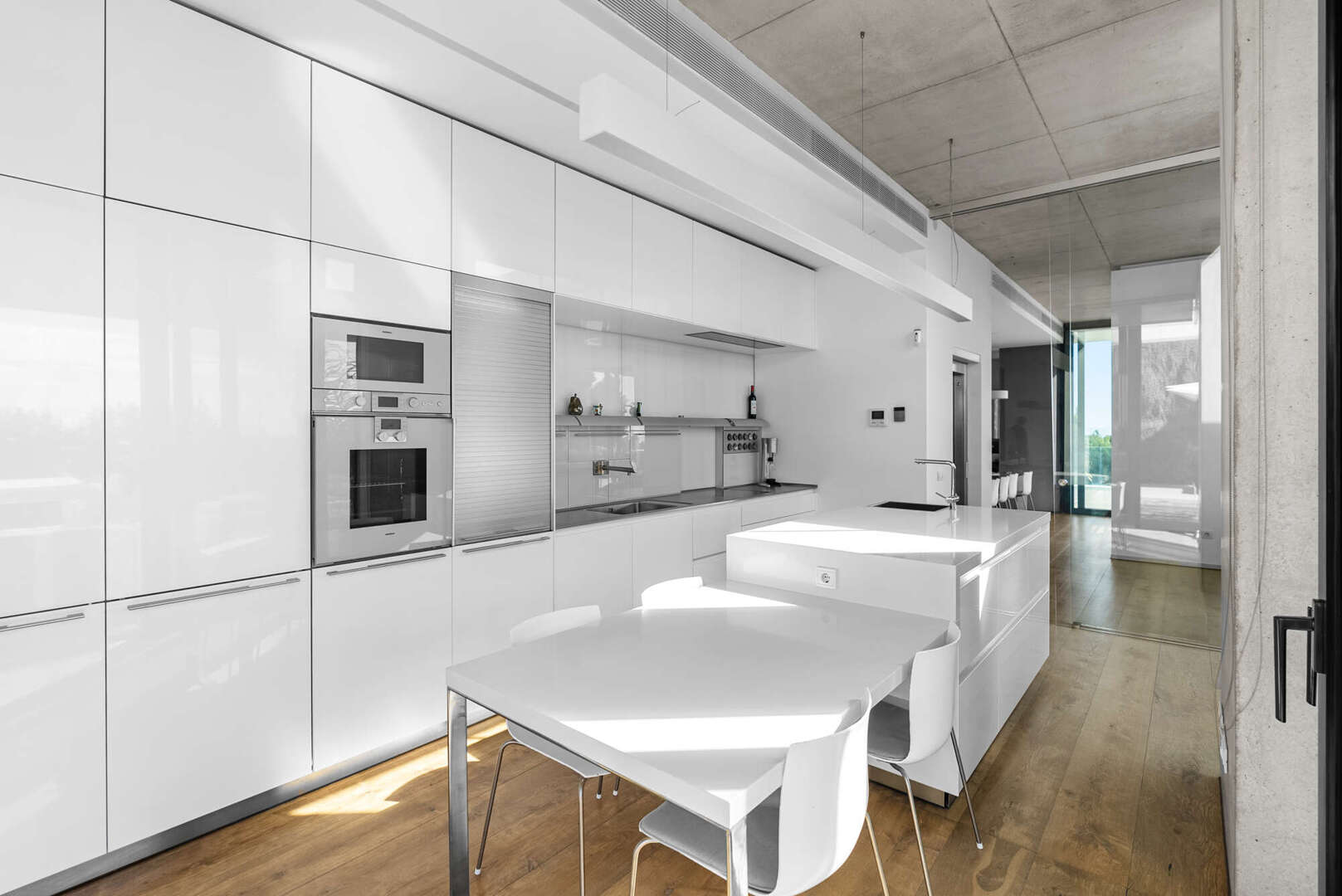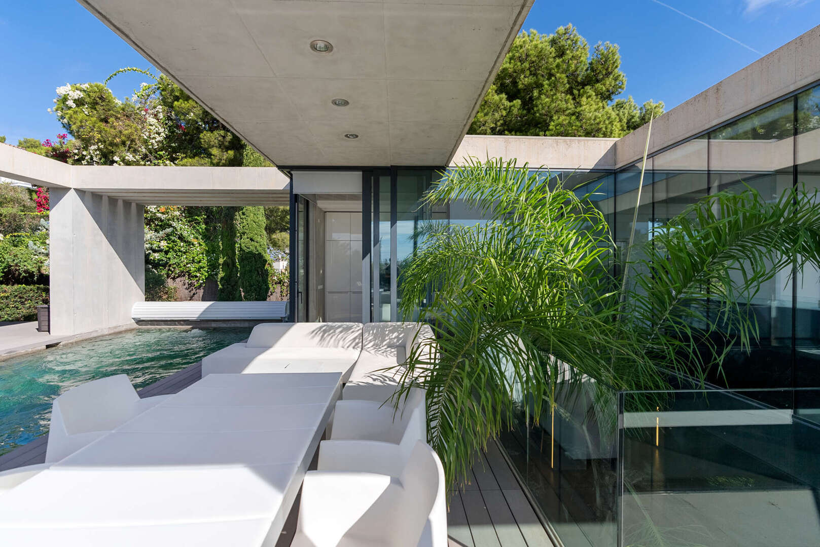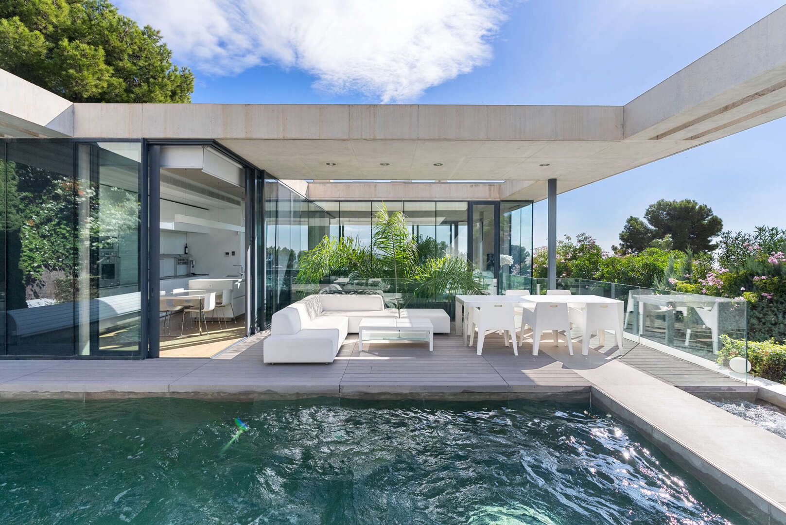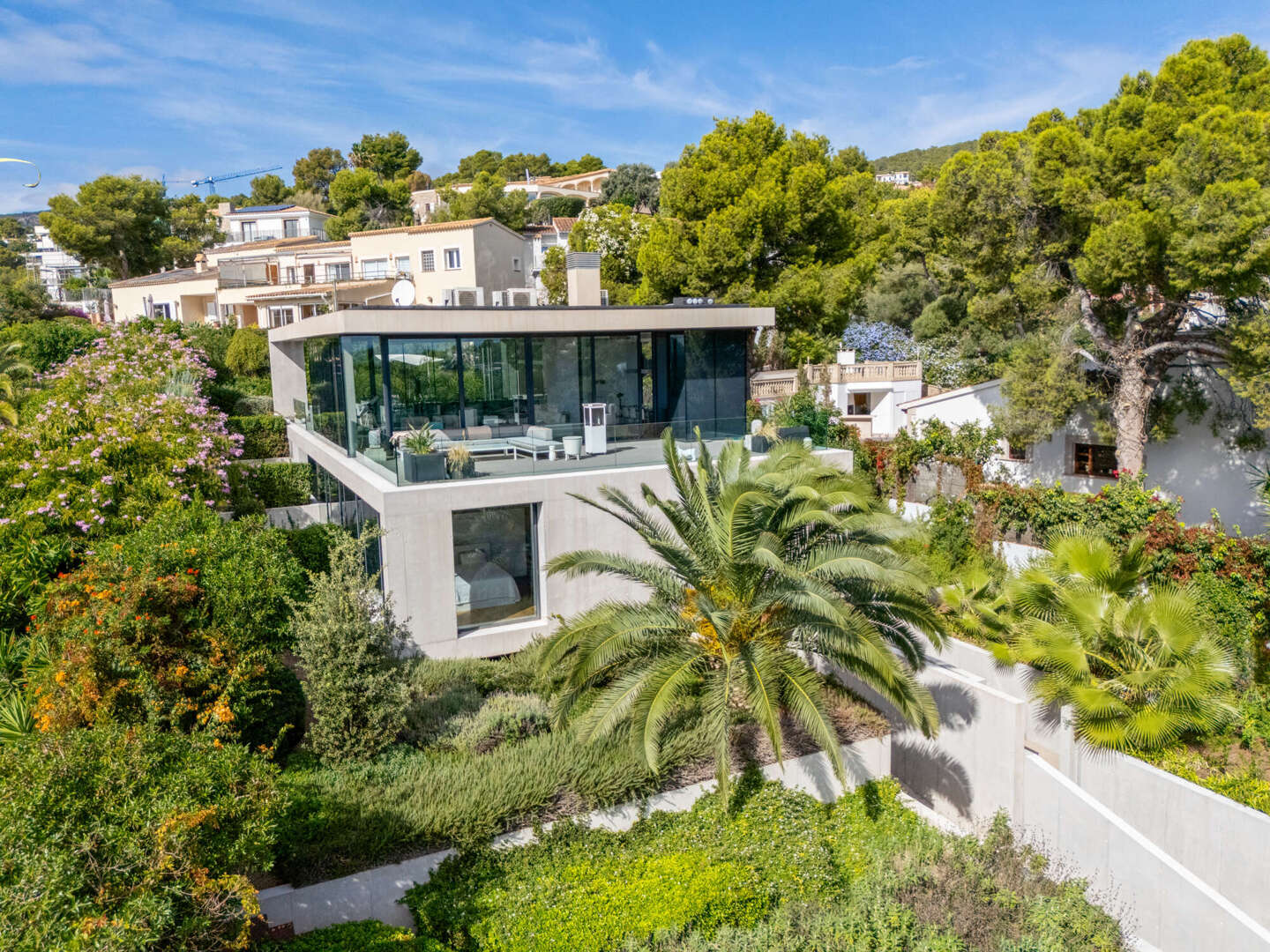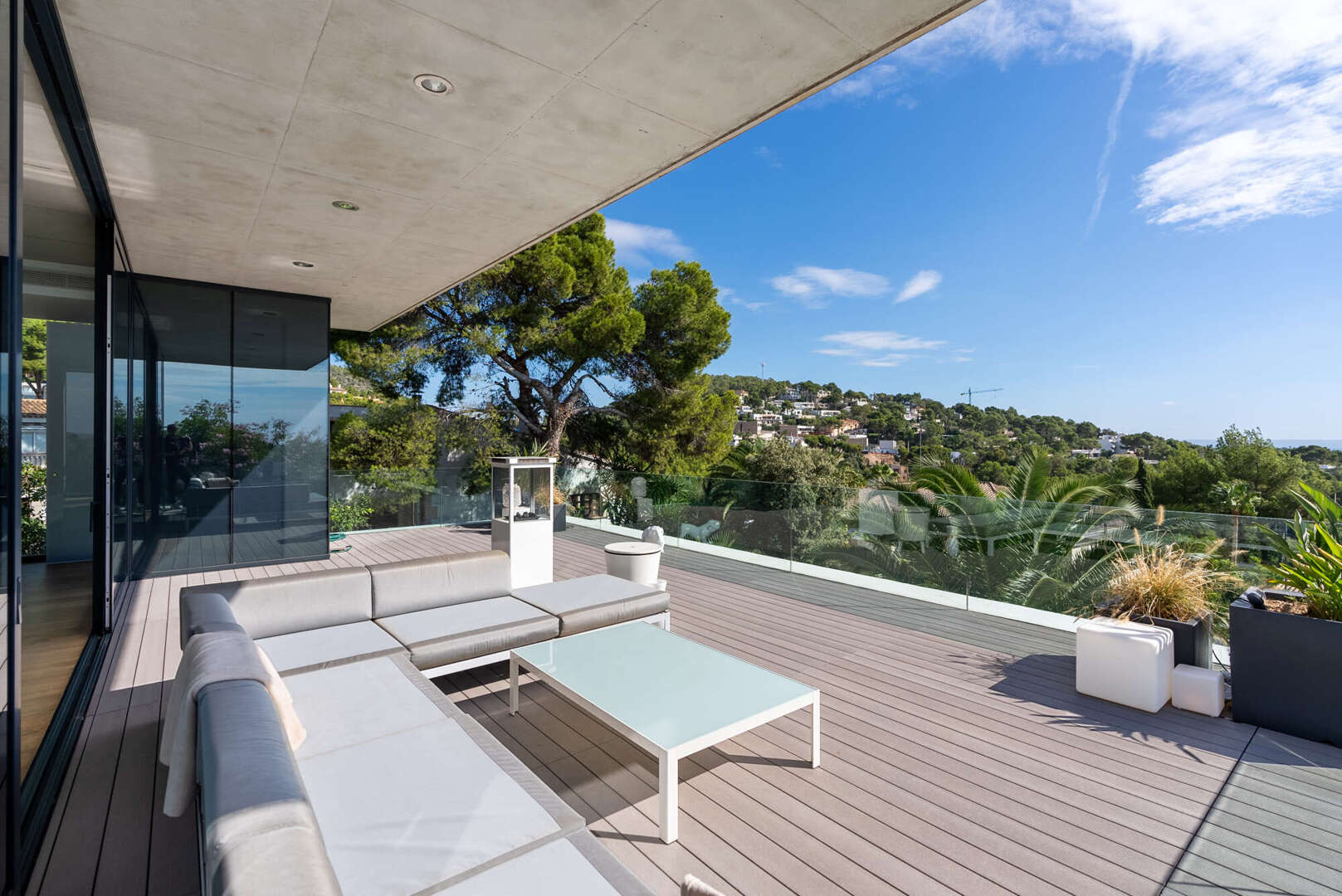 Das Herzstück der Villa bildet der obere Wohn- und Essbereich. Hier öffnet sich die Architektur über raumhohe Glasfronten zur glitzernden Weite des Mittelmeers.