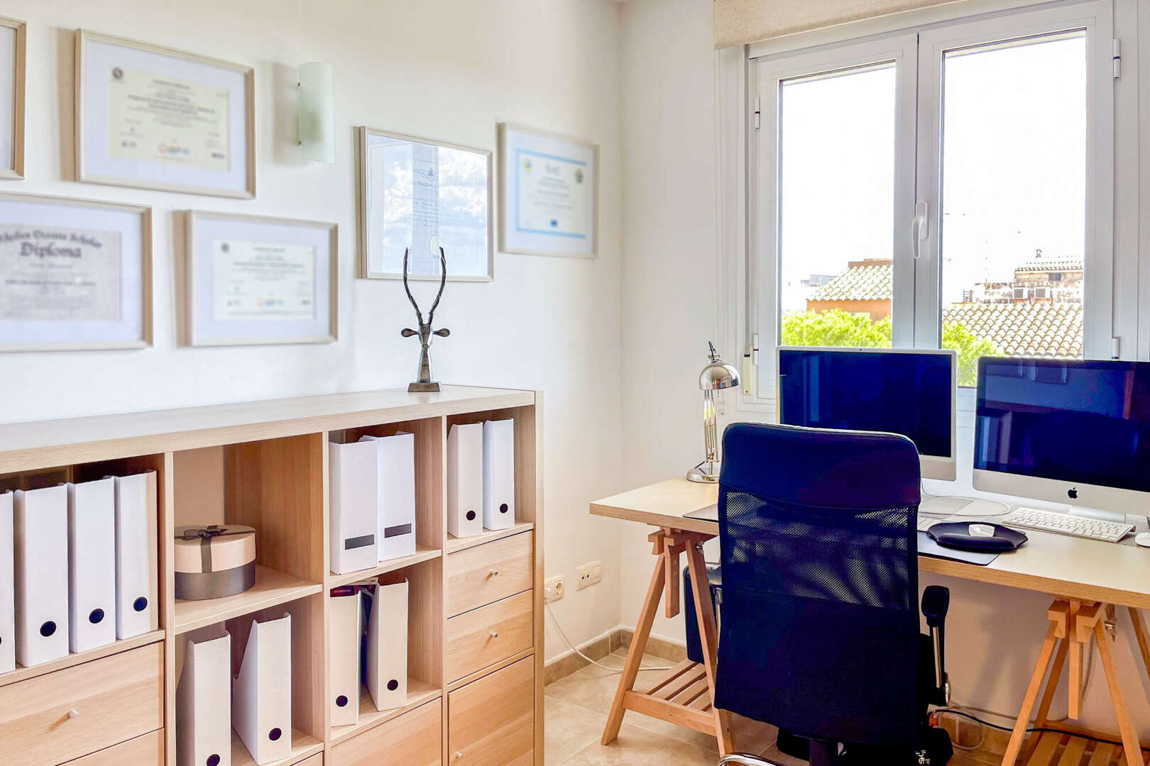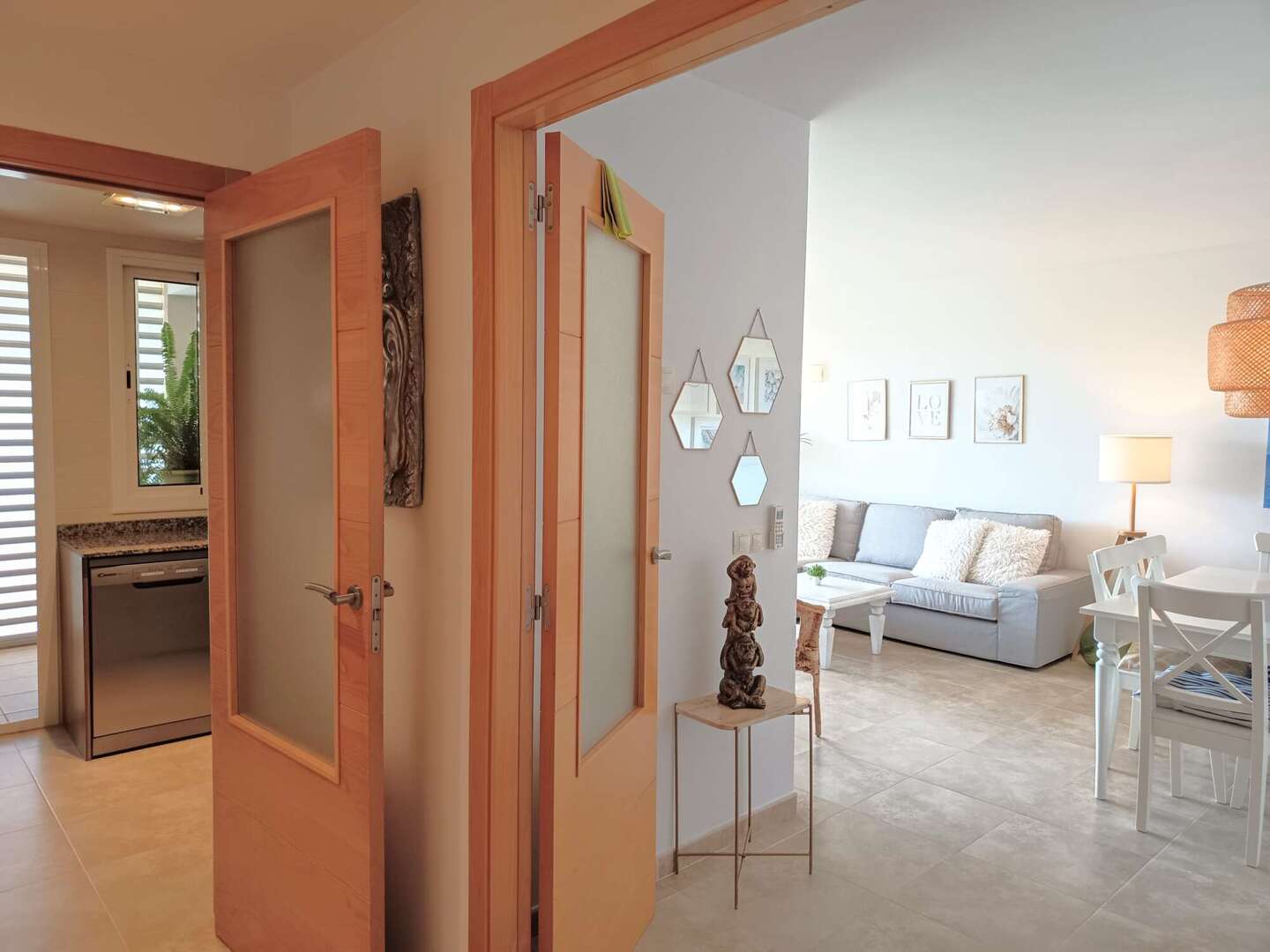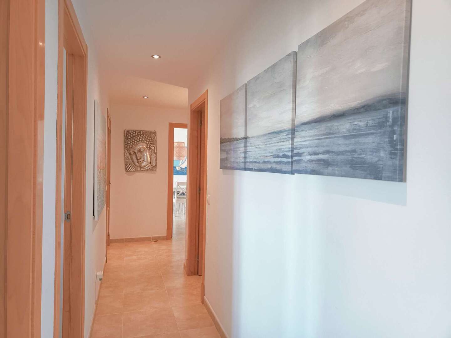 Vom hellen Flur aus erreichen Sie das moderne Gäste-Bad mit ebenerdiger Dusche, zwei weitere Schlafzimmer – eines davon wird derzeit als Büro genutzt – sowie das Hauptschlafzimmer mit Bad en suite und Whirlpool-Badewanne. Ein privater Balkon am Master-Bedroom lädt zu entspannten Morgenstunden mit Kaffee in der Sonne ein.